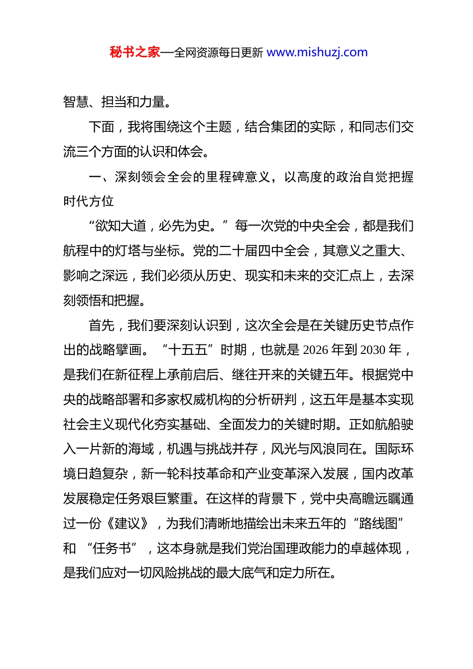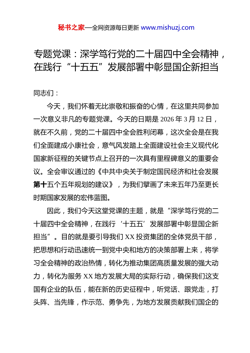 秘书之家—全网资源每日更新 www.mishuzj.com专题党课:深学笃行党的二十届四中全会精神,在践行“十五五”发展部署中彰显国企新担当 同志们:今天,我们怀着无比崇敬和振奋的心情,在这里共同参加一次意义非凡的专题党课。今天的日期是 2026 年 3 月 12 日,就在不久前,党的二十届四中全会胜利闭幕,这次全会是在我们全面建成小康社会,意气风发踏上全面建设社会主义现代化国家新征程的关键节点上召开的一次具有里程碑意义的重要会议。全会审议通过的《中共中央关于制定国民经济和社会发展第十五个五年规划的建议》,为我们擘画了未来五年乃至更长时期国家发展的宏伟蓝图。因此,我们今天这堂党课的主题,就是“深学笃行党的二十届四中全会精神,在践行‘十五五’发展部署中彰显国企新担当”。目的就是要引导我们 XX 投资集团的全体党员干部,把思想和行动迅速统一到党中央和地方的决策部署上来,将学习全会精神的政治热情,转化为推动集团高质量发展的强大动力,转化为服务 XX 地方发展大局的实际行动,确保我们这支国有企业的队伍,能在新的历史征程中,听党话、跟党走,打头阵、当先锋,作示范、勇争先,为地方发展贡献我们国企的秘书之家—全网资源每日更新 www.mishuzj.com智慧、担当和力量。下面,我将围绕这个主题,结合集团的实际,和同志们交流三个方面的认识和体会。一、深刻领会全会的里程碑意义,以高度的政治自觉把握时代方位“欲知大道,必先为史。”每一次党的中央全会,都是我们航程中的灯塔与坐标。党的二十届四中全会,其意义之重大、影响之深远,我们必须从历史、现实和未来的交汇点上,去深刻领悟和把握。首先,我们要深刻认识到,这次全会是在关键历史节点作出的战略擘画。“十五五”时期,也就是 2026 年到 2030 年,是我们在新征程上承前启后、继往开来的关键五年。根据党中央的战略部署和多家权威机构的分析研判,这五年是基本实现社会主义现代化夯实基础、全面发力的关键时期。正如航船驶入一片新的海域,机遇与挑战并存,风光与风浪同在。国际环境日趋复杂,新一轮科技革命和产业变革深入发展,国内改革发展稳定任务艰巨繁重。在这样的背景下,党中央高瞻远瞩通过一份《建议》,为我们清晰地描绘出未来五年的“路线图” 和 “任务书”,这本身就是我们党治国理政能力的卓越体现,是我们应对一切风险挑战的最大底气和定力所在。秘书之家—全网资源每日更新 www.mishuzj.com其次,我们要深刻领会到,全会提出的“六个坚持” 是引领未来发展的根本遵循。全会划定的“六个坚持” 发展遵循,是习近平新时代中国特色社会主义思想的最新成果,是我们推进中国式现代化的科学指引。这“六个坚持” 系统回答了新征程上“举什么旗、走什么路、以什么样的精神状态、朝着什么样的目标继续前进”等一系列根本性问题。一是坚持党的全面领导,这是定海神针,确保我们的事业始终沿着正确方向前进;二是坚持以人民为中心,这是价值原点,确保发展的成果最终惠及全体人民;三是坚持新发展理念,这是战略指引,引领我们走好高质量发展之路;四是坚持深化改革开放,这是动力源泉,不断解放和发展社会生产力;五是坚持系统观念,这是思想方法,要求我们统筹兼顾、协同推进各项事业;六是坚持发扬斗争精神,这是成事之要,激励我们敢于斗争、善于斗争,战胜前进道路上的一切艰难险阻。这“六个坚持”,为我们国有企业在复杂多变的环境中明晰发展方向、践行使命担当提供了根本指引。我们集团的每一秘书之家—全网资源每日更新 www.mishuzj.com项工作、每一个决策,都必须自觉对标对表,确保不偏向、不走样。最后,我们要深刻体悟到,全会为国有企业标定了新时代的历史坐标。全会强调,高质量发展是全面建设社会主义现代化国家的首要任务。而国有企业,作为中国特色社会主义的重要物质基础和政治基础,作为党执政兴国的重要支柱和依靠力量,无疑是推动高质量发展的主力军和排头兵。全会关于建设现代化产业体系、加快实现高水平科技自立自强、全面推进乡村振兴、促进区域协调发展等一系列重大部署,都为我们国有企业的发展开辟了广阔空间,也提出了更高...