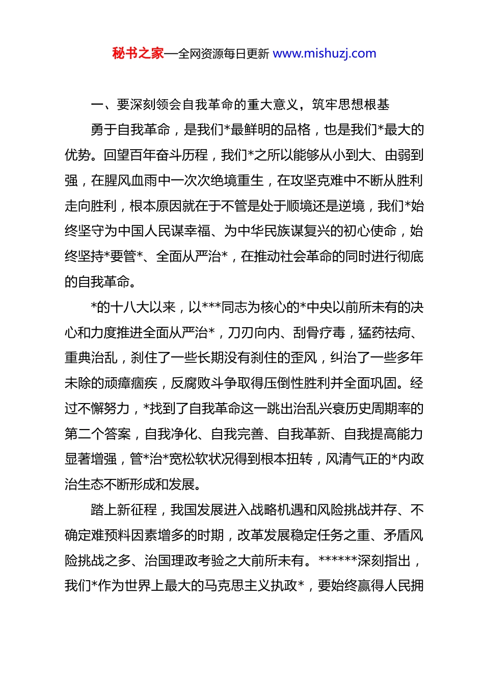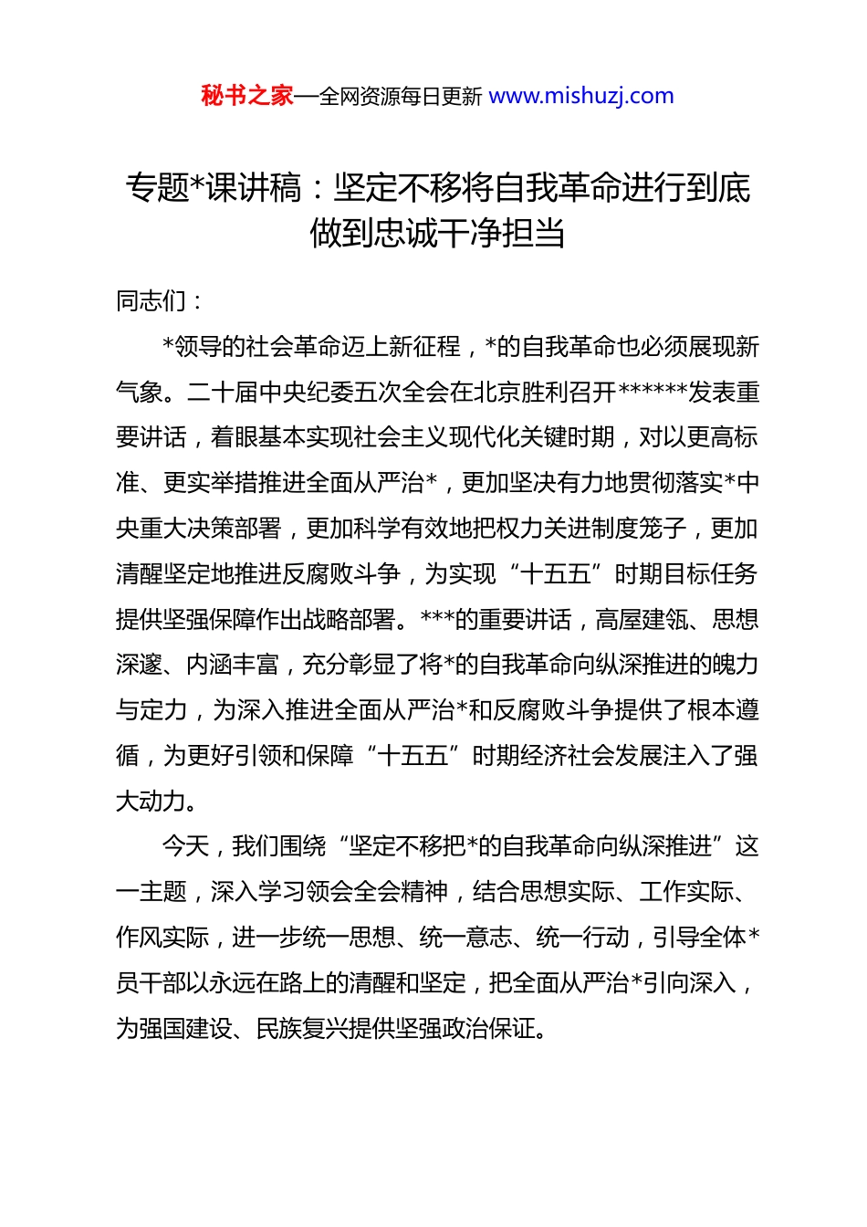 秘书之家—全网资源每日更新 www.mishuzj.com专题*课讲稿:坚定不移将自我革命进行到底做到忠诚干净担当同志们:*领导的社会革命迈上新征程,*的自我革命也必须展现新气象。二十届中央纪委五次全会在北京胜利召开******发表重要讲话,着眼基本实现社会主义现代化关键时期,对以更高标准、更实举措推进全面从严治*,更加坚决有力地贯彻落实*中央重大决策部署,更加科学有效地把权力关进制度笼子,更加清醒坚定地推进反腐败斗争,为实现“十五五”时期目标任务提供坚强保障作出战略部署。***的重要讲话,高屋建瓴、思想深邃、内涵丰富,充分彰显了将*的自我革命向纵深推进的魄力与定力,为深入推进全面从严治*和反腐败斗争提供了根本遵循,为更好引领和保障“十五五”时期经济社会发展注入了强大动力。今天,我们围绕“坚定不移把*的自我革命向纵深推进”这一主题,深入学习领会全会精神,结合思想实际、工作实际、作风实际,进一步统一思想、统一意志、统一行动,引导全体*员干部以永远在路上的清醒和坚定,把全面从严治*引向深入,为强国建设、民族复兴提供坚强政治保证。秘书之家—全网资源每日更新 www.mishuzj.com一、要深刻领会自我革命的重大意义,筑牢思想根基勇于自我革命,是我们*最鲜明的品格,也是我们*最大的优势。回望百年奋斗历程,我们*之所以能够从小到大、由弱到强,在腥风血雨中一次次绝境重生,在攻坚克难中不断从胜利走向胜利,根本原因就在于不管是处于顺境还是逆境,我们*始终坚守为中国人民谋幸福、为中华民族谋复兴的初心使命,始终坚持*要管*、全面从严治*,在推动社会革命的同时进行彻底的自我革命。*的十八大以来,以***同志为核心的*中央以前所未有的决心和力度推进全面从严治*,刀刃向内、刮骨疗毒,猛药祛疴、重典治乱,刹住了一些长期没有刹住的歪风,纠治了一些多年未除的顽瘴痼疾,反腐败斗争取得压倒性胜利并全面巩固。经过不懈努力,*找到了自我革命这一跳出治乱兴衰历史周期率的第二个答案,自我净化、自我完善、自我革新、自我提高能力显著增强,管*治*宽松软状况得到根本扭转,风清气正的*内政治生态不断形成和发展。踏上新征程,我国发展进入战略机遇和风险挑战并存、不确定难预料因素增多的时期,改革发展稳定任务之重、矛盾风险挑战之多、治国理政考验之大前所未有。******深刻指出,我们*作为世界上最大的马克思主义执政*,要始终赢得人民拥秘书之家—全网资源每日更新 www.mishuzj.com护、巩固长期执政地位,必须时刻保持解决大*独有难题的清醒和坚定。面对长期执政考验、改革开放考验、市场经济考验、外部环境考验,面对精神懈怠危险、能力不足危险、脱离群众危险、消极腐败危险,面对强国建设、民族复兴的时代重任,我们决不能有松劲歇脚、疲劳厌战的情绪,更不能有降调变调的错误期待。社会革命发展到哪一步,自我革命就要跟进到哪一步。只有坚定不移推进*的自我革命,不断清除一切损害*的先进性和纯洁性的因素,不断清除一切侵蚀*的健康肌体的病毒,才能确保*不变质、不变色、不变味,确保*在新时代坚持和发展中国特色社会主义的历史进程中始终成为坚强领导核心。二十届中央纪委五次全会,是在“十五五”规划即将启动、全面建设社会主义现代化国家进入关键阶段召开的一次重要会议。***的重要讲话,把*的自我革命摆在引领保障伟大社会革命的战略高度,把全面从严治*同实现“十五五”目标任务紧密结合,既是政治动员令,也是行动任务书,充分体现了*中央对*的建设规律、执政规律、强国建设规律的深刻把握,为我们在新征程上纵深推进自我革命、全面从严治*指明了前进方向、提供了根本遵循。二、要准确把握全会核心要义,明确自我革命实践方向秘书之家—全网资源每日更新 www.mishuzj.com学习贯彻全会精神,推进自我革命向纵深发展,必须深刻领会、准确把握******重要讲话的核心要义和实践要求,自觉对标对表、狠抓落地见效。(一)要牢牢把握“更高标准、更实举措”的总要求全会明确提出,要以更高标准、更实举措推进全面从严治*。更高标准,就是政治标准要更高、*性要求要更严、纪律约束要更硬、作风锤炼要更实;更实举措,就是靶...