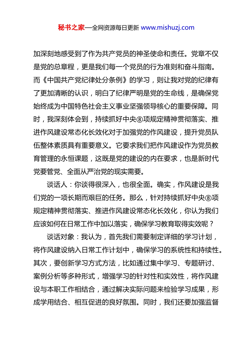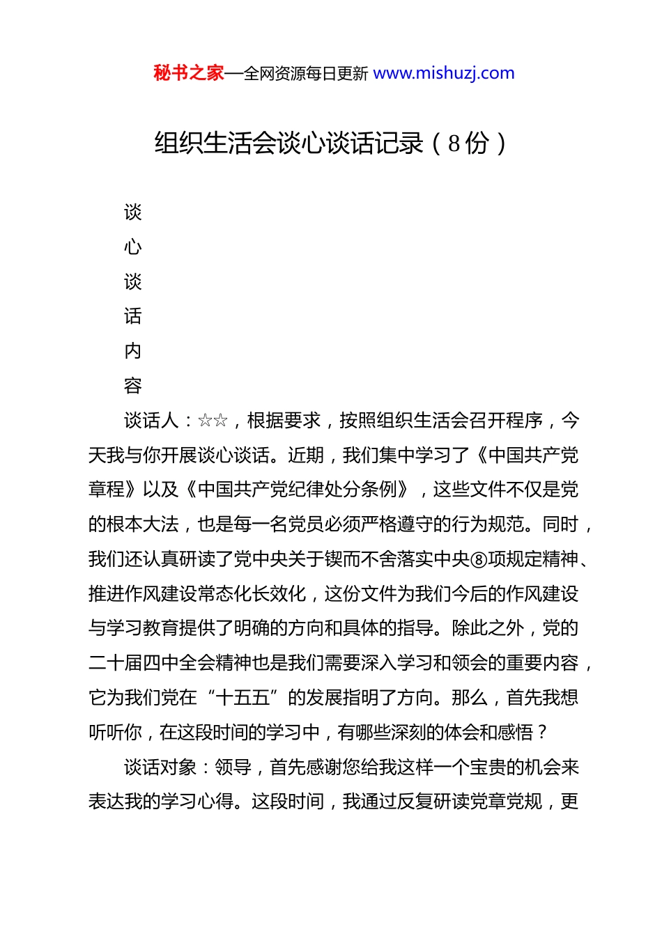 秘书之家—全网资源每日更新 www.mishuzj.com组织生活会谈心谈话记录(8 份)谈心谈话内容谈话人:☆☆,根据要求,按照组织生活会召开程序,今天我与你开展谈心谈话。近期,我们集中学习了《中国共产党章程》以及《中国共产党纪律处分条例》,这些文件不仅是党的根本大法,也是每一名党员必须严格遵守的行为规范。同时,我们还认真研读了党中央关于锲而不舍落实中央⑧项规定精神、推进作风建设常态化长效化,这份文件为我们今后的作风建设与学习教育提供了明确的方向和具体的指导。除此之外,党的二十届四中全会精神也是我们需要深入学习和领会的重要内容,它为我们党在“十五五”的发展指明了方向。那么,首先我想听听你,在这段时间的学习中,有哪些深刻的体会和感悟?谈话对象:领导,首先感谢您给我这样一个宝贵的机会来表达我的学习心得。这段时间,我通过反复研读党章党规,更秘书之家—全网资源每日更新 www.mishuzj.com加深刻地感受到了作为共产党员的神圣使命和责任。党章不仅是党的总章程,更是我们每一个党员的行为准则和奋斗指南。而《中国共产党纪律处分条例》的学习,则让我对党的纪律有了更加清晰的认识,明白了纪律严明是党的生命线,是确保党始终成为中国特色社会主义事业坚强领导核心的重要保障。同时,我深刻体会到,持续抓好中央⑧项规定精神贯彻落实、推进作风建设常态化长效化对于加强党的作风建设,提升党员队伍整体素质具有重要意义。它要求我们把作风建设作为党员教育管理的永恒课题,这既是党的建设的内在要求,也是新时代党要管党、全面从严治党的现实需要。谈话人:你谈得很深入,也很全面。确实,作风建设是我们党的一项长期而艰巨的任务。那么,针对持续抓好中央⑧项规定精神贯彻落实、推进作风建设常态化长效化,你认为我们应该如何在日常工作中加以落实,确保学习教育取得实效呢?谈话对象:我认为,首先我们需要制定详细的学习计划,将作风建设纳入日常工作计划中,确保学习的系统性和持续性。其次,要创新学习方式方法,比如通过集中学习、专题研讨、案例分析等多种形式,增强学习的针对性和实效性,将作风建设与本职工作相结合,通过解决实际问题来检验学习成果,形成学用结合、相互促进的良好氛围。同时,我们还要加强监督秘书之家—全网资源每日更新 www.mishuzj.com检查,确保学习教育不走过场,加强对招标采购等重点领域和关键环节的监督,确保各项工作依法依规进行。此外,我认为我们还要关注国内外政治形势和本行业的政策动态,加强对意识形态领域的分析研判,及时发现和处置可能影响单位稳定和发展的政治风险。谈话人:你的建议非常中肯,也体现了我们工作的特点和要求。党的二十届四中全会、二十届中央纪委五次全会精神也强调了全面从严治党的重要性,提出了许多新的要求和措施。作为党务工作者,你认为我们应该如何在实际工作中贯彻落实这些精神,特别是在加强作风建设、提升工作效率和服务质量方面?谈话对象:领导,我认为我们应该从以下几个方面入手。一是加强作风建设,严格遵守党的政治纪律和政治规矩,做到令行禁止,确保党的路线方针政策和决策部署得到全面贯彻落实。二是提高工作效率,优化工作流程,减少不必要的环节和程序,提高工作效率和质量。三是提升服务质量,坚持服务大局、服务群众的原则,积极为职工和患者提供优质服务,解决实际问题。同时,我们还要加强与其他部门的沟通和协作,形成工作合力,共同推动各项工作取得更好的成绩。谈话人:你的回答很全面,也体现了我们工作的实际需求秘书之家—全网资源每日更新 www.mishuzj.com和目标。作为分管领导,我希望你能够继续发挥模范带头作用,带领办公室全体人员共同学习、共同进步。同时,也要加强与其他部门的沟通和协作,形成合力,推动各项工作取得更好的成绩。在今后的工作中,如果遇到任何困难和问题,都可以随时来找我沟通解决。谈话对象:谢谢您的鼓励和信任。我一定会按照您的要求继续努力工作,不断提高自己的能力和水平。同时,我也会积极向同事们传达您的指示和要求,共同为“十五五”事业高质量发展贡献自己的力量。组织生活会谈心谈话记录表(2)...