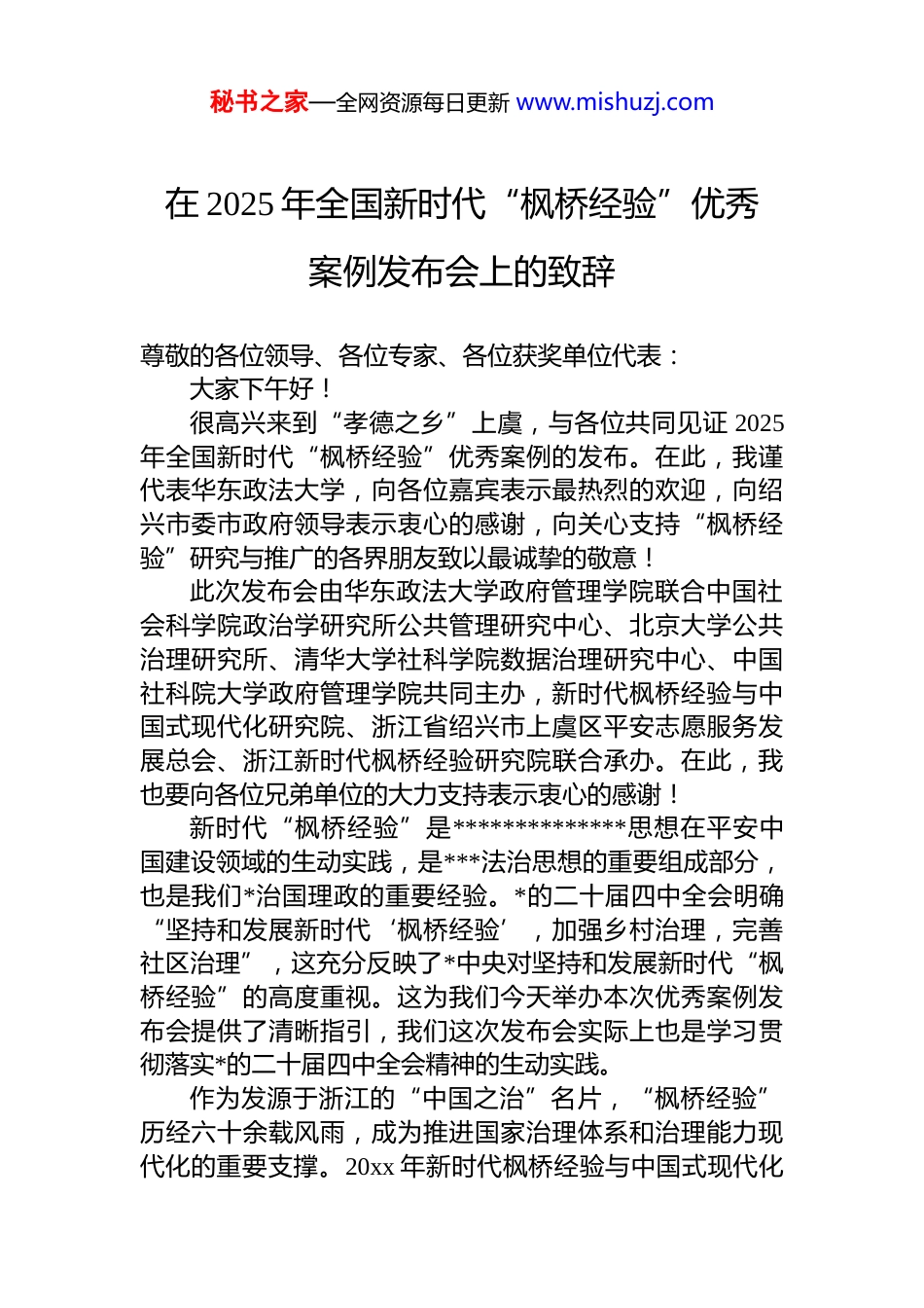 秘书之家—全网资源每日更新 www.mishuzj.com在 2025 年全国新时代“枫桥经验”优秀案例发布会上的致辞尊敬的各位领导、各位专家、各位获奖单位代表:大家下午好!很高兴来到“孝德之乡”上虞,与各位共同见证 2025年全国新时代“枫桥经验”优秀案例的发布。在此,我谨代表华东政法大学,向各位嘉宾表示最热烈的欢迎,向绍兴市委市政府领导表示衷心的感谢,向关心支持“枫桥经验”研究与推广的各界朋友致以最诚挚的敬意!此次发布会由华东政法大学政府管理学院联合中国社会科学院政治学研究所公共管理研究中心、北京大学公共治理研究所、清华大学社科学院数据治理研究中心、中国社科院大学政府管理学院共同主办,新时代枫桥经验与中国式现代化研究院、浙江省绍兴市上虞区平安志愿服务发展总会、浙江新时代枫桥经验研究院联合承办。在此,我也要向各位兄弟单位的大力支持表示衷心的感谢!新时代“枫桥经验”是**************思想在平安中国建设领域的生动实践,是***法治思想的重要组成部分,也是我们*治国理政的重要经验。*的二十届四中全会明确“坚持和发展新时代‘枫桥经验’,加强乡村治理,完善社区治理”,这充分反映了*中央对坚持和发展新时代“枫桥经验”的高度重视。这为我们今天举办本次优秀案例发布会提供了清晰指引,我们这次发布会实际上也是学习贯彻落实*的二十届四中全会精神的生动实践。作为发源于浙江的“中国之治”名片,“枫桥经验”历经六十余载风雨,成为推进国家治理体系和治理能力现代化的重要支撑。20xx 年新时代枫桥经验与中国式现代化秘书之家—全网资源每日更新 www.mishuzj.com研究院成立,以建设国内外一流“理论高地、实践高地、人才高地、传播高地”,推动“枫桥经验”理论实践转化为建设目标:建成湖州分院,积极筹建浦东分院;举办年度全国新时代“枫桥经验”优秀案例征集活动。研究院始终坚持“一线问题就是前沿问题,实践提出的问题就是理论研究的责任,只有坚持实践导向、服务导向,理论研究才能更好地体现贡献价值。”三年来,在社会各方力量的大力支持下,先后分别在北京、上海、龙岩古田、湖州安吉、扬州高邮举行了案例征集的启动和发布活动,带动了全国各地基层单位更好坚持和发展新时代“枫桥经验”,并以此为平台全方位展示坚持和发展新时代“枫桥经验”的优秀实践成果,充分发挥典型案例的示范引领作用,有力推动了新时代“枫桥经验”在全国范围内的探索实践。今年优秀案例征集活动自启动以来,得到全国各地*政机关与社会各界的广泛响应和高度关注,评选出 100 个优秀案例、8 个优秀组织奖。作为主办方,我们对获奖的优秀案例和组织单位表达敬意的同时,更希望能够更深入总结“接地气、有温度、可复制”的基层治理智慧,更好发挥示范引领作用,进一步推动将“预防在前、调解优先、运用法治、就地解决”落到实处,为推进强国建设贡献力量!推进以实践为导向的人才培养机制改革,是法学院校深入学习贯彻***法治思想的重要举措。根据上海市委市政府的部署,华政作为高校全面深化综合改革试点单位,围绕“重服务强贡献”,对接全面依法治国需求,聚焦涉外法治服务、法治政府建设服务、城市治理服务行业,培养高层次、实践型法治和社会治理人才。我们将推动“枫桥经验”深度融入社会治理人才培养全链条、理论研究新视角、基层服务新场景。为此我们诚挚邀请获奖单位推荐资深专家进校园、进课堂,共研人才培养方案、共建实务课程和案例库;同时拓展“校地协同”实习实践基地,一起组织学生进基层、进社区,在矛盾调解、平安巡防、法治秘书之家—全网资源每日更新 www.mishuzj.com宣传中淬炼本领,培养一批能扎根基层、善用法治、善解难题的“实战型”人才。再次感谢各位领导、专家对本次发布会的支持,祝愿新时代“枫桥经验”在全国范围内绽放更绚丽的光彩!祝各位身体健康、工作顺利、万事如意!谢谢!