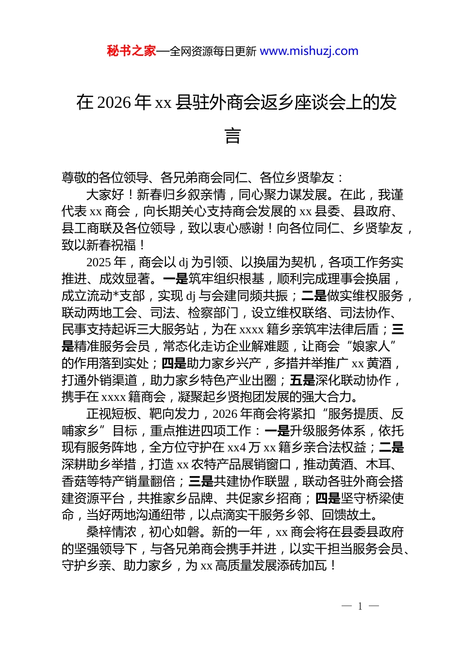秘书之家—全网资源每日更新 www.mishuzj.com在 2026 年 xx 县驻外商会返乡座谈会上的发言尊敬的各位领导、各兄弟商会同仁、各位乡贤挚友:大家好!新春归乡叙亲情,同心聚力谋发展。在此,我谨代表 xx 商会,向长期关心支持商会发展的 xx 县委、县政府、县工商联及各位领导,致以衷心感谢!向各位同仁、乡贤挚友,致以新春祝福!2025 年,商会以 dj 为引领、以换届为契机,各项工作务实推进、成效显著。一是筑牢组织根基,顺利完成理事会换届,成立流动*支部,实现 dj 与会建同频共振;二是做实维权服务,联动两地工会、司法、检察部门,设立维权联络、司法协作、民事支持起诉三大服务站,为在 xxxx 籍乡亲筑牢法律后盾;三是精准服务会员,常态化走访企业解难题,让商会“娘家人”的作用落到实处;四是助力家乡兴产,多措并举推广 xx 黄酒,打通外销渠道,助力家乡特色产业出圈;五是深化联动协作,携手在 xxxx 籍商会,凝聚起乡贤抱团发展的强大合力。正视短板、靶向发力,2026 年商会将紧扣“服务提质、反哺家乡”目标,重点推进四项工作:一是升级服务体系,依托现有服务阵地,全方位守护在 xx4 万 xx 籍乡亲合法权益;二是深耕助乡举措,打造 xx 农特产品展销窗口,推动黄酒、木耳、香菇等特产销量翻倍;三是共建协作联盟,联动各驻外商会搭建资源平台,共推家乡品牌、共促家乡招商;四是坚守桥梁使命,当好两地沟通纽带,以点滴实干服务乡邻、回馈故土。桑梓情浓,初心如磐。新的一年,xx 商会将在县委县政府的坚强领导下,与各兄弟商会携手并进,以实干担当服务会员、守护乡亲、助力家乡,为 xx 高质量发展添砖加瓦!— 1 —秘书之家—全网资源每日更新 www.mishuzj.com最后,祝各位马年吉祥、阖家安康、事业兴旺!祝家乡 xx蒸蒸日上、前程似锦!谢谢大家!— 2 —