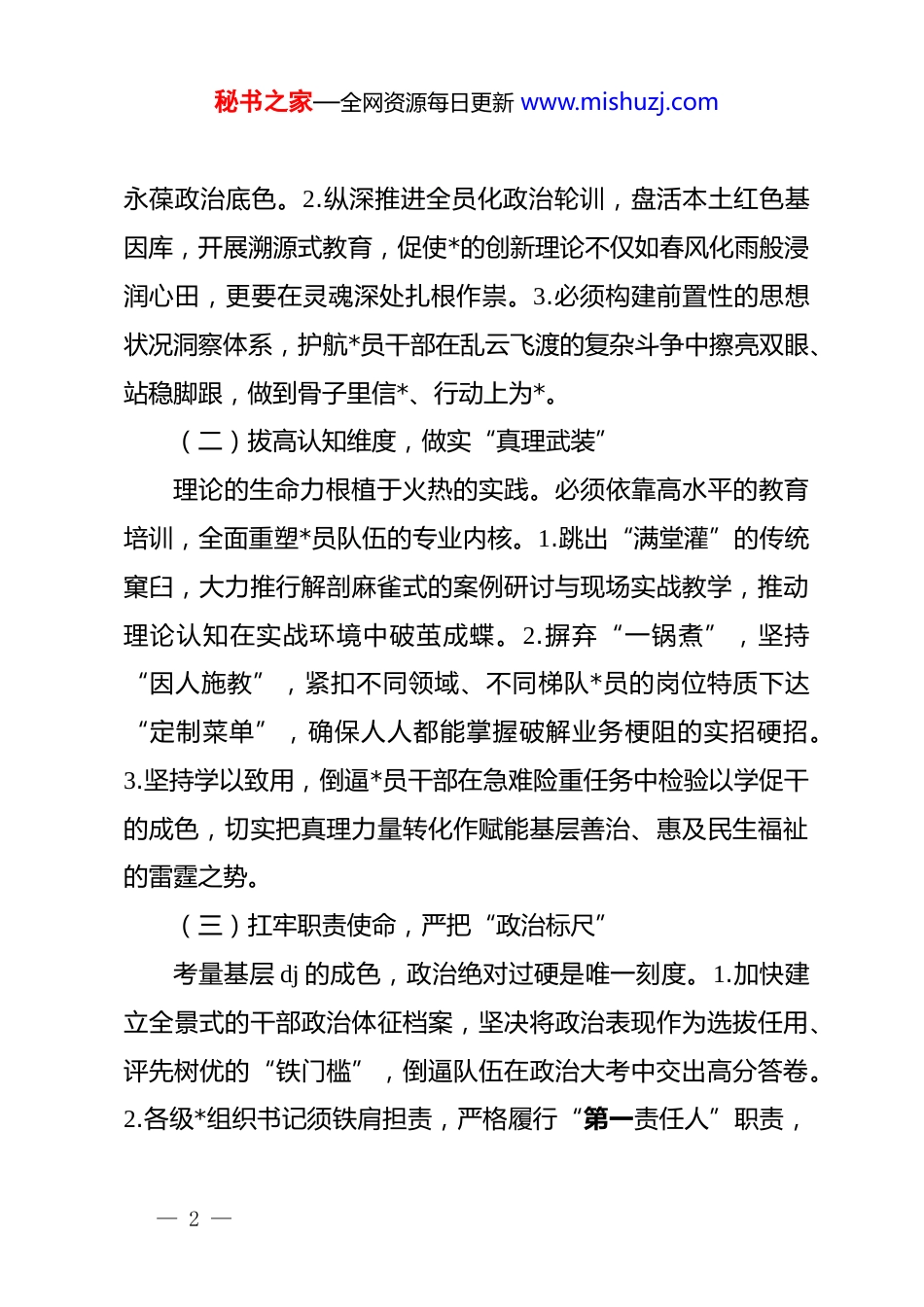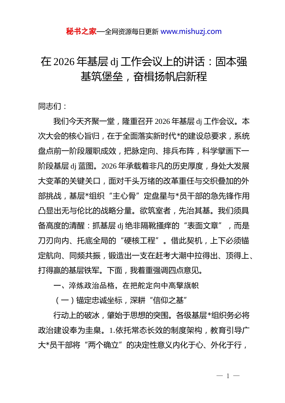 秘书之家—全网资源每日更新 www.mishuzj.com在 2026 年基层 dj 工作会议上的讲话:固本强基筑堡垒,奋楫扬帆启新程同志们:我们今天齐聚一堂,隆重召开 2026 年基层 dj 工作会议。本次大会的核心旨归,在于全面落实新时代*的建设总要求,系统盘点前一阶段履职成效,把脉定向、排兵布阵,科学擘画下一阶段基层 dj 蓝图。2026 年承载着非凡的历史厚度,身处大发展大变革的关键关口,面对千头万绪的改革重任与交织叠加的外部挑战,基层*组织“主心骨”定盘星与*员干部的急先锋作用凸显出无与伦比的战略分量。欲筑室者,先治其基。我们须具备高度的清醒:抓基层 dj 绝非隔靴搔痒的“表面文章”,而是刀刃向内、托底全局的“硬核工程”。借此契机,上下必须锚定航向、同频共振,锻造出一支在赶考大潮中拉得出、顶得上、打得赢的基层铁军。下面,我着重强调四点意见。一、淬炼政治品格,在把舵定向中高擎旗帜(一)锚定忠诚坐标,深耕“信仰之基”行动上的破冰,肇始于思想的突围。各级基层*组织务必将政治建设奉为圭臬。1.依托常态长效的制度架构,教育引导广大*员干部将“两个确立”的决定性意义内化于心、外化于行,— 1 —秘书之家—全网资源每日更新 www.mishuzj.com永葆政治底色。2.纵深推进全员化政治轮训,盘活本土红色基因库,开展溯源式教育,促使*的创新理论不仅如春风化雨般浸润心田,更要在灵魂深处扎根作祟。3.必须构建前置性的思想状况洞察体系,护航*员干部在乱云飞渡的复杂斗争中擦亮双眼、站稳脚跟,做到骨子里信*、行动上为*。(二)拔高认知维度,做实“真理武装”理论的生命力根植于火热的实践。必须依靠高水平的教育培训,全面重塑*员队伍的专业内核。1.跳出“满堂灌”的传统窠臼,大力推行解剖麻雀式的案例研讨与现场实战教学,推动理论认知在实战环境中破茧成蝶。2.摒弃“一锅煮”,坚持“因人施教”,紧扣不同领域、不同梯队*员的岗位特质下达“定制菜单”,确保人人都能掌握破解业务梗阻的实招硬招。3.坚持学以致用,倒逼*员干部在急难险重任务中检验以学促干的成色,切实把真理力量转化作赋能基层善治、惠及民生福祉的雷霆之势。(三)扛牢职责使命,严把“政治标尺”考量基层 dj 的成色,政治绝对过硬是唯一刻度。1.加快建立全景式的干部政治体征档案,坚决将政治表现作为选拔任用、评先树优的“铁门槛”,倒逼队伍在政治大考中交出高分答卷。2.各级*组织书记须铁肩担责,严格履行“第一责任人”职责,— 2 —秘书之家—全网资源每日更新 www.mishuzj.com对核心业务亲自挂帅、棘手难题亲自过问,确保压力传导直达神经末梢。3.织密基层 dj 的督查网络,常态化开展“政治巡诊”与“未病先防”,精准纠治苗头性偏差,保障*的路线方针政策在基层末梢畅通无阻、掷地有声。二、塑强组织肌体,在强基固本中筑牢阵地(一)重塑架构布局,织密“组织大网”阵地全覆盖是发挥*组织凝聚力的先决条件。要主动顺应经济社会结构蝶变,动态优化组织版图。1.做到“不留死角”,瞄准产业链条、重点工程及新业态领域火速建制,确保发展脉搏跳动到哪里,*旗就挺立在哪里。2.抓实*支部标准化、规范化进阶工程,推行星级化动态管理,对后进软弱*组织实施“靶向治疗”与整顿清零,加速推动 dj 工作由“有形覆盖”向“有效覆盖”跨越。3.深化区域统筹联动机制,破除行政隶属壁垒,牵引机关、企事业单位与属地社区结对破题,搭建起纵横贯通的立体化组织矩阵。(二)培植中坚力量,淬炼“先锋矩阵”*员方阵的战斗力指标,从根本上决定了基层堡垒的坚固程度。1.前移关口、严控“源头水”,将目光聚焦于优秀青年、业务骨干与一线产业工人,持续为*组织输送新鲜血液,优化队伍梯队质态。2.拧紧日常教育管理的“发条”,全面铺开*员量— 3 —秘书之家—全网资源每日更新 www.mishuzj.com化积分考核体系,树立起奖优罚劣的鲜明路标,激发后进赶超动力。3.倾注真情实感关爱基层一线群体,严格落实交心谈话机制,以组织的温度化解他们工作生活中的痛点难点,全面唤醒其先锋意识与归属认同,锤炼出能打硬仗的钢铁之师。(三)激活源头活水,打造“dj 名片”基层...