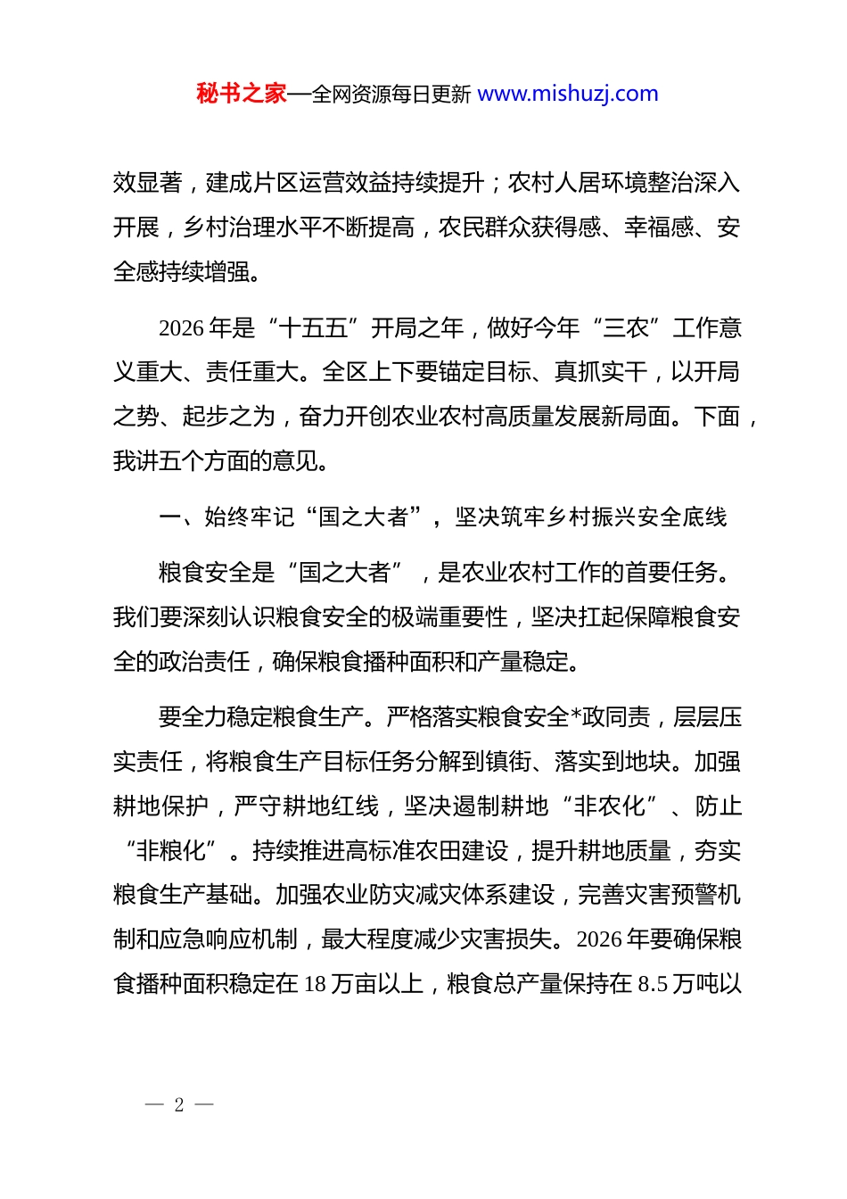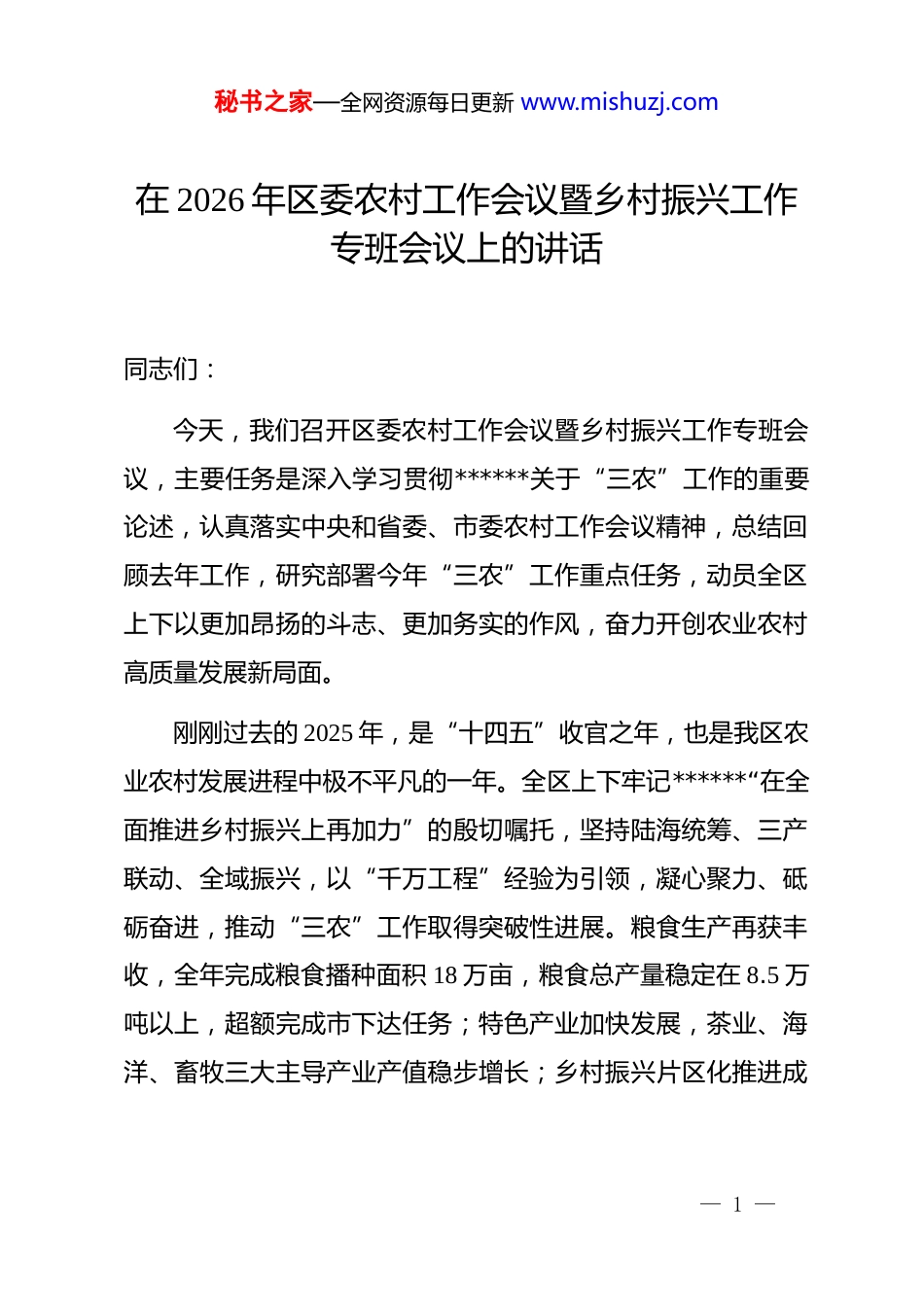 秘书之家—全网资源每日更新 www.mishuzj.com在 2026 年区委农村工作会议暨乡村振兴工作专班会议上的讲话同志们:今天,我们召开区委农村工作会议暨乡村振兴工作专班会议,主要任务是深入学习贯彻******关于“三农”工作的重要论述,认真落实中央和省委、市委农村工作会议精神,总结回顾去年工作,研究部署今年“三农”工作重点任务,动员全区上下以更加昂扬的斗志、更加务实的作风,奋力开创农业农村高质量发展新局面。刚刚过去的 2025 年,是“十四五”收官之年,也是我区农业农村发展进程中极不平凡的一年。全区上下牢记******“在全面推进乡村振兴上再加力”的殷切嘱托,坚持陆海统筹、三产联动、全域振兴,以“千万工程”经验为引领,凝心聚力、砥砺奋进,推动“三农”工作取得突破性进展。粮食生产再获丰收,全年完成粮食播种面积 18 万亩,粮食总产量稳定在 8.5 万吨以上,超额完成市下达任务;特色产业加快发展,茶业、海洋、畜牧三大主导产业产值稳步增长;乡村振兴片区化推进成— 1 —秘书之家—全网资源每日更新 www.mishuzj.com效显著,建成片区运营效益持续提升;农村人居环境整治深入开展,乡村治理水平不断提高,农民群众获得感、幸福感、安全感持续增强。2026 年是“十五五”开局之年,做好今年“三农”工作意义重大、责任重大。全区上下要锚定目标、真抓实干,以开局之势、起步之为,奋力开创农业农村高质量发展新局面。下面,我讲五个方面的意见。一、始终牢记“国之大者”,坚决筑牢乡村振兴安全底线粮食安全是“国之大者”,是农业农村工作的首要任务。我们要深刻认识粮食安全的极端重要性,坚决扛起保障粮食安全的政治责任,确保粮食播种面积和产量稳定。要全力稳定粮食生产。严格落实粮食安全*政同责,层层压实责任,将粮食生产目标任务分解到镇街、落实到地块。加强耕地保护,严守耕地红线,坚决遏制耕地“非农化”、防止“非粮化”。持续推进高标准农田建设,提升耕地质量,夯实粮食生产基础。加强农业防灾减灾体系建设,完善灾害预警机制和应急响应机制,最大程度减少灾害损失。2026 年要确保粮食播种面积稳定在 18 万亩以上,粮食总产量保持在 8.5 万吨以— 2 —秘书之家—全网资源每日更新 www.mishuzj.com上。要构建农业综合服务体系。坚持把农业综合服务体系建设作为保障粮食安全、促进农业现代化的重要支撑。科学规划、合理布局农业综合服务中心,明确服务范围和服务功能,整合现有资源,形成覆盖产前、产中、产后的全链条服务网络。鼓励多元主体参与建设,支持农民合作社、农村集体经济组织、社会投资主体等参与农业综合服务中心建设运营。提供配方施肥、统防统治、农机作业、农民培训等专业化服务,提升农业社会化服务水平。加大财政投入力度,统筹用好涉农政策资金,设立农业综合服务体系建设专项资金,通过财政资金撬动社会资本投入。2026 年要完成*个镇级农业综合服务中心标准化建设,实现农业社会化服务覆盖率提升*个百分点。要巩固拓展脱贫攻坚成果。严格落实“四个不摘”要求,保持主要帮扶政策总体稳定。健全防止返贫动态监测和帮扶机制,对易返贫致贫人口快速发现、及时帮扶。加强产业帮扶和就业帮扶,落实“一户一策”精准帮扶措施,确保脱贫人口稳定增收。持续做好易地搬迁后续扶持工作,完善安置区基础设施和公共服务设施,确保搬迁群众稳得住、有就业、能致富。加强扶贫项目资产管理,确保资产持续发挥效益。2026 年要实— 3 —秘书之家—全网资源每日更新 www.mishuzj.com现脱贫人口人均纯收入增长*%以上,牢牢守住不发生规模性返贫底线。二、做强做优主导产业,全力激活富民强村澎湃动能产业振兴是乡村振兴的重中之重。我们要立足资源禀赋和产业基础,做强茶业、海洋、畜牧等主导产业,做优镇街特色农业,做活农文旅产业,加快构建现代农业产业体系。要做强茶业产业。坚持把茶业作为富民强区的支柱产业来培育,深入推进茶业高质量发展行动。加强茶园标准化建设,推广优质茶树品种,提升茶园管理水平。推进茶叶精深加工,延长产业链条,提高产品附加值。加强品牌建设,培育壮大龙头企业,提升“**茶”品牌...