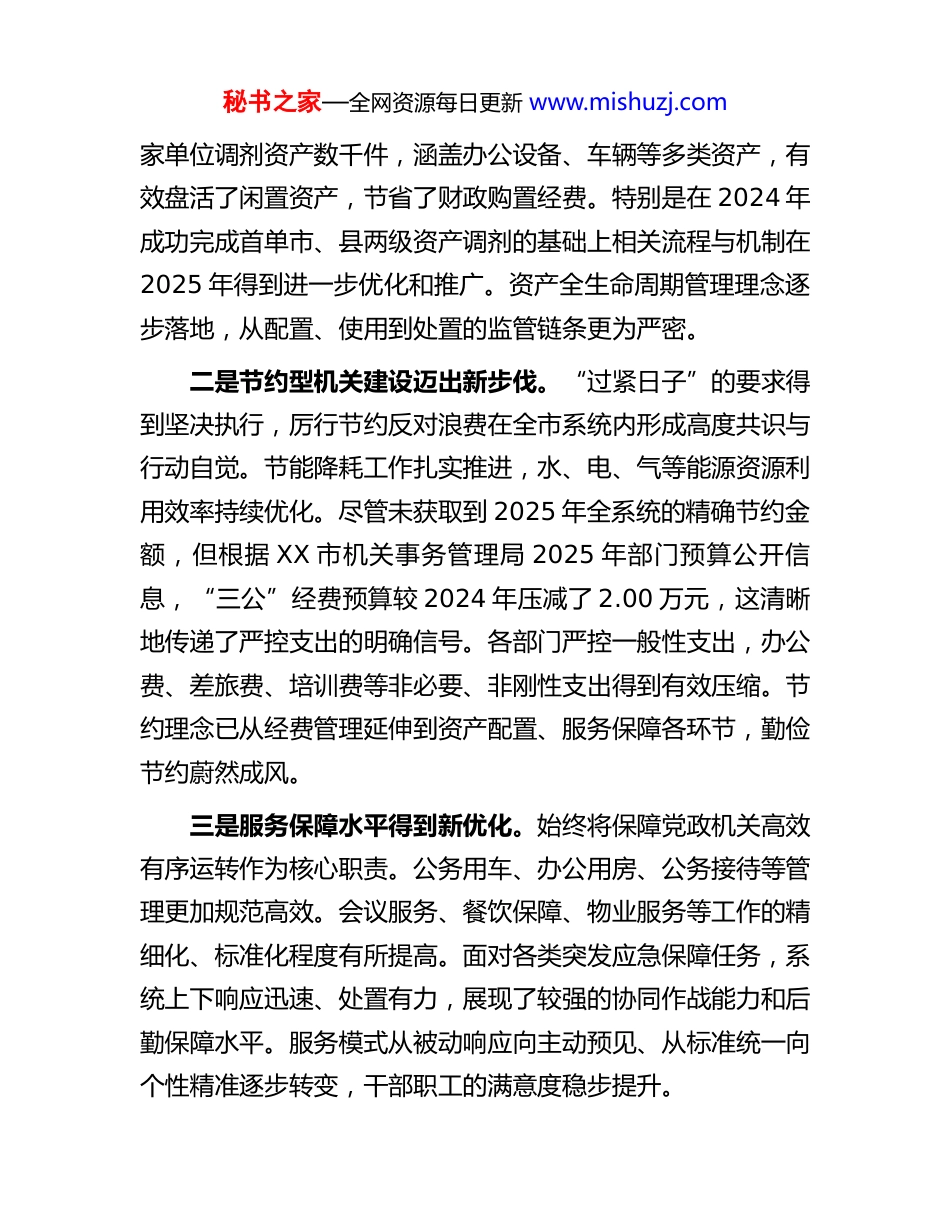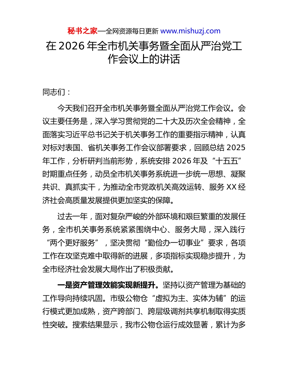 秘书之家—全网资源每日更新 www.mishuzj.com在 2026 年全市机关事务暨全面从严治党工作会议上的讲话同志们:今天我们召开全市机关事务暨全面从严治党工作会议。会议主要任务是,深入学习贯彻党的二十大及历次全会精神,全面落实习近平总书记关于机关事务工作的重要指示精神,认真对标对表国、省机关事务工作会议部署要求,回顾总结 2025年工作,分析研判当前形势,系统安排 2026 年及“十五五”时期重点任务,动员全市机关事务系统进一步统一思想、凝聚共识、真抓实干,为推动全市党政机关高效运转、服务 XX 经济社会高质量发展提供更加坚实的保障。过去一年,面对复杂严峻的外部环境和艰巨繁重的发展任务,全市机关事务系统紧紧围绕中心、服务大局,深入践行“两个更好服务”,坚决贯彻“勤俭办一切事业”要求,各项工作在攻坚克难中取得新的进展,多项指标实现稳步提升,为全市经济社会发展大局作出了积极贡献。一是资产管理效能实现新提升。坚持以资产管理为基础的工作导向持续巩固。市级公物仓“虚拟为主、实体为辅”的运行模式更加成熟,资产跨部门、跨层级调剂共享机制取得实质性突破。搜索结果显示,我市公物仓运行成效显著,累计为多秘书之家—全网资源每日更新 www.mishuzj.com家单位调剂资产数千件,涵盖办公设备、车辆等多类资产,有效盘活了闲置资产,节省了财政购置经费。特别是在 2024 年成功完成首单市、县两级资产调剂的基础上相关流程与机制在2025 年得到进一步优化和推广。资产全生命周期管理理念逐步落地,从配置、使用到处置的监管链条更为严密。二是节约型机关建设迈出新步伐。“过紧日子”的要求得到坚决执行,厉行节约反对浪费在全市系统内形成高度共识与行动自觉。节能降耗工作扎实推进,水、电、气等能源资源利用效率持续优化。尽管未获取到 2025 年全系统的精确节约金额,但根据 XX 市机关事务管理局 2025 年部门预算公开信息,“三公”经费预算较 2024 年压减了 2.00 万元,这清晰地传递了严控支出的明确信号。各部门严控一般性支出,办公费、差旅费、培训费等非必要、非刚性支出得到有效压缩。节约理念已从经费管理延伸到资产配置、服务保障各环节,勤俭节约蔚然成风。三是服务保障水平得到新优化。始终将保障党政机关高效有序运转作为核心职责。公务用车、办公用房、公务接待等管理更加规范高效。会议服务、餐饮保障、物业服务等工作的精细化、标准化程度有所提高。面对各类突发应急保障任务,系统上下响应迅速、处置有力,展现了较强的协同作战能力和后勤保障水平。服务模式从被动响应向主动预见、从标准统一向个性精准逐步转变,干部职工的满意度稳步提升。秘书之家—全网资源每日更新 www.mishuzj.com四是改革创新动力得到新增强。顺应数字化、智能化发展趋势,积极探索“制度+科技”的管理新模式。智慧机关事务建设开始布局,部分单位在智慧安防、智慧用能、智慧会议等方面进行了有益尝试。搜索结果显示,国家层面已发布《机关事务智慧运营标准化工作指南》,其中明确了技术保障标准体系,包含物联感知、网络通信、数据治理及信息安全等关键内容。这为我们推进智慧赋能提供了重要的标准参考和方向指引。管理流程再造与优化持续推进,一些长期存在的管理堵点、服务痛点得到疏通解决。五是队伍能力素质展现新面貌。坚持把政治建设摆在首位,持续巩固拓展主题教育成果,干部职工的政治判断力、政治领悟力、政治执行力不断增强。业务培训与岗位练兵常态化开展,专业能力得到锻炼。全面从严治党向纵深推进,廉政风险防控机制持续完善,纪检监察组的监督作用有效发挥,风清气正的政治生态得到巩固和发展。在肯定成绩的同时,必须清醒认识到存在的短板与不足。对照高质量发展的要求,资产管理的精细化、集约化水平仍有提升空间;节约型机关建设的深度和广度有待拓展,成本控制的精准性需进一步加强;服务保障的标准化、智慧化程度还不够高,与干部职工的期待尚有差距;改革创新的系统性、集成度有待提高,智慧赋能的整体解决方案和应用场景需加快落地;全面从严治党的压力传导需持续加力,重点领域和关键环秘书之家—全网资源每...