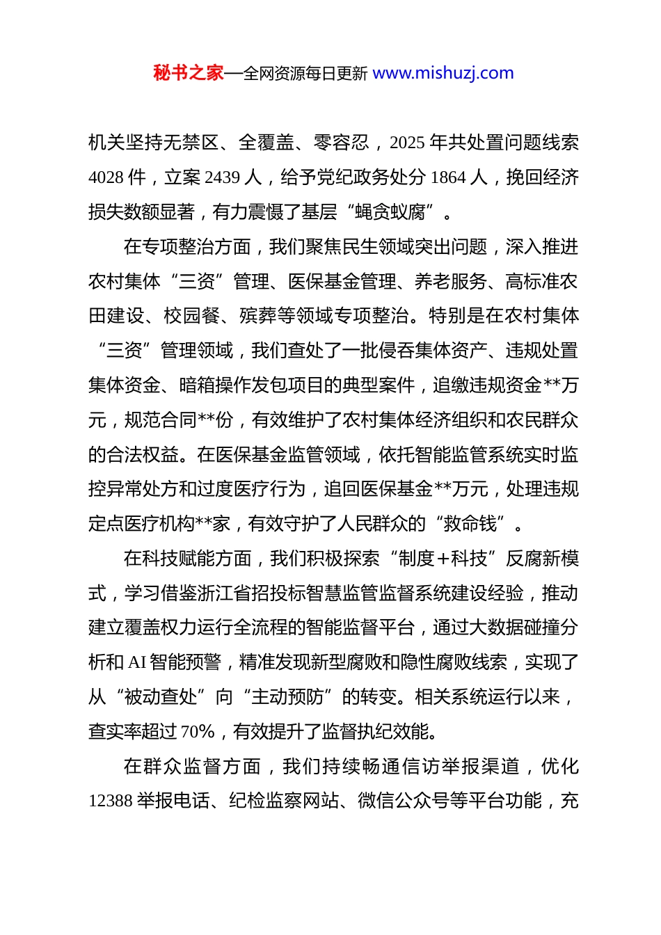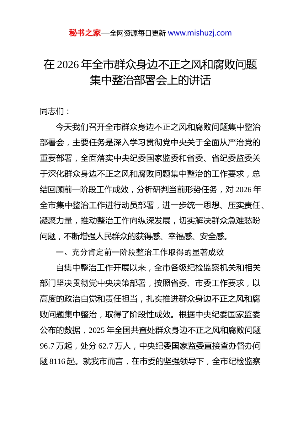 秘书之家—全网资源每日更新 www.mishuzj.com在 2026 年全市群众身边不正之风和腐败问题集中整治部署会上的讲话 同志们:今天我们召开全市群众身边不正之风和腐败问题集中整治部署会,主要任务是深入学习贯彻党中央关于全面从严治党的重要部署,全面落实中央纪委国家监委和省委、省纪委监委关于深化群众身边不正之风和腐败问题集中整治的工作要求,总结回顾前一阶段工作成效,分析研判当前形势任务,对 2026 年全市集中整治工作进行动员部署,进一步统一思想、压实责任、凝聚力量,推动整治工作向纵深发展,切实解决群众急难愁盼问题,不断增强人民群众的获得感、幸福感、安全感。一、充分肯定前一阶段整治工作取得的显著成效自集中整治工作开展以来,全市各级纪检监察机关和相关部门坚决贯彻党中央决策部署,按照省委、市委工作要求,以高度的政治自觉和责任担当,扎实推进群众身边不正之风和腐败问题集中整治,取得了阶段性成效。根据中央纪委国家监委公布的数据,2025 年全国共查处群众身边不正之风和腐败问题96.7 万起,处分 62.7 万人,中央纪委国家监委直接查办督办问题 8116 起。就我市而言,在市委的坚强领导下,全市纪检监察秘书之家—全网资源每日更新 www.mishuzj.com机关坚持无禁区、全覆盖、零容忍,2025 年共处置问题线索4028 件,立案 2439 人,给予党纪政务处分 1864 人,挽回经济损失数额显著,有力震慑了基层“蝇贪蚁腐”。在专项整治方面,我们聚焦民生领域突出问题,深入推进农村集体“三资”管理、医保基金管理、养老服务、高标准农田建设、校园餐、殡葬等领域专项整治。特别是在农村集体“三资”管理领域,我们查处了一批侵吞集体资产、违规处置集体资金、暗箱操作发包项目的典型案件,追缴违规资金**万元,规范合同**份,有效维护了农村集体经济组织和农民群众的合法权益。在医保基金监管领域,依托智能监管系统实时监控异常处方和过度医疗行为,追回医保基金**万元,处理违规定点医疗机构**家,有效守护了人民群众的“救命钱”。在科技赋能方面,我们积极探索“制度+科技”反腐新模式,学习借鉴浙江省招投标智慧监管监督系统建设经验,推动建立覆盖权力运行全流程的智能监督平台,通过大数据碰撞分析和 AI 智能预警,精准发现新型腐败和隐性腐败线索,实现了从“被动查处”向“主动预防”的转变。相关系统运行以来,查实率超过 70%,有效提升了监督执纪效能。在群众监督方面,我们持续畅通信访举报渠道,优化12388 举报电话、纪检监察网站、微信公众号等平台功能,充秘书之家—全网资源每日更新 www.mishuzj.com分调动群众参与反腐的积极性,群众监督的“前哨”作用得到有效发挥。通过群众举报核查,我们成功查处了一批侵害群众利益的违纪违法案件,推动解决了一批群众反映强烈的突出问题。在制度建设方面,我们坚持标本兼治、系统施治,针对整治中发现的制度漏洞和监管盲区,督促相关部门完善制度机制**项,推动形成了一批可复制、可推广的治理经验,为长效常治奠定了坚实基础。二、清醒认识当前整治工作面临的形势和问题在肯定成绩的同时,我们必须清醒地认识到,群众身边不正之风和腐败问题存量尚未见底、增量仍在发生,形势依然严峻复杂。从信访举报和案件查处情况看,当前我市群众身边不正之风和腐败问题主要集中在以下几个方面。一是农村集体“三资”管理领域问题依然突出。部分村集体资产底数不清、台账不全、监管不力,少数基层干部利用职务便利,通过虚报冒领、截留挪用、违规发包等手段侵占集体资产,或在集体土地征收补偿、集体资源开发中暗箱操作、以权谋私,严重损害群众利益。部分村务公开流于形式,群众知情权、参与权、监督权难以保障。二是民生领域“微腐败”易发多发。在养老服务等民生领秘书之家—全网资源每日更新 www.mishuzj.com域,存在骗取套取补贴资金、服务缩水打折、监管缺位等问题。在医保基金管理领域,过度医疗、虚假诊疗、串换药品等违规行为时有发生。在高标准农田建设领域,存在工程质量不达标、资金使用不规范、项目管理混乱等问题。在校园餐领域,存在食材采购不规范、质量把关不严、财务管...