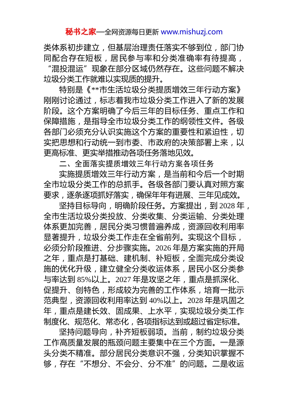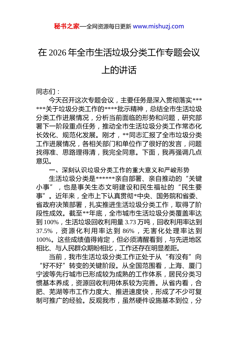 秘书之家—全网资源每日更新 www.mishuzj.com在 2026 年全市生活垃圾分类工作专题会议上的讲话同志们:今天召开这次专题会议,主要任务是深入贯彻落实******关于垃圾分类工作的****批示精神,总结全市生活垃圾分类工作进展情况,分析当前面临的形势和问题,研究部署下一阶段重点任务,推动全市生活垃圾分类工作常态化长效化、规范化发展。刚才,**同志汇报了全市垃圾分类工作进展情况,各相关部门和单位作了很好的发言,问题找得准、思路理得清,我完全同意。下面,我再强调几点意见。一、深刻认识垃圾分类工作的重大意义和严峻形势生活垃圾分类是******亲自部署、亲自推动的“关键小事”,也是事关生态文明建设和民生福祉的“民生要事”。近年来,全市上下认真贯彻*中央、国务院和省委、省政府决策部署,扎实推进生活垃圾分类工作,取得了阶段性成效。截至**年底,全市城市生活垃圾分类覆盖率达到 100%,生活垃圾回收利用量 3.73 万吨,回收利用率达到37.5% , 资 源 化 利 用 率 达 到 86% , 无 害 化 处 理 率 达 到100%。这些成绩值得肯定,但必须清醒看到,与先进地区相比、与人民群众期盼相比,工作还存在明显差距。当前,我市生活垃圾分类工作正处于从“有没有”向“好不好”转变的关键阶段。从全国范围看,上海、厦门宁波等先行城市已形成较为成熟的工作体系,居民分类习惯基本养成,资源回收利用体系较为完善。从省内看,合肥、芜湖等市工作力度大、推进速度快,形成了不少可复制可推广的经验。反观我市,虽然硬件设施基本到位,分秘书之家—全网资源每日更新 www.mishuzj.com类体系初步建立,但基层治理责任落实不够到位,部门协同配合存在短板,居民参与率和分类准确率有待提高,“混投混运”现象在部分区域仍然存在。这些问题不解决垃圾分类工作就难以实现质的提升。特别是《**市生活垃圾分类提质增效三年行动方案》刚刚讨论通过,标志着我市垃圾分类工作进入了新的发展阶段。这个方案明确了今后三年的目标任务、重点工作和保障措施,是指导全市垃圾分类工作的纲领性文件。各级各部门必须充分认识实施这个方案的重要性和紧迫性,切实把思想和行动统一到市委、市政府的决策部署上来,以更高标准、更实举措推动各项任务落地见效。二、全面落实提质增效三年行动方案各项任务实施提质增效三年行动方案,是当前和今后一个时期全市垃圾分类工作的总抓手。各级各部门要认真对照方案要求,逐条逐项抓好落实,确保年年有进展、三年见成效。坚持目标导向,明确阶段任务。方案提出,到 2028 年,全市生活垃圾分类投放、分类收集、分类运输、分类处理体系更加完善,居民分类习惯普遍养成,资源回收利用率显著提升,垃圾分类工作走在全省前列。实现这个目标,必须分阶段推进、分步骤实施。2026 年是方案实施的开局之年,重点是打基础、建机制、补短板,全面完成分类设施的优化升级,建立健全分类收运体系,居民小区分类参与率达到 85%以上。2027 年是攻坚之年,重点是抓深化、促提升、创特色,形成较为完善的工作体系,培育一批示范典型,资源回收利用率达到 40%以上。2028 年是巩固之年,重点是建长效、固成果、上水平,实现垃圾分类工作制度化、规范化、常态化,各项指标达到或超过省定标准。坚持问题导向,补齐短板弱项。当前,制约垃圾分类工作高质量发展的瓶颈问题主要集中在三个方面。一是源头分类不精准。部分居民分类意识不强,分类知识掌握不够,存在“不想分、不会分、分不准”的问题。二是收运秘书之家—全网资源每日更新 www.mishuzj.com体系不完善。厨余垃圾、可回收物收运能力不足,部分区域存在“先分后混、混收混运”现象,影响居民分类积极性。三是资源利用不充分。再生资源回收体系与环卫清运体系衔接不够紧密,低值可回收物回收渠道不畅,资源化利用水平有待提高。针对这些问题,方案都提出了明确解决路径,关键是抓好落实。坚持结果导向,强化考核评估。方案建立了较为完善的考核评估体系,将垃圾分类工作纳入各级各部门年度目标考核,实行月调度、季通报、年考核制度。市分类办要抓紧制定详细的考核评分细则,明确指标权重...