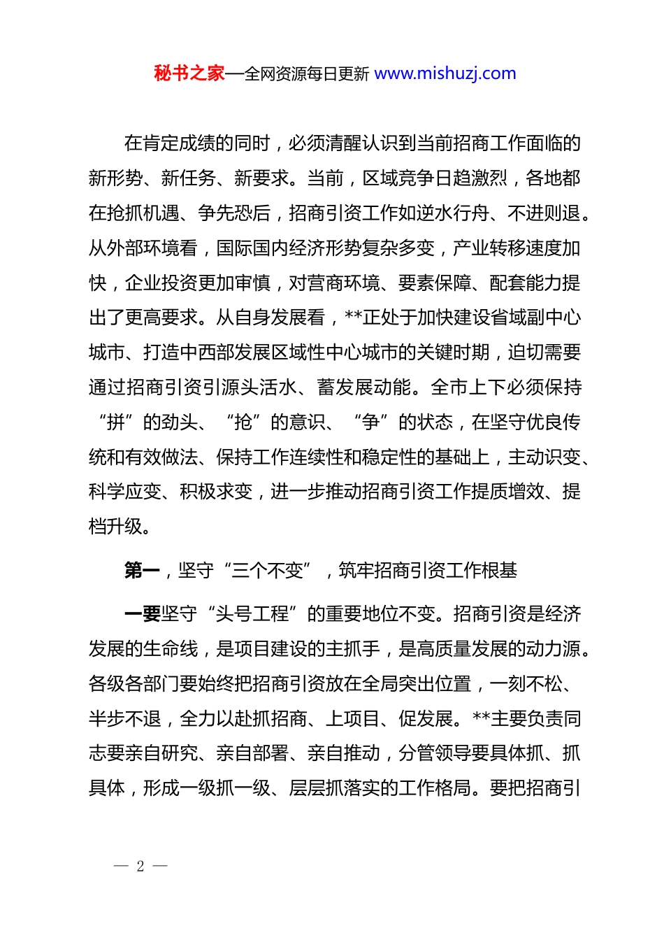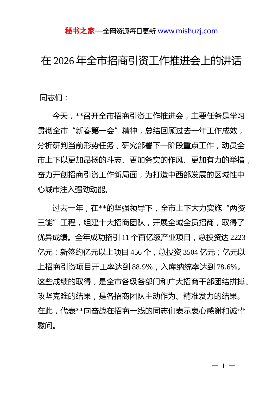 秘书之家—全网资源每日更新 www.mishuzj.com在 2026 年全市招商引资工作推进会上的讲话 同志们:今天,**召开全市招商引资工作推进会,主要任务是学习贯彻全市“新春第一会”精神,总结回顾过去一年工作成效,分析研判当前形势任务,研究部署下一阶段重点工作,动员全市上下以更加昂扬的斗志、更加务实的作风、更加有力的举措,奋力开创招商引资工作新局面,为打造中西部发展的区域性中心城市注入强劲动能。 过去一年,在**的坚强领导下,全市上下大力实施“两资三能”工程,组建十大招商团队,开展全域全员招商,取得了优异成绩。全年成功招引 11 个百亿级产业项目,总投资达 2223亿元;新签约亿元以上项目 456 个,总投资 3504 亿元;亿元以上招商引资项目开工率达到 88.9%,入库纳统率达到 78.6%。这些成绩的取得,是全市各级各部门和广大招商干部团结拼搏、攻坚克难的结果,是各招商团队主动作为、精准发力的结果。在此,代表**向奋战在招商一线的同志们表示衷心感谢和诚挚慰问。— 1 —秘书之家—全网资源每日更新 www.mishuzj.com在肯定成绩的同时,必须清醒认识到当前招商工作面临的新形势、新任务、新要求。当前,区域竞争日趋激烈,各地都在抢抓机遇、争先恐后,招商引资工作如逆水行舟、不进则退。从外部环境看,国际国内经济形势复杂多变,产业转移速度加快,企业投资更加审慎,对营商环境、要素保障、配套能力提出了更高要求。从自身发展看,**正处于加快建设省域副中心城市、打造中西部发展区域性中心城市的关键时期,迫切需要通过招商引资引源头活水、蓄发展动能。全市上下必须保持“拼”的劲头、“抢”的意识、“争”的状态,在坚守优良传统和有效做法、保持工作连续性和稳定性的基础上,主动识变、科学应变、积极求变,进一步推动招商引资工作提质增效、提档升级。第一,坚守“三个不变”,筑牢招商引资工作根基一要坚守“头号工程”的重要地位不变。招商引资是经济发展的生命线,是项目建设的主抓手,是高质量发展的动力源。各级各部门要始终把招商引资放在全局突出位置,一刻不松、半步不退,全力以赴抓招商、上项目、促发展。**主要负责同志要亲自研究、亲自部署、亲自推动,分管领导要具体抓、抓具体,形成一级抓一级、层层抓落实的工作格局。要把招商引— 2 —秘书之家—全网资源每日更新 www.mishuzj.com资作为检验干部能力作风的重要考场,作为推动地方发展的重要引擎,以招商引资的实际成效推动经济社会高质量发展。二要坚守团队招商的基本模式不变。十大招商团队是**招商引资工作的重要力量和有效载体。要进一步完善工作机制,优化团队搭配,拧紧责任链条,形成齐抓共管、齐心协力的良好格局。各招商团队要明确主攻方向,聚焦重点产业、重点区域、重点企业,精准发力、持续攻坚。要建立健全团队之间的协作机制,强化信息共享、资源整合、协同作战,避免各自为战、单打独斗。要加强招商团队的业务培训和实战锻炼,不断提升专业能力和服务水平,打造一支懂政策、懂产业、懂企业的高素质招商队伍。三要坚守务本务实的工作导向不变。招商引资重在实效,贵在落地。要牢固树立和践行正确政绩观,坚决杜绝数字招商、形式招商、虚假招商,以实打实的举措、硬碰硬的成效,做到“真招商、招真商”。考核评价要更加注重项目开工率、入库率、达效率,更加注重项目质量和效益,更加注重对地方经济发展的实际贡献。要深化运用“五化”管理,健全项目全生命周期管理机制,推动签约项目早落地、落地项目早开工、开工项目早投产、投产项目早达效。要建立健全问题台账、周汇总、— 3 —秘书之家—全网资源每日更新 www.mishuzj.com月调度、督办单等工作机制,及时发现和解决项目推进中的困难问题,确保招商引资项目招得来、落得下、发展好。第二,推动“三个转变”,开创招商引资工作新局面一要积极推动招商重心之变。精准开展产业链招商,围绕加快打造“3+4”产业体系,摸清底数、明确重点,高质量绘制产业链招商图谱,以精准招商推动重点产业延链补链强链。“3+4”产业体系是**重塑制造格局、推动产业转型升级的重要战略布局,包括优化提升汽车、...