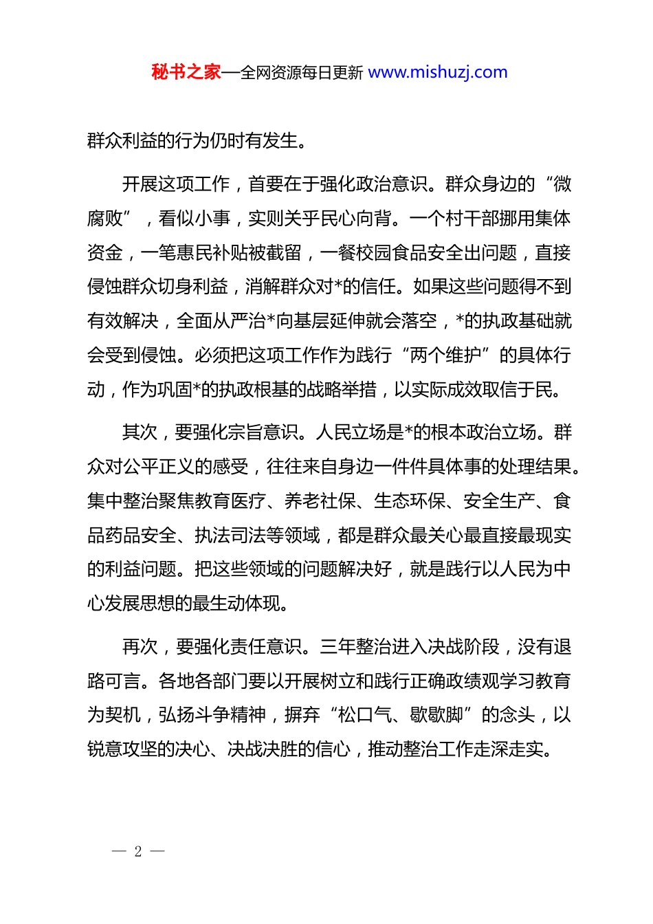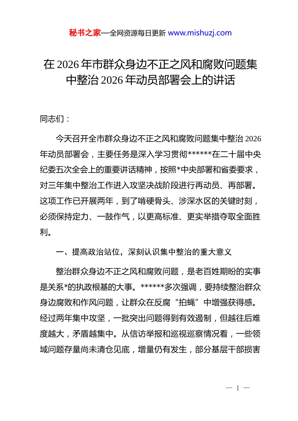 秘书之家—全网资源每日更新 www.mishuzj.com在 2026 年市群众身边不正之风和腐败问题集中整治 2026 年动员部署会上的讲话同志们:今天召开全市群众身边不正之风和腐败问题集中整治 2026年动员部署会,主要任务是深入学习贯彻******在二十届中央纪委五次全会上的重要讲话精神,按照*中央部署和省委要求,对三年集中整治工作进入攻坚决战阶段进行再动员、再部署。这项工作已开展两年,到了啃硬骨头、涉深水区的关键时刻,必须保持定力、一鼓作气,以更高标准、更实举措夺取全面胜利。一、提高政治站位,深刻认识集中整治的重大意义整治群众身边不正之风和腐败问题,是老百姓期盼的实事是关系*的执政根基的大事。******多次强调,要持续整治群众身边腐败和作风问题,让群众在反腐“拍蝇”中增强获得感。经过两年集中攻坚,一批突出问题得到有效遏制,但越往后难度越大,矛盾越集中。从信访举报和巡视巡察情况看,一些领域问题存量尚未清仓见底,增量仍有发生,部分基层干部损害— 1 —秘书之家—全网资源每日更新 www.mishuzj.com群众利益的行为仍时有发生。开展这项工作,首要在于强化政治意识。群众身边的“微腐败”,看似小事,实则关乎民心向背。一个村干部挪用集体资金,一笔惠民补贴被截留,一餐校园食品安全出问题,直接侵蚀群众切身利益,消解群众对*的信任。如果这些问题得不到有效解决,全面从严治*向基层延伸就会落空,*的执政基础就会受到侵蚀。必须把这项工作作为践行“两个维护”的具体行动,作为巩固*的执政根基的战略举措,以实际成效取信于民。其次,要强化宗旨意识。人民立场是*的根本政治立场。群众对公平正义的感受,往往来自身边一件件具体事的处理结果。集中整治聚焦教育医疗、养老社保、生态环保、安全生产、食品药品安全、执法司法等领域,都是群众最关心最直接最现实的利益问题。把这些领域的问题解决好,就是践行以人民为中心发展思想的最生动体现。再次,要强化责任意识。三年整治进入决战阶段,没有退路可言。各地各部门要以开展树立和践行正确政绩观学习教育为契机,弘扬斗争精神,摒弃“松口气、歇歇脚”的念头,以锐意攻坚的决心、决战决胜的信心,推动整治工作走深走实。— 2 —秘书之家—全网资源每日更新 www.mishuzj.com二、聚焦重点难点,坚决打赢攻坚决战当前,集中整治进入深水区,必须突出重点、靶向发力,做到精准施策、精准打击。抓牢县区一级这个“主战场”。县区是政策落实的“最后一公里”,也是问题易发多发的重点区域。要继续深化“战区”模式,拧紧各板块责任链条,整合纪检监察、巡察、审计、财政等力量,压茬推进。县区*委要切实扛起主体责任,书记要亲自抓、负总责,确保责任不松、力度不减、标准不降。对问题突出的乡镇街道,要挂牌督办、限期整改,必要时提级办理、直查直办。聚焦重点整治项目这个“基本盘”。2026 年,中央纪委国家监委明确部署开展四个全国性整治项目,即农村集体“三资”管理、医保基金管理、养老服务、高标准农田建设。这四个领域直接关系到群众切身利益和国家战略安全。同时,要统筹推进 10 项重大民生事项和省级层面 2 个重点整治项目。在此基础上,结合**实际,必须紧盯养老服务、高标准农田建设、网络餐饮食品安全、小区物业管理服务、涉企行政执法等重点领域。— 3 —秘书之家—全网资源每日更新 www.mishuzj.com在养老服务领域,重点整治养老机构虚报入住人数套取运营补贴、建设补助,高龄津贴发放不精准,养老金发放中存在的冒领、篡改档案、拖欠克扣等问题。要规范补贴申请、审核、拨付全流程监管,确保国家投入的每一分钱都用在刀刃上,让老年人真正享受到优质养老服务。在高标准农田建设领域,这是中央纪委全会首次点题整治的重点。要严守耕地红线,重拳整治违法占用、破坏耕地行为,扎实推进高标准农田排查整治。项目资金实行全链条监管,杜绝套取、挤占、挪用,确保国家粮食安全底线牢不可破。2026年亩均投资标准提升至 3000 元,必须完成土地流转程序,并提供真实规范的农户签字确认表。在网络餐饮食品安全领域,市场监管总局已出台《网络餐饮服务经营者落实食品安全主...
