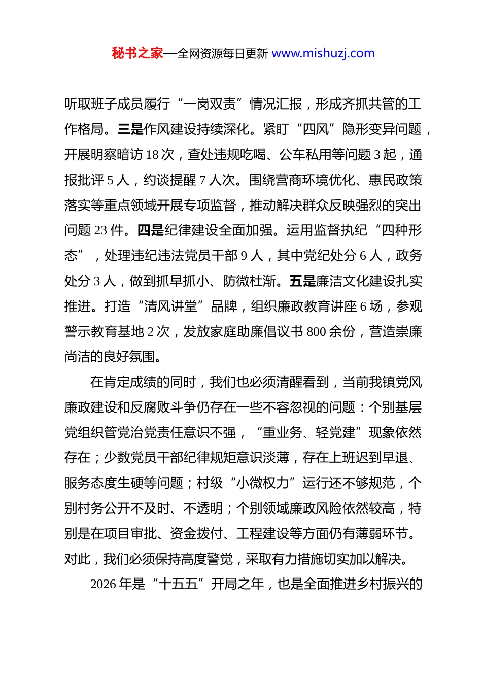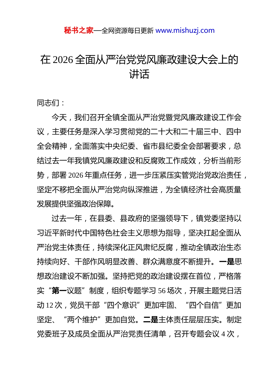 秘书之家—全网资源每日更新 www.mishuzj.com在 2026 全面从严治党党风廉政建设大会上的讲话 同志们:今天,我们召开全镇全面从严治党暨党风廉政建设工作会议,主要任务是深入学习贯彻党的二十大和二十届三中、四中全会精神,全面落实中央纪委、省市县纪委全会部署要求,总结过去一年我镇党风廉政建设和反腐败工作成效,分析当前形势,部署 2026 年重点任务,进一步压紧压实管党治党政治责任,坚定不移把全面从严治党向纵深推进,为全镇经济社会高质量发展提供坚强政治保障。过去一年,在县委、县政府的坚强领导下,镇党委坚持以习近平新时代中国特色社会主义思想为指导,坚决扛起全面从严治党主体责任,持续深化正风肃纪反腐,推动全镇政治生态持续向好、干部作风明显改善、群众满意度不断提升。一是思想政治建设不断加强。坚持把党的政治建设摆在首位,严格落实“第一议题”制度,组织专题学习 56 场次,开展主题党日活动 12 次,党员干部“四个意识”更加牢固、“四个自信”更加坚定、“两个维护”更加自觉。二是主体责任层层压实。制定党委班子及成员全面从严治党责任清单,召开专题会议 4 次,秘书之家—全网资源每日更新 www.mishuzj.com听取班子成员履行“一岗双责”情况汇报,形成齐抓共管的工作格局。三是作风建设持续深化。紧盯“四风”隐形变异问题,开展明察暗访 18 次,查处违规吃喝、公车私用等问题 3 起,通报批评 5 人,约谈提醒 7 人次。围绕营商环境优化、惠民政策落实等重点领域开展专项监督,推动解决群众反映强烈的突出问题 23 件。四是纪律建设全面加强。运用监督执纪“四种形态”,处理违纪违法党员干部 9 人,其中党纪处分 6 人,政务处分 3 人,做到抓早抓小、防微杜渐。五是廉洁文化建设扎实推进。打造“清风讲堂”品牌,组织廉政教育讲座 6 场,参观警示教育基地 2 次,发放家庭助廉倡议书 800 余份,营造崇廉尚洁的良好氛围。在肯定成绩的同时,我们也必须清醒看到,当前我镇党风廉政建设和反腐败斗争仍存在一些不容忽视的问题:个别基层党组织管党治党责任意识不强,“重业务、轻党建”现象依然存在;少数党员干部纪律规矩意识淡薄,存在上班迟到早退、服务态度生硬等问题;村级“小微权力”运行还不够规范,个别村务公开不及时、不透明;个别领域廉政风险依然较高,特别是在项目审批、资金拨付、工程建设等方面仍有薄弱环节。对此,我们必须保持高度警觉,采取有力措施切实加以解决。2026 年是“十五五”开局之年,也是全面推进乡村振兴的秘书之家—全网资源每日更新 www.mishuzj.com重要一年。做好今年的全面从严治党工作,意义重大、责任重大。我们要坚持以习近平新时代中国特色社会主义思想为指导,全面贯彻党的二十大和二十届三中、四中全会精神,弘扬伟大建党精神,永葆自我革命精神,坚持严的主基调不动摇,一体推进不敢腐、不能腐、不想腐,持续净化政治生态,以高质量党建引领保障高质量发展。重点抓好以下五个方面工作:一、突出政治引领,坚决做到“两个维护”要把讲政治贯穿于全面从严治党全过程各方面。全镇各级党组织和广大党员干部要始终把党的政治建设放在首位,深刻领悟“两个确立”的决定性意义,不断增强“四个意识”、坚定“四个自信”、做到“两个维护”。要持续深化理论武装,健全常态化学习机制,深入学习党的创新理论,特别是关于全面从严治党的重要论述,做到学思用贯通、知信行统一。要严明政治纪律和政治规矩,坚决防止和纠正一切偏离“两个维护”的错误言行,决不允许搞“两面派”、做“两面人”。要加强政治监督,聚焦党中央重大决策部署落实情况,围绕乡村振兴、民生保障、安全生产、生态环境保护等重点工作开展专项督查,确保政令畅通、令行禁止。二、压实主体责任,构建齐抓共管格局全面从严治党,关键在“全面”,要害在“从严”,核心秘书之家—全网资源每日更新 www.mishuzj.com在“责任落实”。镇党委将切实履行主体责任,党委书记履行第一责任人职责,班子成员落实“一岗双责”,真正做到真管真严、敢管敢严、长管长严。各村(社区)、镇直各单位党组织要主动担责、认真...