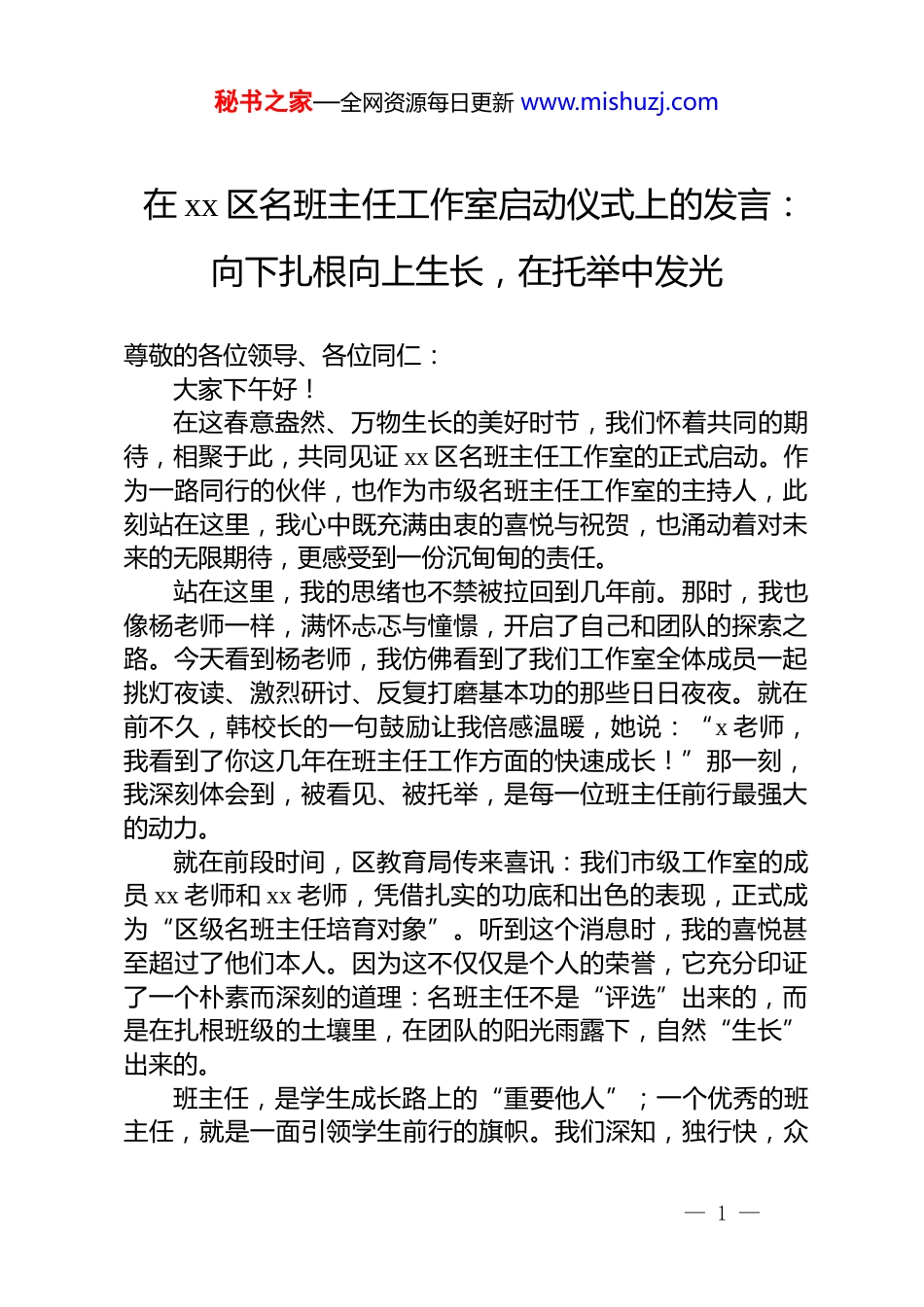 秘书之家—全网资源每日更新 www.mishuzj.com在 xx 区名班主任工作室启动仪式上的发言:向下扎根向上生长,在托举中发光尊敬的各位领导、各位同仁:大家下午好!在这春意盎然、万物生长的美好时节,我们怀着共同的期待,相聚于此,共同见证 xx 区名班主任工作室的正式启动。作为一路同行的伙伴,也作为市级名班主任工作室的主持人,此刻站在这里,我心中既充满由衷的喜悦与祝贺,也涌动着对未来的无限期待,更感受到一份沉甸甸的责任。站在这里,我的思绪也不禁被拉回到几年前。那时,我也像杨老师一样,满怀忐忑与憧憬,开启了自己和团队的探索之路。今天看到杨老师,我仿佛看到了我们工作室全体成员一起挑灯夜读、激烈研讨、反复打磨基本功的那些日日夜夜。就在前不久,韩校长的一句鼓励让我倍感温暖,她说:“x 老师,我看到了你这几年在班主任工作方面的快速成长!”那一刻,我深刻体会到,被看见、被托举,是每一位班主任前行最强大的动力。就在前段时间,区教育局传来喜讯:我们市级工作室的成员 xx 老师和 xx 老师,凭借扎实的功底和出色的表现,正式成为“区级名班主任培育对象”。听到这个消息时,我的喜悦甚至超过了他们本人。因为这不仅仅是个人的荣誉,它充分印证了一个朴素而深刻的道理:名班主任不是“评选”出来的,而是在扎根班级的土壤里,在团队的阳光雨露下,自然“生长”出来的。班主任,是学生成长路上的“重要他人”;一个优秀的班主任,就是一面引领学生前行的旗帜。我们深知,独行快,众— 1 —秘书之家—全网资源每日更新 www.mishuzj.com行远。在班主任这条专业成长的道路上,一个人的摸索难免孤独,但一群人的同行便能走得更稳、更远。杨老师的成长,既源于她个人的深耕不辍,也源于工作室团队的协作,更离不开咱们第一实验小学翠云路分校给予的广阔平台与无私托举。正是有了集体的沃土,班主任工作室才有了蓬勃生长的可能。作为市级名班主任工作室的主持人,在这个值得纪念的启航时刻,我想结合自己走过的路,送给即将出发的区级名班主任工作室三句话,与各位伙伴共勉:第一句话:向下扎根,才能向上生长。班主任工作室不是搞“花架子”的地方。无论我们的课题多么前沿,理论多么高深,最终的落脚点是班级那“一亩三分地”。希望大家在未来的研修中,少一些空谈,多一些“地气”。多聊聊那个让您头疼的“最难管的孩子”,多琢磨那节让您失眠的“最头疼的班会课”,多思考如何搭建起家校之间那座温暖的桥梁。把问题当课题,把小事做精细,这就是最扎实的成长。第二句话:珍惜平台,成为“火种”。区级名班主任工作室,是一份荣誉,更是一份沉甸甸的责任。这份责任,就是要让我们每个人从被动接受培训的“受益者”,转变为主动输出经验的“火种”。希望在不久的将来,这个工作室不仅能走出 xx 老师这样的骨干,更能涌现出更多冲击市级、乃至省级名班主任的后起之秀。让我们不仅自己发光,更要学会点燃别人,让班主任工作的智慧之火,在更广阔的天地燎原。第三句话:立足平凡,追求卓越。班主任的工作,没有惊天动地的壮举,只有日复一日的坚守。但正是在这些平凡的日常里,蕴含着教育的全部奥秘。希望大家在未来的日子里,能够把工作室当作“加油站”和“研究室”,当作那个能让自己在疲惫时能找回初心的“精神家— 2 —秘书之家—全网资源每日更新 www.mishuzj.com园”。在平凡的岗位上,做出不平凡的教育温度。基于这样的期许,我对即将启航的工作室,有三点愿景:第一,我们要做“研究的平台”,把难题变课题。面对“双减”背景下的家校沟通新挑战,面对新时期小学生的心理特点,面对层出不穷的班级管理难题,我们不能单打独斗,更不能凭经验“硬扛”。我们要把工作室变成教育的“诊所”和“实验室”,把工作中遇到的每一个“疑难杂症”,都变成我们研究的课题。让经验上升为理论,把困惑转化为智慧,让每一位成员都成为研究型班主任。第二,我们要做“成长的阶梯”,让每个人都被看见。今天的启动仪式,不是一个终点,而是一个全新的起点。让 xx 老师从核心成员到“培育对象”的蜕变,激励工作室里的每一位年轻班主任,都能找到...