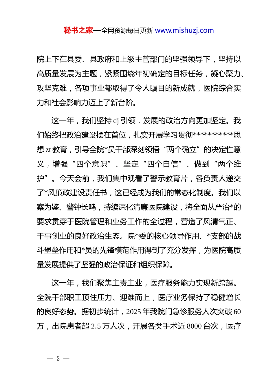秘书之家—全网资源每日更新 www.mishuzj.com在 xx 县中医医院 2025 年年度工作总结暨表扬大会上的讲话同志们,朋友们:大家晚上好!冬去春来,岁月更新。在这辞旧迎新的美好时刻,我们欢聚一堂,隆重召开 xx 县中医医院 2025 年年度工作总结暨表扬大会。首先,我代表院*委,向在过去一年里辛勤耕耘、默默奉献的全体干部职工,致以最崇高的敬意和最诚挚的感谢!向今天受到表扬的先进集体和优秀个人,表示最热烈的祝贺!刚才,xx 院长作了全面详实、催人奋进的年度工作报告,系统总结了 2025 年我们共同走过的奋斗历程和取得的丰硕成果,并对 2026 年的重点工作进行了科学谋划和周密部署,我完全赞同。各位先进代表的发言,情真意切,朴实感人,展现了我们xx 县中医院人“敬佑生命、救死扶伤、甘于奉献、大爱无疆”的职业精神,值得我们每一个人学习。回首 2025 年,是医院发展史上极不平凡、具有里程碑意义的一年。面对复杂多变的外部环境和艰巨繁重的发展任务,全— 1 —秘书之家—全网资源每日更新 www.mishuzj.com院上下在县委、县政府和上级主管部门的坚强领导下,坚持以高质量发展为主题,紧紧围绕年初确定的目标任务,凝心聚力、攻坚克难,各项事业都取得了令人瞩目的新成就,医院综合实力和社会影响力迈上了新台阶。这一年,我们坚持 dj 引领,发展的政治方向更加坚定。我们始终把政治建设摆在首位,扎实开展学习贯彻***********思想 zt 教育,引导全院*员干部深刻领悟“两个确立”的决定性意义,增强“四个意识”、坚定“四个自信”、做到“两个维护”。今天会前,我们集中观看了警示教育片,各负责人递交了*风廉政建设责任书,这已经成为我们的常态化制度。我们以案为鉴、警钟长鸣,持续深化清廉医院建设,将全面从严治*的要求贯穿于医院管理和业务工作的全过程,营造了风清气正、干事创业的良好政治生态。院*委的核心领导作用、*支部的战斗堡垒作用和*员的先锋模范作用得到了充分发挥,为医院高质量发展提供了坚强的政治保证和组织保障。这一年,我们聚焦主责主业,医疗服务能力实现新跨越。全院干部职工顶住压力、迎难而上,医疗业务保持了稳健增长的良好态势。据初步统计,2025 年我院门急诊服务人次突破 60万,出院患者超 2.5 万人次,开展各类手术近 8000 台次,医疗— 2 —秘书之家—全网资源每日更新 www.mishuzj.com业务总收入再创历史新高,多项核心指标位居全县医疗机构前列。尤为振奋人心的是,经过全院上下的不懈努力,我们成功通过三级甲等中医医院的现场评审,这是几代中医院人梦寐以求的夙愿,标志着我院正式步入区域高水平医院行列。同时,我们成功获批省级“两专科一中心”和市级重点专科,胸痛中心、卒中中心等“五大中心”建设高效运行,急危重症救治能力显著增强,多项新技术、新项目的成功开展填补了县域医疗技术空白,让广大群众在家门口就能享受到更加优质、高效、便捷的医疗服务。这一年,我们彰显中医特色,传承创新发展迈出新步伐。作为全县中医药事业的“龙头”,我们始终坚守中医本色,做强特色优势。2025 年,我院中医药服务量质齐升,中医非药物疗法使用率持续攀升,中药饮片和院内制剂使用量稳步增长。我们深入推进“传统中医+现代康复”服务模式,康复医学科的诊疗水平和服务能力得到患者高度认可。中医经典病房、治未病科、特色治疗中心等品牌效应日益凸显,平衡针技术、针刺运动疗法、小儿推拿捏脊等一批中医特色技术得到广泛应用,临床疗效显著。我们牵头制定的 62 个中医优势病种诊疗方案和112 个中医临床路径在医共体内得到有效推广,中医药在治未— 3 —秘书之家—全网资源每日更新 www.mishuzj.com病、重大疾病治疗和疾病康复中的独特优势得到进一步彰显。这一年,我们筑牢人才根基,学科建设和科研教学取得新成果。人才是第一资源,创新是第一动力。我们坚持“内培外引”双轮驱动,人才队伍结构持续优化。2025 年,我们成功引进了一批高层次医学人才,选派了多名业务骨干到上级医院进修学习,师承教育、“中医讲堂”等人才培养模式不断深化。学科建设梯队更加完善,形成了以 4 个省级重...