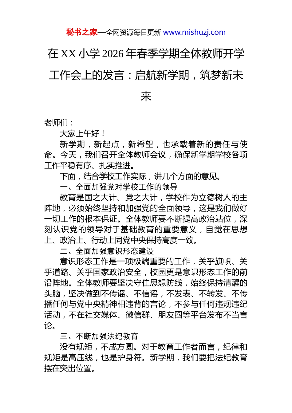 秘书之家—全网资源每日更新 www.mishuzj.com在 XX 小学 2026 年春季学期全体教师开学工作会上的发言:启航新学期,筑梦新未来老师们:大家上午好!新学期,新起点,新希望,也承载着新的责任与使命。今天,我们召开全体教师会议,确保新学期学校各项工作平稳有序、扎实推进。下面,结合学校工作实际,讲几个方面的意见。一、全面加强党对学校工作的领导教育是国之大计、党之大计,学校作为立德树人的主阵地,必须始终坚持和加强党的全面领导,这是我们做好一切工作的根本保证。全体教师要不断提高政治站位,深刻认识党的领导对于基础教育的重要意义,自觉在思想上、政治上、行动上同党中央保持高度一致。二、全面加强意识形态建设意识形态工作是一项极端重要的工作,关乎旗帜、关乎道路、关乎国家政治安全,校园更是意识形态工作的前沿阵地。全体教师要坚决守住思想防线,始终保持清醒的头脑,坚决做到不传谣、不信谣,不发表、不转发、不传播任何与党中央精神相违背的言论,不参与任何违规违纪活动,不在社交媒体、微信群、朋友圈等平台发布不当言论。三、不断加强法纪教育没有规矩,不成方圆。对于教育工作者而言,纪律和规矩是高压线,也是护身符。新学期,我们要把法纪教育摆在突出位置。秘书之家—全网资源每日更新 www.mishuzj.com(一)持续深入开展“群腐”整治工作。群众身边的腐败和不正之风,损害教育公平,败坏教师形象,我们必须坚决抵制、彻底整治。结合上级要求和学校实际,重点抓好以下几个方面:一是严禁违规收受红包礼品礼金。教师的职责是教书育人,不是谋取私利。任何收受学生和家长赠送的礼品、礼金、消费卡、土特产等行为,不管什么理由,都是严格禁止的。二是严禁违规吃喝。不接受学生家长的宴请,不参与可能影响公正履职的聚餐活动,不利用职务之便搞吃请、请吃,保持健康清爽的家校关系。三是严禁违规补课。坚决杜绝在职教师在校外培训机构兼职、有偿补课,或利用课余时间、节假日组织学生违规补课、收取费用。四是严禁违规经商。教师不得从事或者参与营利性活动,不得利用职务便利为自己或他人谋取商业利益,专心专注做好教育本职工作。我们还要进一步整治违规征订校服、违规征订教辅资料、校园餐违规违纪违法等行为。(二)严禁酒驾醉驾,开车不喝酒,喝酒不开车。(三)严禁打牌赌博。(四)深刻汲取典型案例教训。(宣读 XXXX 教体系统警示典型案例)。(五)时刻自我警醒,坚守正道。纪律红线不能碰,法律底线不能越。四、不断加强师德师风建设师德师风是教师的立身之本,也是评价教师的第一标准。一个老师业务能力再强,如果师德不过关,就不是一名合格的教师。新学期,我们要把师德师风建设进一步抓细抓实。一是认真学习师德师风相关文件精神。全体教师要主秘书之家—全网资源每日更新 www.mishuzj.com动学习《新时代中小学教师职业行为十项准则》等规章制度,深刻理解师德师风的内涵要求,真正把师德规范内化于心、外化于行。二是严禁体罚和变相体罚学生。要用爱心、耐心和包容心对待每一个孩子,多鼓励、多引导、多帮助,做学生的良师益友。三是严肃工作纪律,服从工作安排。全体教师要增强大局意识、责任意识,严格遵守学校规章制度,主动担当、积极配合、不推诿、不敷衍,共同维护学校正常秩序。五、不断加强校园安全工作校园安全是一切工作的前提,没有安全,就没有教育质量,就没有幸福校园。新学期,我们要把安全工作放在首位,抓实抓细。一是全面排查排除校园安全隐患。开学前后,学校将对教室、办公室、功能室、操场、消防设施、用电线路、体育器材、围墙厕所等进行全方位、无死角排查,发现问题立即整改。二是全面加强师生身心健康工作。既要抓好学生的身心健康,也要同等重视教师的身心健康,只有老师身心健康、心态阳光,才能带出阳光自信的学生。三是扎实做好监护人责任险宣传动员工作。按照上级文件精神,我们要向家长宣传监护人责任险的意义和作用,但必须坚持不强迫、不参与、不代办的原则,完全由学生及家长自愿、自行在规定时间内线上投保,绝不违规操作。四是认真上好开学安全第一课。开学第一天,各班要扎实开展安...