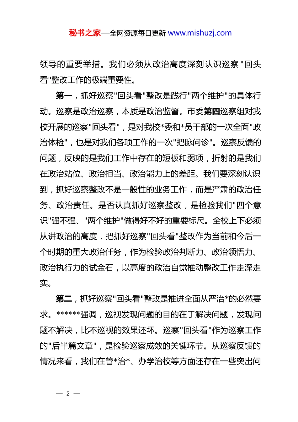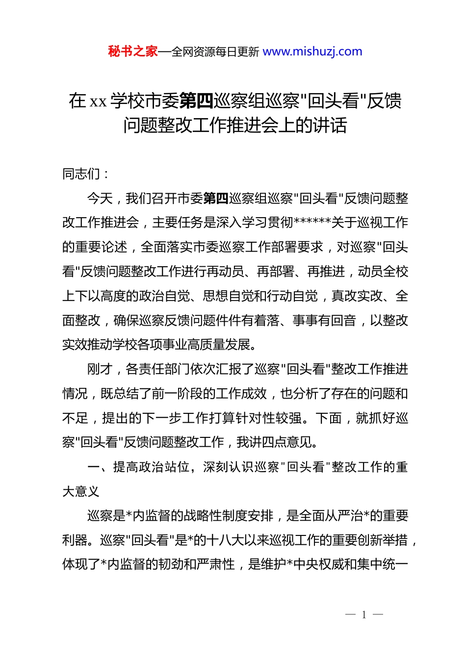 秘书之家—全网资源每日更新 www.mishuzj.com在 xx 学校市委第四巡察组巡察"回头看"反馈问题整改工作推进会上的讲话同志们:今天,我们召开市委第四巡察组巡察"回头看"反馈问题整改工作推进会,主要任务是深入学习贯彻******关于巡视工作的重要论述,全面落实市委巡察工作部署要求,对巡察"回头看"反馈问题整改工作进行再动员、再部署、再推进,动员全校上下以高度的政治自觉、思想自觉和行动自觉,真改实改、全面整改,确保巡察反馈问题件件有着落、事事有回音,以整改实效推动学校各项事业高质量发展。刚才,各责任部门依次汇报了巡察"回头看"整改工作推进情况,既总结了前一阶段的工作成效,也分析了存在的问题和不足,提出的下一步工作打算针对性较强。下面,就抓好巡察"回头看"反馈问题整改工作,我讲四点意见。一、提高政治站位,深刻认识巡察"回头看"整改工作的重大意义巡察是*内监督的战略性制度安排,是全面从严治*的重要利器。巡察"回头看"是*的十八大以来巡视工作的重要创新举措,体现了*内监督的韧劲和严肃性,是维护*中央权威和集中统一— 1 —秘书之家—全网资源每日更新 www.mishuzj.com领导的重要举措。我们必须从政治高度深刻认识巡察 "回头看"整改工作的极端重要性。第一,抓好巡察"回头看"整改是践行"两个维护"的具体行动。巡察是政治巡察,本质是政治监督。市委第四巡察组对我校开展的巡察"回头看",是对我校*委和*员干部的一次全面"政治体检",也是对我们各项工作的一次"把脉问诊"。巡察反馈的问题,反映的是我们工作中存在的短板和弱项,折射的是我们在政治站位、政治担当、政治能力上的差距。我们要深刻认识到,抓好巡察整改不是一般性的业务工作,而是严肃的政治任务、政治责任。是否认真抓好巡察整改,是检验我们"四个意识"强不强、"两个维护"做得好不好的重要标尺。全校上下必须从讲政治的高度,把抓好巡察"回头看"整改作为当前和今后一个时期的重大政治任务,作为检验政治判断力、政治领悟力、政治执行力的试金石,以高度的政治自觉推动整改工作走深走实。第二,抓好巡察"回头看"整改是推进全面从严治*的必然要求。******强调,巡视发现问题的目的在于解决问题,发现问题不解决,比不巡视的效果还坏。巡察"回头看"作为巡察工作的"后半篇文章",是检验巡察成效的关键环节。从巡察反馈的情况来看,我们在管*治*、办学治校等方面还存在一些突出问— 2 —秘书之家—全网资源每日更新 www.mishuzj.com题,有些问题在之前的巡察整改中没有完全整改到位,出现了反弹回潮,有些问题是新发现的深层次问题。这些问题如果得不到有效解决,就会侵蚀*的执政根基,损害学校的发展根基。我们绝不能有"过关"思想、"交卷"心态,绝不能搞虚假整改、文字整改、数字整改。必须以刀刃向内的勇气、刮骨疗毒的决心,真刀真枪解决问题,真正使整改过程成为推进全面从严治*向纵深发展的过程。第三,抓好巡察"回头看"整改是推动学校高质量发展的强大动力。近年来,我校在市委市政府的坚强领导下,坚持立德树人根本任务,深化改革创新,办学实力和水平稳步提升。但我们也要清醒地看到,学校发展还面临不少困难和挑战,内涵建设、特色发展、治理能力等方面还存在明显短板。巡察反馈的问题,很多都直指制约学校发展的瓶颈问题。我们必须把巡察整改与学校中心工作紧密结合起来,把整改成效转化为推动学校高质量发展的强大动力,通过解决一个个具体问题,破解一个个发展难题,不断完善治理体系、提升治理能力,为建设特色鲜明的高水平学校奠定坚实基础。二、坚持问题导向,全面聚焦整改工作的重点领域和关键环节巡察"回头看"反馈的问题涉及面广、内容丰富,既有共性— 3 —秘书之家—全网资源每日更新 www.mishuzj.com问题,也有个性问题;既有历史遗留问题,也有新形势下出现的新问题。我们必须坚持问题导向,抓住主要矛盾和矛盾的主要方面,聚焦重点领域和关键环节,精准发力、靶向治疗,确保整改工作取得实实在在的成效。第一,聚焦师德师风建设,在锻造高素质专业化教师队伍上见实效。百年大计,教育为本;教育大计,教师为本。师德师风是评价教师队伍素质的第一标准...