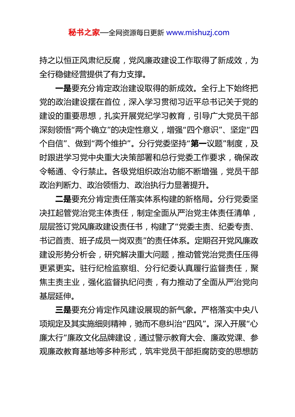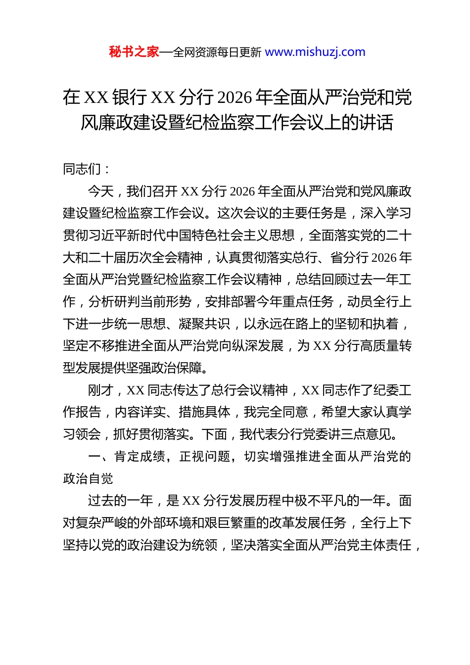 秘书之家—全网资源每日更新 www.mishuzj.com在 XX 银行 XX 分行 2026 年全面从严治党和党风廉政建设暨纪检监察工作会议上的讲话 同志们:今天,我们召开 XX 分行 2026 年全面从严治党和党风廉政建设暨纪检监察工作会议。这次会议的主要任务是,深入学习贯彻习近平新时代中国特色社会主义思想,全面落实党的二十大和二十届历次全会精神,认真贯彻落实总行、省分行 2026 年全面从严治党暨纪检监察工作会议精神,总结回顾过去一年工作,分析研判当前形势,安排部署今年重点任务,动员全行上下进一步统一思想、凝聚共识,以永远在路上的坚韧和执着,坚定不移推进全面从严治党向纵深发展,为 XX 分行高质量转型发展提供坚强政治保障。刚才,XX 同志传达了总行会议精神,XX 同志作了纪委工作报告,内容详实、措施具体,我完全同意,希望大家认真学习领会,抓好贯彻落实。下面,我代表分行党委讲三点意见。一、肯定成绩,正视问题,切实增强推进全面从严治党的政治自觉过去的一年,是 XX 分行发展历程中极不平凡的一年。面对复杂严峻的外部环境和艰巨繁重的改革发展任务,全行上下坚持以党的政治建设为统领,坚决落实全面从严治党主体责任,秘书之家—全网资源每日更新 www.mishuzj.com持之以恒正风肃纪反腐,党风廉政建设工作取得了新成效,为全行稳健经营提供了有力支撑。一是要充分肯定政治建设取得的新成效。全行上下始终把党的政治建设摆在首位,深入学习贯彻习近平总书记关于党的建设的重要思想,扎实开展党纪学习教育,引导广大党员干部“”深刻领悟 两个确立 的决定性意义,“”“增强 四个意识 、坚定 四”“”“个自信 、做到 两个维护 。分行党委坚持 第一”议题 制度,及时跟进学习党中央重大决策部署和总行党委工作要求,确保政令畅通、令行禁止。各级党组织政治功能不断增强,党员干部政治判断力、政治领悟力、政治执行力显著提升。二是要充分肯定责任落实体系构建的新格局。分行党委坚决扛起管党治党主体责任,制定全面从严治党主体责任清单,层层签订党风廉政建设责任书,“构建了 党委主责、纪委专责、”书记首责、班子成员一岗双责 的责任体系。定期召开党风廉政建设形势分析会,研究解决重大问题,推动管党治党责任压得更紧更实。驻行纪检监察组、分行纪委认真履行监督责任,聚焦主责主业,强化监督执纪问责,有力推动了全面从严治党向基层延伸。三是要充分肯定作风建设展现的新气象。严格落实中央八项规定及其实施细则精神,“”“驰而不息纠治 四风 。深入开展 心”廉太行 廉政文化品牌建设,通过警示教育大会、廉政党课、参观廉政教育基地等多种形式,筑牢党员干部拒腐防变的思想防秘书之家—全网资源每日更新 www.mishuzj.com线。持续深化纠治形式主义、官僚主义,切实为基层减负,全行上下干事创业的氛围更加浓厚。紧盯重要节点,开展明察暗访,严查违规吃喝、公车私用等问题,党风行风持续好转。四是要充分肯定监督执纪工作的新成果。分行纪委坚持严的基调不动摇,“”精准运用监督执纪 四种形态 ,抓早抓小、防微杜渐。紧盯信贷审批、不良资产处置、招标采购等重点领域,开展专项监督检查,严肃查处违规违纪问题。加强员工行为管理,深入开展员工异常行为排查,“特别是对员工 八小时以”外 活动进行了有效监督。过去一年,我们通过自查自纠发现并整改了一批问题,处理了个别违规人员,起到了有力的震慑作用,维护了制度刚性,守护了全行发展的根基。在肯定成绩的同时,我们也要清醒地认识到,全面从严治党永远在路上,党风廉政建设和反腐败斗争形势依然严峻复“”杂。对照总行党委提出的 六个重点领域 风险防控要求,对照省分行警示教育大会通报的典型案例,我们工作中还存在不少短板和弱项,必须引起高度重视。一是要深刻剖析信贷审批投放领域的风险隐患。信贷业务是我们银行的核心业务,也是廉洁风险的高发区。从内外部检查和审计情况看,个别机构在信贷审批中存在把关不严、程序不规范的问题;个别客户经理存在利用职务便利吃拿卡要、违规放贷的现象;甚至极个别人与不法中介勾结,进行利益输秘书之家—全网...
