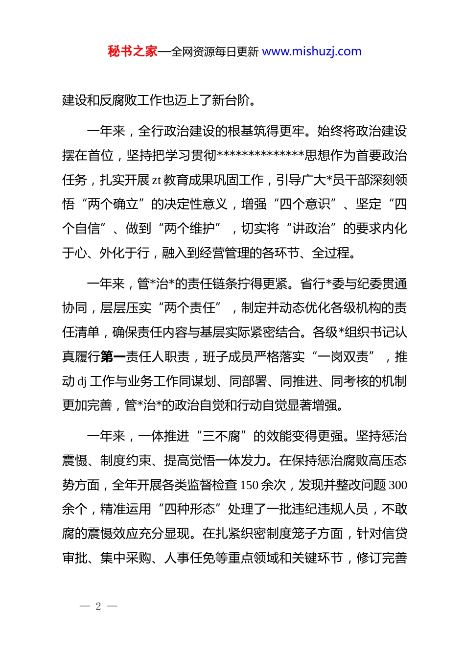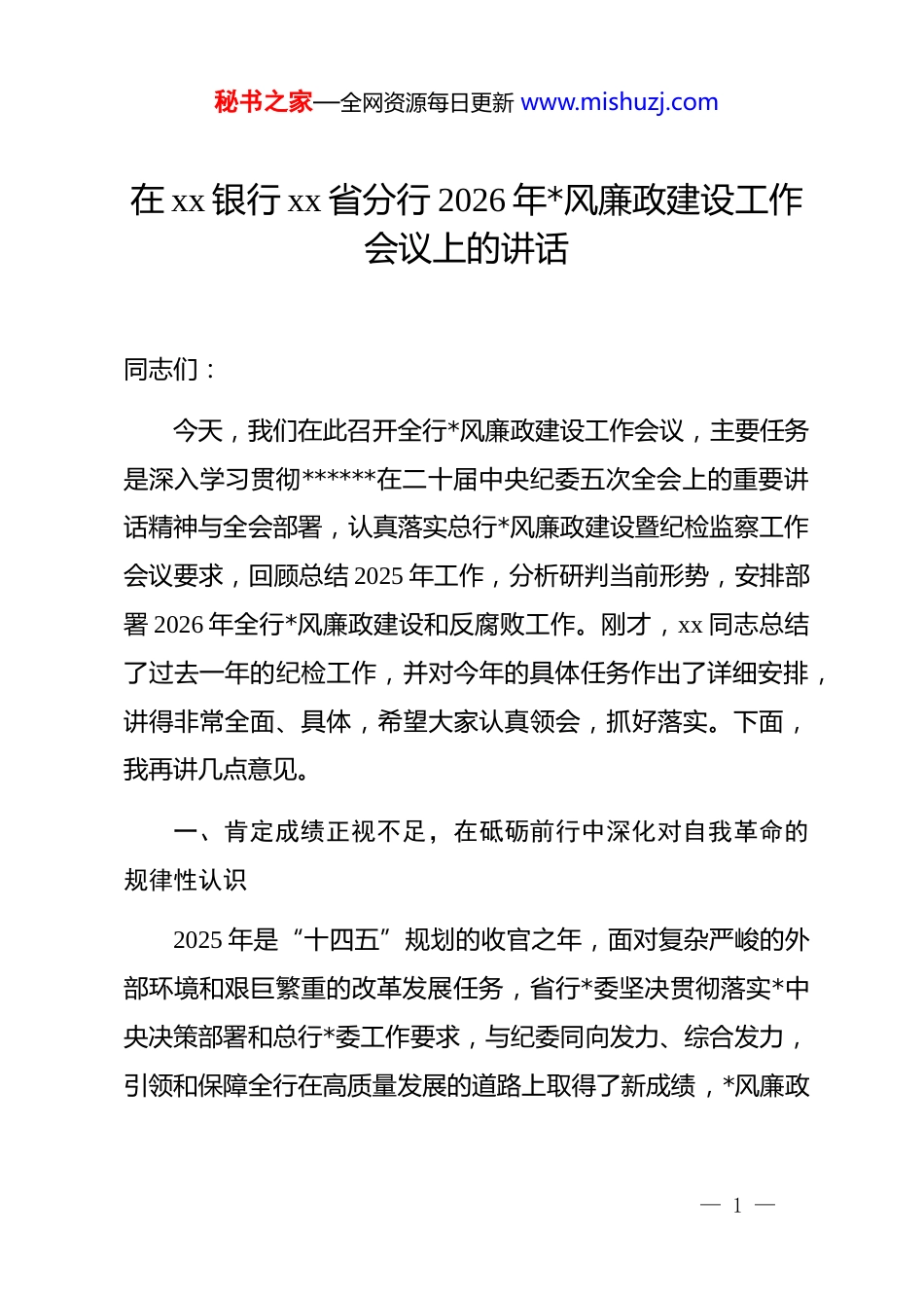 秘书之家—全网资源每日更新 www.mishuzj.com在 xx 银行 xx 省分行 2026 年*风廉政建设工作会议上的讲话同志们:今天,我们在此召开全行*风廉政建设工作会议,主要任务是深入学习贯彻******在二十届中央纪委五次全会上的重要讲话精神与全会部署,认真落实总行*风廉政建设暨纪检监察工作会议要求,回顾总结 2025 年工作,分析研判当前形势,安排部署 2026 年全行*风廉政建设和反腐败工作。刚才,xx 同志总结了过去一年的纪检工作,并对今年的具体任务作出了详细安排,讲得非常全面、具体,希望大家认真领会,抓好落实。下面,我再讲几点意见。一、肯定成绩正视不足,在砥砺前行中深化对自我革命的规律性认识2025 年是“十四五”规划的收官之年,面对复杂严峻的外部环境和艰巨繁重的改革发展任务,省行*委坚决贯彻落实*中央决策部署和总行*委工作要求,与纪委同向发力、综合发力,引领和保障全行在高质量发展的道路上取得了新成绩,*风廉政— 1 —秘书之家—全网资源每日更新 www.mishuzj.com建设和反腐败工作也迈上了新台阶。一年来,全行政治建设的根基筑得更牢。始终将政治建设摆在首位,坚持把学习贯彻**************思想作为首要政治任务,扎实开展 zt 教育成果巩固工作,引导广大*员干部深刻领悟“两个确立”的决定性意义,增强“四个意识”、坚定“四个自信”、做到“两个维护”,切实将“讲政治”的要求内化于心、外化于行,融入到经营管理的各环节、全过程。一年来,管*治*的责任链条拧得更紧。省行*委与纪委贯通协同,层层压实“两个责任”,制定并动态优化各级机构的责任清单,确保责任内容与基层实际紧密结合。各级*组织书记认真履行第一责任人职责,班子成员严格落实“一岗双责”,推动 dj 工作与业务工作同谋划、同部署、同推进、同考核的机制更加完善,管*治*的政治自觉和行动自觉显著增强。一年来,一体推进“三不腐”的效能变得更强。坚持惩治震慑、制度约束、提高觉悟一体发力。在保持惩治腐败高压态势方面,全年开展各类监督检查 150 余次,发现并整改问题 300余个,精准运用“四种形态”处理了一批违纪违规人员,不敢腐的震慑效应充分显现。在扎紧织密制度笼子方面,针对信贷审批、集中采购、人事任免等重点领域和关键环节,修订完善— 2 —秘书之家—全网资源每日更新 www.mishuzj.com相关制度 20 余项,不能腐的约束机制更加健全。在筑牢拒腐防变思想堤坝方面,组织开展“廉政教育主题月”活动,举办专题讲座 12 场,组织观看警示教育片 25 部,参与*员干部超过8000 人次。“扬子清风”廉洁文化品牌建设持续深化,基层网点“清风小家”文化阵地实现提档升级和全面覆盖,不想腐的思想根基愈发坚实。一年来,激浊扬清的作风生态育得更优。严格落实中央八项规定精神,对“四风”问题露头就打、寸步不让。持续深化为基层减负,精简会议文件,优化考核指标,推动部门协同,让基层员工有更多时间和精力投入到服务客户、拓展市场和防控风险上。大力弘揚重实干、重实绩、重担当的选人用人导向,一批想干事、能干事、干成事的干部得到提拔重用,风清气正、干事创业的良好氛围日益浓厚。在肯定成绩的同时,也必须清醒地看到,对照*中央的要求和全行干部员工的期盼,我们的工作还存在一些差距和不足。比如,少数单位的政治监督还不够精准有力,与业务发展的融合度有待提升;个别领域的廉洁风险依然存在,内控管理仍有薄弱环节;形式主义、官僚主义等顽瘴痼疾尚未根除,为基层减负的长效机制仍需巩固;少数干部的担当精神和斗争本领还— 3 —秘书之家—全网资源每日更新 www.mishuzj.com有待加强。对于这些问题,必须高度重视,采取有力措施,切实加以解决。二、认清形势保持清醒,深刻把握新征程上*风廉政建设和反腐败斗争的艰巨性复杂性2026 年是实施“十五五”规划的开局之年,做好今年的*风廉政建设和反腐败工作,对于保障全行开好局、起好步,意义重大,影响深远。******在二十届中央纪委五次全会上的重要讲话,深刻总结了新时代全面从严治*取得的丰富成果和宝贵经验,精辟论述了*的自我革命的重要思想,科学回答了关于*的自我...