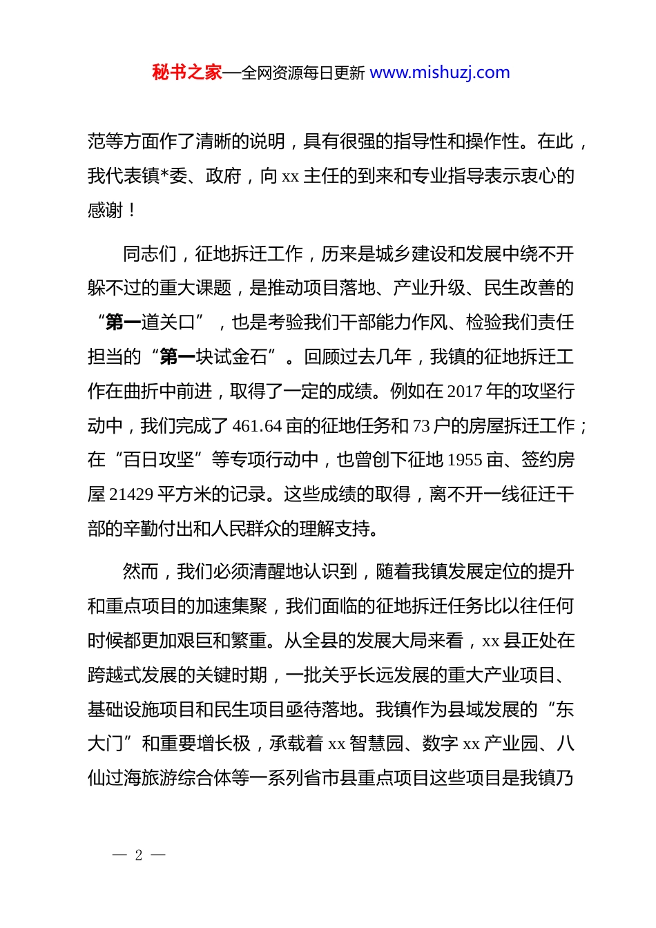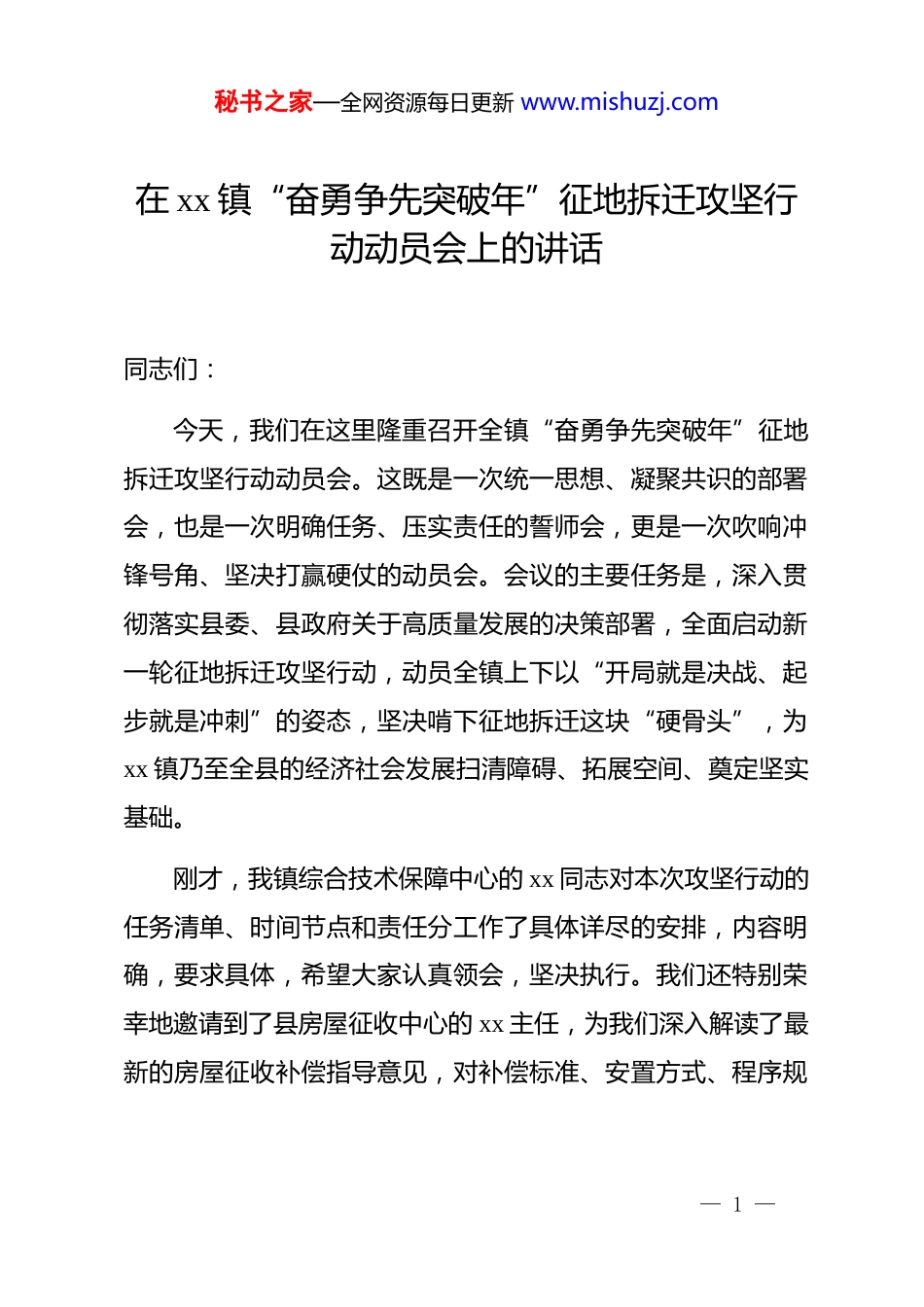 秘书之家—全网资源每日更新 www.mishuzj.com在 xx 镇“奋勇争先突破年”征地拆迁攻坚行动动员会上的讲话同志们:今天,我们在这里隆重召开全镇“奋勇争先突破年”征地拆迁攻坚行动动员会。这既是一次统一思想、凝聚共识的部署会,也是一次明确任务、压实责任的誓师会,更是一次吹响冲锋号角、坚决打赢硬仗的动员会。会议的主要任务是,深入贯彻落实县委、县政府关于高质量发展的决策部署,全面启动新一轮征地拆迁攻坚行动,动员全镇上下以“开局就是决战、起步就是冲刺”的姿态,坚决啃下征地拆迁这块“硬骨头”,为xx 镇乃至全县的经济社会发展扫清障碍、拓展空间、奠定坚实基础。刚才,我镇综合技术保障中心的 xx 同志对本次攻坚行动的任务清单、时间节点和责任分工作了具体详尽的安排,内容明确,要求具体,希望大家认真领会,坚决执行。我们还特别荣幸地邀请到了县房屋征收中心的 xx 主任,为我们深入解读了最新的房屋征收补偿指导意见,对补偿标准、安置方式、程序规— 1 —秘书之家—全网资源每日更新 www.mishuzj.com范等方面作了清晰的说明,具有很强的指导性和操作性。在此,我代表镇*委、政府,向 xx 主任的到来和专业指导表示衷心的感谢!同志们,征地拆迁工作,历来是城乡建设和发展中绕不开躲不过的重大课题,是推动项目落地、产业升级、民生改善的“第一道关口”,也是考验我们干部能力作风、检验我们责任担当的“第一块试金石”。回顾过去几年,我镇的征地拆迁工作在曲折中前进,取得了一定的成绩。例如在 2017 年的攻坚行动中,我们完成了 461.64 亩的征地任务和 73 户的房屋拆迁工作;在“百日攻坚”等专项行动中,也曾创下征地 1955 亩、签约房屋 21429 平方米的记录。这些成绩的取得,离不开一线征迁干部的辛勤付出和人民群众的理解支持。然而,我们必须清醒地认识到,随着我镇发展定位的提升和重点项目的加速集聚,我们面临的征地拆迁任务比以往任何时候都更加艰巨和繁重。从全县的发展大局来看,xx 县正处在跨越式发展的关键时期,一批关乎长远发展的重大产业项目、基础设施项目和民生项目亟待落地。我镇作为县域发展的“东大门”和重要增长极,承载着 xx 智慧园、数字 xx 产业园、八仙过海旅游综合体等一系列省市县重点项目这些项目是我镇乃— 2 —秘书之家—全网资源每日更新 www.mishuzj.com至全县未来发展的希望所在、潜力所在。项目等不了,发展慢不得,我们必须通过征地拆迁为这些“金娃娃”项目提供土地要素保障。从我镇自身的发展需求来看,无论是推进乡村振兴战略,还是优化产业布局、完善城镇功能、改善人居环境,都需要通过征地拆迁来打破瓶颈、优化空间。当前,我们工作中依然存在一些历史遗留问题和难点堵点。部分项目,如 xx 集团 xx 郡项目,其历史遗留问题虽然得到了初步破解但类似的复杂情况依然存在,成为了制约项目整体推进的“拦路虎”。群众的多元化诉求、个别遗留问题的复杂性、部分干部存在的畏难情绪,都是我们必须正视和克服的挑战。因此,县委将今年命名为“奋勇争先突破年”,我镇将征地拆迁作为“突破”的主战场,是形势所迫、发展所需、民心所向。据初步统计,本次“奋勇争先突破年”攻坚行动,全镇需要征收土地约 5000 亩,涉及房屋拆迁近 800 户,总面积超过15 万平方米。任务之重、时间之紧、要求之高,前所未有。我们已经没有退路,唯有迎难而上、背水一战。下面,我结合源材料和当前形势,讲三点意见。一、提高站位,凝聚共识,以“开弓没有回头箭”的决心— 3 —秘书之家—全网资源每日更新 www.mishuzj.com投身攻坚思想是行动的先导。打赢这场攻坚战,首先要打赢思想上的“破冰战”。全镇上下,特别是全体*员干部,必须深刻认识到这次征地拆迁攻坚行动的极端重要性和紧迫性,切实把思想和行动统一到县委、县政府的决策部署上来,统一到今天会议的要求上来。第一,要站在全局高度,深刻认识“为何征迁”。我们要清晰地告诉群众,也要反复地叩问自己,我们征地拆迁,不是为了某个人、某个单位的私利,而是为了 xx 镇的长远发展,为了全镇人民的共同福祉。是为了让高端产业...
