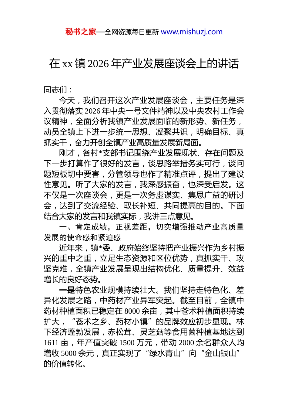 秘书之家—全网资源每日更新 www.mishuzj.com在 xx 镇 2026 年产业发展座谈会上的讲话同志们:今天,我们召开这次产业发展座谈会,主要任务是深入贯彻落实 2026 年中央一号文件精神以及中央农村工作会议精神,全面分析我镇产业发展面临的新形势、新任务,动员全镇上下进一步统一思想、凝聚共识,明确目标、真抓实干,奋力开创全镇产业高质量发展新局面。刚才,各村*支部书记围绕产业发展现状、存在问题及下一步打算作了很好的发言,谈思路举措务实可行,谈问题短板切中要害,分管领导也作了精准点评,提出了建设性意见。听了大家的发言,我深感振奋,也深受启发。这不仅是一次座谈会,更是一次务虚谋实、集思广益的研讨会,达到了交流经验、取长补短、共同提高的目的。下面结合大家的发言和我镇实际,我讲三点意见。一、肯定成绩,正视差距,切实增强推动产业高质量发展的使命感和紧迫感近年来,镇*委、政府始终坚持把产业振兴作为乡村振兴的重中之重,立足生态资源和区位优势,真抓实干、攻坚克难,全镇产业发展呈现出结构优化、质量提升、效益增长的良好态势。一是特色农业规模持续壮大。我们坚持走特色化、差异化发展之路,中药材产业异军突起。截至目前,全镇中药材种植面积已稳定在 8000 余亩,其中苍术种植面积持续扩大,“苍术之乡、药材小镇”的品牌效应初步显现。林下经济蓬勃发展,赤松茸、灵芝菇等食用菌种植基地达到1611 亩,年产值突破 1500 万元,带动 2000 余名群众人均增收 5000 余元,真正实现了“绿水青山”向“金山银山”的价值转化。秘书之家—全网资源每日更新 www.mishuzj.com二是文旅融合步伐明显加快。我们深入实施“旅游兴镇”战略,依托得天独厚的自然资源,大力发展民宿产业xx 宿集村项目一期已顺利运营,总投资超过 4000 万元,成功盘活 6 处空心村资源,建成高端民宿超过 10 家。2025 年以来,全镇累计接待游客 80.64 万人次,实现旅游综合销售额 8300 万元,农家乐、民宿接待游客 22 万人次,带动土特产销售近 700 万斤。特别是通过“政府主导+企业运营+村民参与”的模式,直接带动就业超 700 人,户均增收 1 万元,农文旅融合发展的红利正在加速释放。三是村集体经济活力不断增强。各村立足实际,积极探索资源发包、物业出租、居间服务、股份合作等多样化发展途径,村集体经济收入稳步增长。xx 村被认定为自治区第一批农文旅融合示范村,为全镇树立了标杆。在肯定成绩的同时,我们也要清醒地认识到,当前我镇产业发展还面临不少困难和挑战:一是产业链条依然较短,农产品精深加工能力不足,产品附加值有待提高;二是品牌影响力还不够强,虽然有了“xx 宿集”“xx药材”等雏形,但市场知名度、美誉度还有很大提升空间;三是村集体经济发展不平衡,部分村“造血”功能不强,增收渠道单一;四是部分干部思想解放程度不够,对新产业、新业态的谋划和推动力度还需加大。对此,我们必须高度重视,采取有力措施,切实加以解决。二、聚焦重点,精准发力,全力以赴推动产业转型升级提质增效2026 年是“十五五”规划的开局之年,也是巩固拓展脱贫攻坚成果同乡村振兴有效衔接的关键之年。今年中央一号文件《关于锚定农业农村现代化扎实推进乡村全面振兴的意见》明确提出,要“培育壮大县域富民产业”“深秘书之家—全网资源每日更新 www.mishuzj.com化农文旅融合”“因地制宜发展新型农村集体经济”。这为我们指明了方向、提供了遵循。我们要抢抓政策机遇,坚持精准发力,推动全镇产业发展迈上新台阶。(一)聚焦做大做强特色农业,夯实产业发展根基产业兴旺,重点在特色。我们要继续深耕中药材产业,做好“土特产”这篇大文章。一要扩大规模提效益。依托现有种植基础,进一步优化产业布局,支持发展苍术、赤芍、五味子等道地药材种植,力争 2026 年全镇中药材种植面积突破 9000 亩。要积极推广“林+药+菌”立体种养模式,提高土地利用率和产出效益。二要延伸链条增价值。积极引进和培育农产品精深加工企业,推动中药材产业从单纯种植向加工、流通、销售全链条延伸,提升产品附加值。三要打造品牌拓市场。要加强...