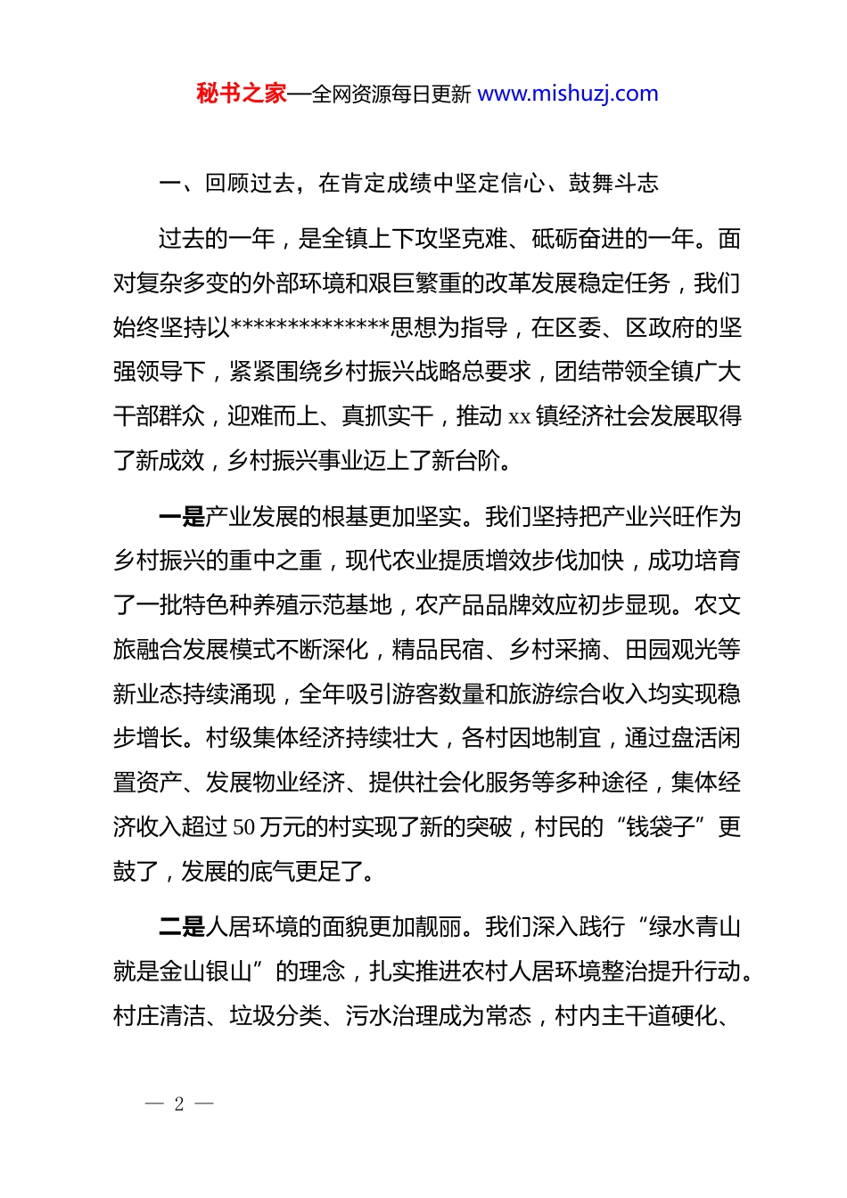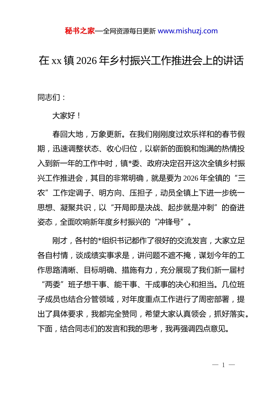 秘书之家—全网资源每日更新 www.mishuzj.com在 xx 镇 2026 年乡村振兴工作推进会上的讲话同志们:大家好!春回大地,万象更新。在我们刚刚度过欢乐祥和的春节假期,迅速调整状态、收心归位,以崭新的面貌和饱满的热情投入到新一年的工作中时,镇*委、政府决定召开这次全镇乡村振兴工作推进会,其目的非常明确,就是要为 2026 年全镇的“三农”工作定调子、明方向、压担子,动员全镇上下进一步统一思想、凝聚共识,以“开局即是决战、起步就是冲刺”的奋进姿态,全面吹响新年度乡村振兴的“冲锋号”。刚才,各村的*组织书记都作了很好的交流发言,大家立足各自村情,谈成绩实事求是,讲问题不遮不掩,谋划今年的工作思路清晰、目标明确、措施有力,充分展现了我们新一届村“两委”班子想干事、能干事、干成事的决心和担当。几位班子成员也结合分管领域,对年度重点工作进行了周密部署,提出了具体要求,我都完全赞同,希望大家认真领会,抓好落实。下面,结合同志们的发言和我的思考,我再强调四点意见。— 1 —秘书之家—全网资源每日更新 www.mishuzj.com一、回顾过去,在肯定成绩中坚定信心、鼓舞斗志过去的一年,是全镇上下攻坚克难、砥砺奋进的一年。面对复杂多变的外部环境和艰巨繁重的改革发展稳定任务,我们始终坚持以**************思想为指导,在区委、区政府的坚强领导下,紧紧围绕乡村振兴战略总要求,团结带领全镇广大干部群众,迎难而上、真抓实干,推动 xx 镇经济社会发展取得了新成效,乡村振兴事业迈上了新台阶。一是产业发展的根基更加坚实。我们坚持把产业兴旺作为乡村振兴的重中之重,现代农业提质增效步伐加快,成功培育了一批特色种养殖示范基地,农产品品牌效应初步显现。农文旅融合发展模式不断深化,精品民宿、乡村采摘、田园观光等新业态持续涌现,全年吸引游客数量和旅游综合收入均实现稳步增长。村级集体经济持续壮大,各村因地制宜,通过盘活闲置资产、发展物业经济、提供社会化服务等多种途径,集体经济收入超过 50 万元的村实现了新的突破,村民的“钱袋子”更鼓了,发展的底气更足了。二是人居环境的面貌更加靓丽。我们深入践行“绿水青山就是金山银山”的理念,扎实推进农村人居环境整治提升行动。村庄清洁、垃圾分类、污水治理成为常态,村内主干道硬化、— 2 —秘书之家—全网资源每日更新 www.mishuzj.com亮化、绿化水平显著提升,一批“口袋公园”“微景观”点缀其间,“推窗见绿、出门入园”正在从梦想变为现实。我们成功创建了一批区级美丽乡村示范村,xx 镇的乡村风貌,正在成为我们引以为傲的靓丽名片。三是基层治理的效能更加彰显。我们坚持 dj 引领,不断夯实基层战斗堡垒。村“两委”换届工作圆满完成,一批有能力、有情怀、有担当的优秀人才进入班子,为乡村振兴注入了新鲜血液。我们深化网格化管理服务体系,将*的领导触角延伸到最基层,有效解决了一大批群众关心的热点难点问题。平安建设、法治乡村建设深入推进,社会大局保持和谐稳定,人民群众的获得感、幸福感、安全感持续攀升。这些成绩的取得,是上级*委政府正确领导的结果,更是全镇广大干部群众,特别是在座各位村*组织书记、村“两委”班子成员团结拼搏、辛勤付出的结果。在此,我代表镇*委、政府,向大家表示衷心的感谢和崇高的敬意!二、认清形势,在正视挑战中找准方位、明确航向在肯定成绩的同时,我们更要清醒地认识到,对标乡村振兴的更高要求,对照人民群众的更美期盼,我们的工作还存在— 3 —秘书之家—全网资源每日更新 www.mishuzj.com不少短板和弱项。比如,产业结构还不够优化,龙头企业带动能力不强,产业链条短、附加值低的问题依然突出;村与村之间的发展还不平衡,部分村集体经济基础薄弱,自我“造血”功能不足;基础设施和公共服务体系仍有欠账,教育、医疗、养老等领域与群众的期望还有差距;少数干部的思想观念、能力本领还跟不上新时代新任务的要求,存在“等靠要”思想和能力恐慌。同志们,2026 年是全面贯彻落实*的二十大精神的关键之年,也是实施“十四五”规划承上启下的攻坚之年。我们必须胸怀“国之大者”,深刻认识...