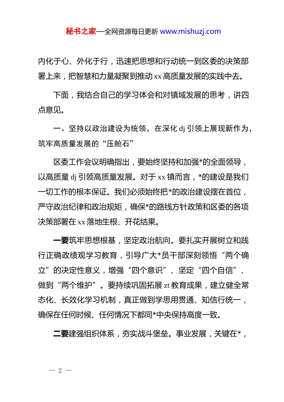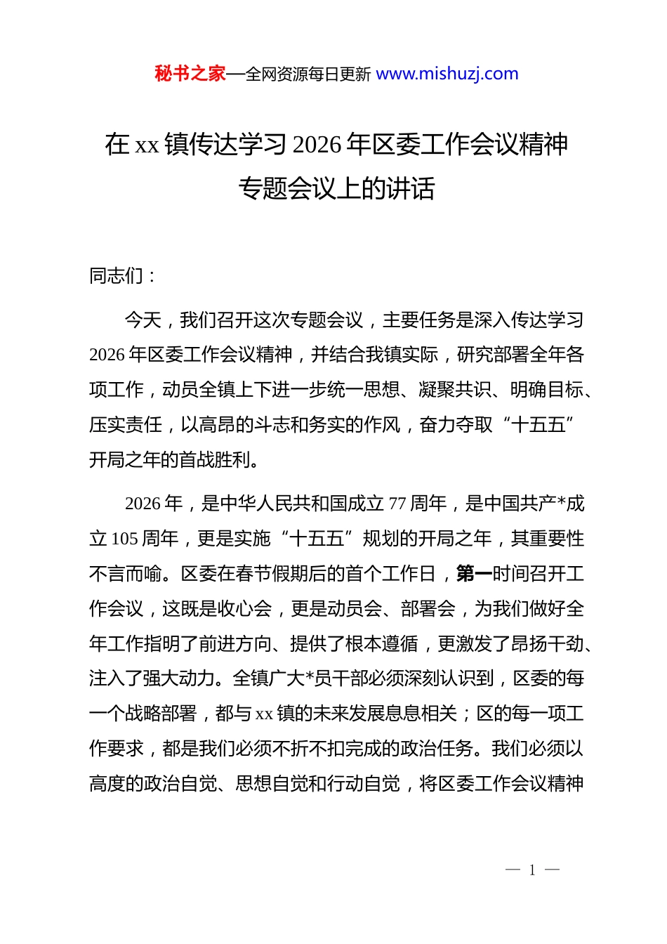 秘书之家—全网资源每日更新 www.mishuzj.com在 xx 镇传达学习 2026 年区委工作会议精神专题会议上的讲话同志们:今天,我们召开这次专题会议,主要任务是深入传达学习2026 年区委工作会议精神,并结合我镇实际,研究部署全年各项工作,动员全镇上下进一步统一思想、凝聚共识、明确目标、压实责任,以高昂的斗志和务实的作风,奋力夺取“十五五”开局之年的首战胜利。2026 年,是中华人民共和国成立 77 周年,是中国共产*成立 105 周年,更是实施“十五五”规划的开局之年,其重要性不言而喻。区委在春节假期后的首个工作日,第一时间召开工作会议,这既是收心会,更是动员会、部署会,为我们做好全年工作指明了前进方向、提供了根本遵循,更激发了昂扬干劲、注入了强大动力。全镇广大*员干部必须深刻认识到,区委的每一个战略部署,都与 xx 镇的未来发展息息相关;区的每一项工作要求,都是我们必须不折不扣完成的政治任务。我们必须以高度的政治自觉、思想自觉和行动自觉,将区委工作会议精神— 1 —秘书之家—全网资源每日更新 www.mishuzj.com内化于心、外化于行,迅速把思想和行动统一到区委的决策部署上来,把智慧和力量凝聚到推动 xx 高质量发展的实践中去。下面,我结合自己的学习体会和对镇域发展的思考,讲四点意见。一、坚持以政治建设为统领,在深化 dj 引领上展现新作为,筑牢高质量发展的“压舱石”区委工作会议明确指出,要始终坚持和加强*的全面领导,以高质量 dj 引领高质量发展。对于 xx 镇而言,*的建设是我们一切工作的根本保证。我们必须始终把*的政治建设摆在首位,严守政治纪律和政治规矩,确保*的路线方针政策和区委的各项决策部署在 xx 落地生根、开花结果。一要筑牢思想根基,坚定政治航向。要扎实开展树立和践行正确政绩观学习教育,引导广大*员干部深刻领悟“两个确立”的决定性意义,增强“四个意识”、坚定“四个自信”、做到“两个维护”。要持续巩固拓展 zt 教育成果,建立健全常态化、长效化学习机制,真正做到学思用贯通、知信行统一,确保在任何时候、任何情况下都同*中央保持高度一致。二要建强组织体系,夯实战斗堡垒。事业发展,关键在*,— 2 —秘书之家—全网资源每日更新 www.mishuzj.com关键在人。我们要深入践行新时代*的组织路线,以提升组织力为重点,突出政治功能,全面建强基层*组织。要持续推行 dj重点任务清单化管理和“三会一课”预审制度,确保基层*组织生活严谨规范、富有实效。要深化打造“xx 先锋”dj 品牌,充分借鉴和推广 xx 村等先进典型的“四链”工作法经验,即建强组织链、壮大产业链、优化治理链、延伸服务链,推动 dj 工作与中心工作深度融合,让每一个支部都成为一座坚不可摧的堡垒,每一名*员都成为一面光彩夺目的旗帜。三要锻造过硬队伍,激发干事活力。实现高质量发展,必须有一支政治过硬、本领高强、作风优良的干部队伍。我们要健全干部“选育管用”全链条机制,坚持在项目建设、招商引资、乡村振兴、信访维稳等一线考察识别干部,把敢不敢扛事、愿不愿做事、能不能干事作为识别干部、评判优劣、奖惩升降的重要标准。要加强专业化能力培训和实践锻炼,着力打造一支“一专多能、善打硬仗”的 xx 铁军,为全镇发展提供坚强的人才支撑。二、坚持以经济建设为中心,在推动产业升级上实现新突破,培育跨越式发展的“强引擎”发展是第一要务。区委工作会议强调,要坚定不移推动经— 3 —秘书之家—全网资源每日更新 www.mishuzj.com济高质量发展,为建设国际一流的战略科技融合发展示范区奠定坚实基础。xx 镇作为 xx 区的重要组成部分,必须在区域经济发展大局中找准定位、主动作为,全力以赴强经济、稳增长。一要把招商引资作为“主引擎”。经济发展的活力源于源源不断的新项目、好项目。我们必须牢固树立“项目为王”的理念,把招商引资作为经济工作的“生命线”。要坚持“谋、招、推、进”全链条发力,围绕我镇生态涵养、文化旅游、现代农业等功能定位,精准谋划一批符合产业导向、具有发展潜力的优质项目。要创新招商方式,深化“以商招商、以企引企”模式,主...