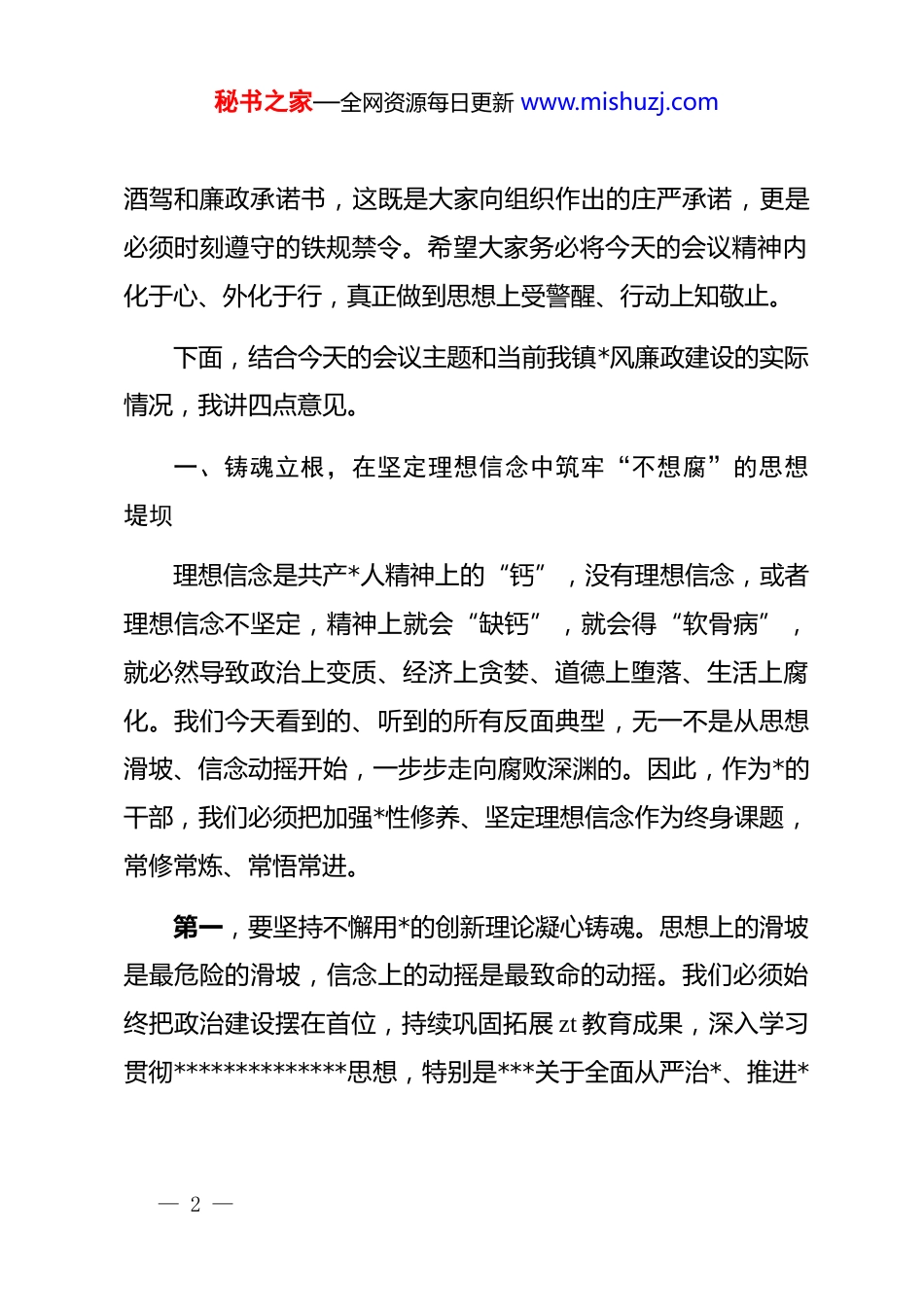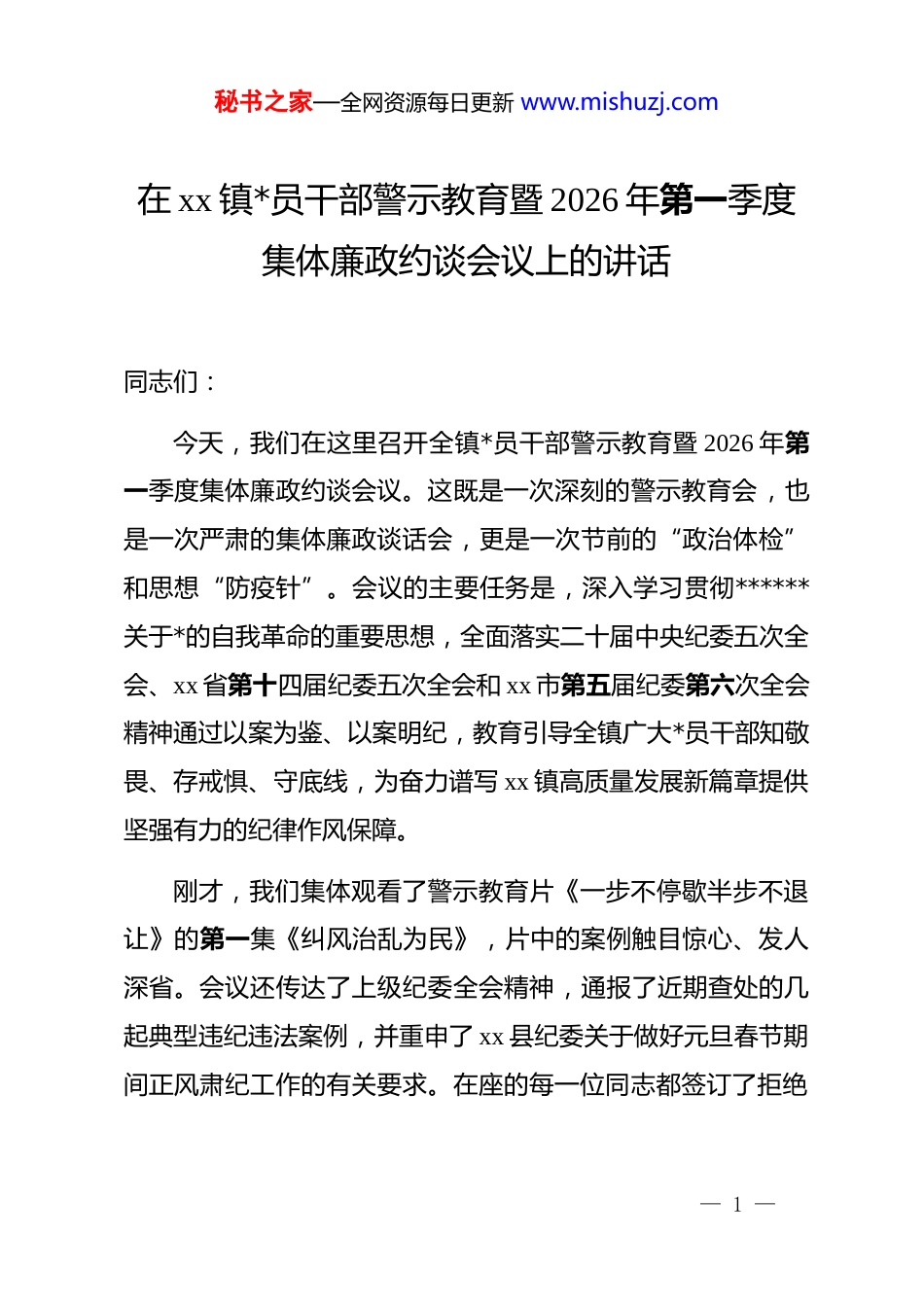 秘书之家—全网资源每日更新 www.mishuzj.com在 xx 镇*员干部警示教育暨 2026 年第一季度集体廉政约谈会议上的讲话同志们:今天,我们在这里召开全镇*员干部警示教育暨 2026 年第一季度集体廉政约谈会议。这既是一次深刻的警示教育会,也是一次严肃的集体廉政谈话会,更是一次节前的“政治体检”和思想“防疫针”。会议的主要任务是,深入学习贯彻******关于*的自我革命的重要思想,全面落实二十届中央纪委五次全会、xx 省第十四届纪委五次全会和 xx 市第五届纪委第六次全会精神通过以案为鉴、以案明纪,教育引导全镇广大*员干部知敬畏、存戒惧、守底线,为奋力谱写 xx 镇高质量发展新篇章提供坚强有力的纪律作风保障。刚才,我们集体观看了警示教育片《一步不停歇半步不退让》的第一集《纠风治乱为民》,片中的案例触目惊心、发人深省。会议还传达了上级纪委全会精神,通报了近期查处的几起典型违纪违法案例,并重申了 xx 县纪委关于做好元旦春节期间正风肃纪工作的有关要求。在座的每一位同志都签订了拒绝— 1 —秘书之家—全网资源每日更新 www.mishuzj.com酒驾和廉政承诺书,这既是大家向组织作出的庄严承诺,更是必须时刻遵守的铁规禁令。希望大家务必将今天的会议精神内化于心、外化于行,真正做到思想上受警醒、行动上知敬止。下面,结合今天的会议主题和当前我镇*风廉政建设的实际情况,我讲四点意见。一、铸魂立根,在坚定理想信念中筑牢“不想腐”的思想堤坝理想信念是共产*人精神上的“钙”,没有理想信念,或者理想信念不坚定,精神上就会“缺钙”,就会得“软骨病”,就必然导致政治上变质、经济上贪婪、道德上堕落、生活上腐化。我们今天看到的、听到的所有反面典型,无一不是从思想滑坡、信念动摇开始,一步步走向腐败深渊的。因此,作为*的干部,我们必须把加强*性修养、坚定理想信念作为终身课题,常修常炼、常悟常进。第一,要坚持不懈用*的创新理论凝心铸魂。思想上的滑坡是最危险的滑坡,信念上的动摇是最致命的动摇。我们必须始终把政治建设摆在首位,持续巩固拓展 zt 教育成果,深入学习贯彻**************思想,特别是***关于全面从严治*、推进*— 2 —秘书之家—全网资源每日更新 www.mishuzj.com的自我革命的重要论述。要深刻认识到,全面从严治*永远在路上,*的自我革命永远在路上,反腐败斗争的“严”的主基调必须长期坚持。我们基层干部身处服务群众的“最后一公里”一言一行都代表着*和政府的形象,更要带头做*的创新理论的坚定信仰者和忠实实践者。要通过学习,不断提高政治判断力、政治领悟力、政治执行力,深刻领悟“两个确立”的决定性意义,坚决做到“两个维护”,确保在任何时候、任何情况下,都同以***同志为核心的*中央保持高度一致。第二,要树立和践行正确的政绩观。政绩为谁而树、树什么样的政绩、靠什么树政绩,是检验*员干部*性纯不纯、政绩观正不正的试金石。中共中央政治局在研究部署 2026 年*风廉政建设和反腐败工作时,特别强调要推动*员干部树立和践行正确政绩观。对我们乡镇干部而言,正确的政绩观,就是要把群众的安危冷暖放在心上,把发展的成果体现在村容村貌的改善和群众收入的增加上。要坚决杜绝那些只顾面子、不顾里子的“形象工程”,坚决纠治“翻烧饼”式的折腾和各种形式主义、官僚主义问题。我们的工作要经得起历史、实践和人民的检验。每一项工程的实施、每一笔资金的使用,都要想着是不是真正惠及了百姓,是不是真正推动了发展,绝不能为了个人的所谓— 3 —秘书之家—全网资源每日更新 www.mishuzj.com“政绩”,而损害集体和群众的利益。第三,要时刻牢记*员身份和入*初心。在座的各位,都是面对*旗宣过誓的。入*誓词中的每一句话,都是我们必须用一生去践行的政治承诺。但现实中,有的干部当官时间长了,就忘了自己是谁、为了谁、依靠谁;有的干部手中有点权力了,就忘了权力是人民赋予的,是用来为人民服务的。他们把*员身份当成谋取私利的“护身符”,把手中的权力异化为攫取利益的“工具”,最终害人害己。我们要经常性地开展“*性体检”,掸一掸思想上的灰尘,紧一紧纪律上的“发...