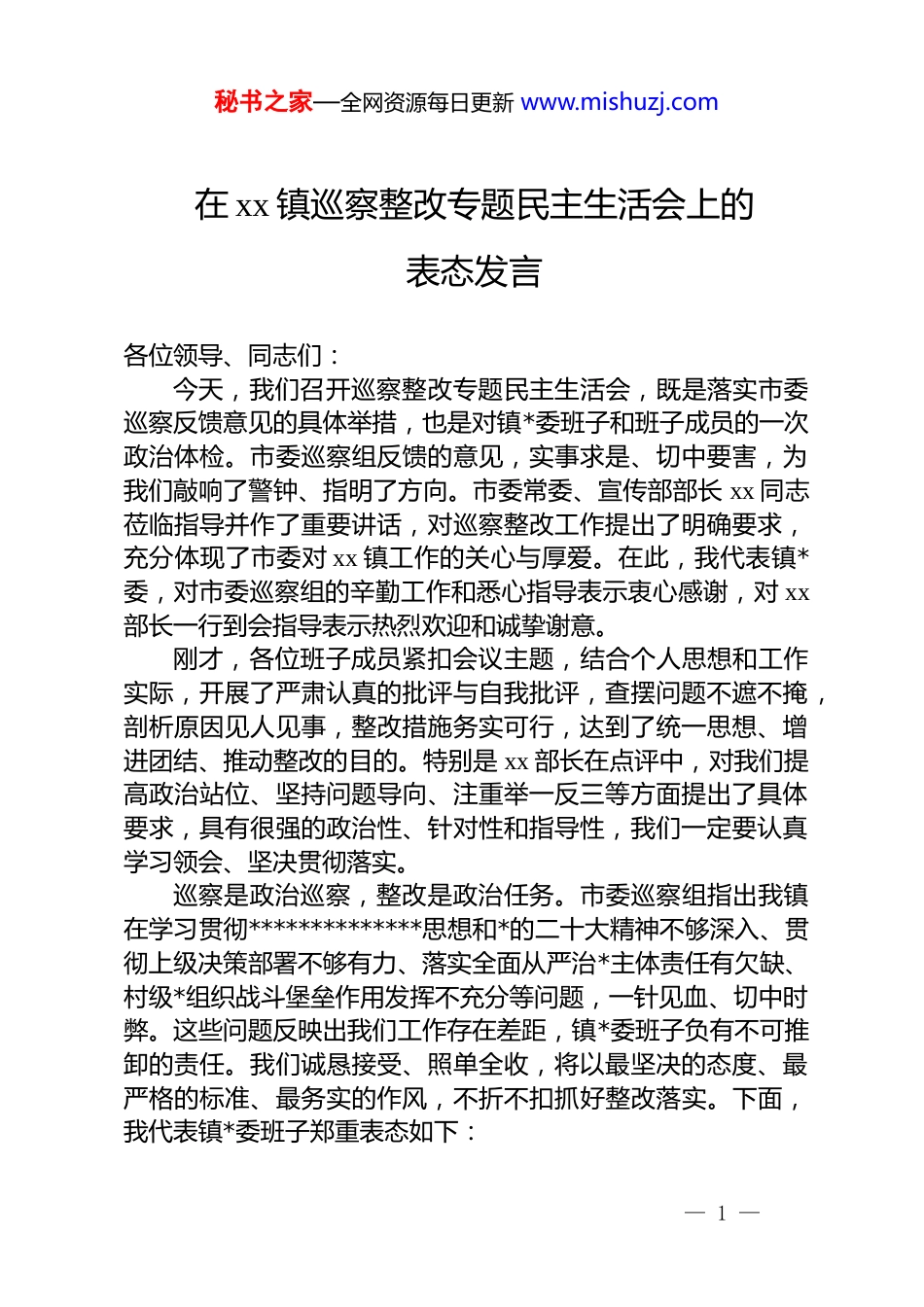 秘书之家—全网资源每日更新 www.mishuzj.com在 xx 镇巡察整改专题民主生活会上的表态发言各位领导、同志们:今天,我们召开巡察整改专题民主生活会,既是落实市委巡察反馈意见的具体举措,也是对镇*委班子和班子成员的一次政治体检。市委巡察组反馈的意见,实事求是、切中要害,为我们敲响了警钟、指明了方向。市委常委、宣传部部长 xx 同志莅临指导并作了重要讲话,对巡察整改工作提出了明确要求,充分体现了市委对 xx 镇工作的关心与厚爱。在此,我代表镇*委,对市委巡察组的辛勤工作和悉心指导表示衷心感谢,对 xx部长一行到会指导表示热烈欢迎和诚挚谢意。刚才,各位班子成员紧扣会议主题,结合个人思想和工作实际,开展了严肃认真的批评与自我批评,查摆问题不遮不掩,剖析原因见人见事,整改措施务实可行,达到了统一思想、增进团结、推动整改的目的。特别是 xx 部长在点评中,对我们提高政治站位、坚持问题导向、注重举一反三等方面提出了具体要求,具有很强的政治性、针对性和指导性,我们一定要认真学习领会、坚决贯彻落实。巡察是政治巡察,整改是政治任务。市委巡察组指出我镇在学习贯彻**************思想和*的二十大精神不够深入、贯彻上级决策部署不够有力、落实全面从严治*主体责任有欠缺、村级*组织战斗堡垒作用发挥不充分等问题,一针见血、切中时弊。这些问题反映出我们工作存在差距,镇*委班子负有不可推卸的责任。我们诚恳接受、照单全收,将以最坚决的态度、最严格的标准、最务实的作风,不折不扣抓好整改落实。下面,我代表镇*委班子郑重表态如下:— 1 —秘书之家—全网资源每日更新 www.mishuzj.com第一,提高政治站位,以高度的思想自觉引领整改方向巡察整改是检验“四个意识”强不强、“两个维护”坚决不坚决的重要标尺。全镇上下必须深刻认识到,抓好巡察整改,不是一般性的业务工作,而是一项严肃的政治任务,是践行对*忠诚的具体行动。我们将始终把政治建设摆在首位,坚持用**************思想武装头脑、指导实践、推动工作,深入学习贯彻*的二十大和二十届历次全会精神,深刻领悟“两个确立”的决定性意义,增强“四个意识”、坚定“四个自信”、做到“两个维护”。针对巡察反馈的“学习贯彻不够深入”问题,我们将反思是否真正将理论学习成果转化为推动乡村振兴、优化营商环境、保障改善民生的实际能力,是否严格落实了“第一议题”制度,是否克服了学习浮于表面、学用结合不紧密等问题。我们将把整改落实的过程,变成一次深刻的思想洗礼、*性锤炼和作风整顿的过程,确保全镇*员干部在思想上、政治上、行动上同以***同志为核心的*中央保持高度一致,同省委、市委的决策部署保持高度一致,确保巡察整改不偏向、不变通、不走样。第二,扛牢政治责任,以坚定的担当精神推动整改落实巡察发现问题的目的在于解决问题。镇*委将切实扛起巡察整改主体责任,我作为第一责任人,将带头领办重点难点问题,班子成员要认真履行“一岗双责”,抓好分管领域整改工作,形成一级抓一级、层层抓落实的工作格局。针对反馈问题,我们将坚持“事要解决”的原则,迅速行动,建立问题清单、任务清单、责任清单,明确整改目标、措施、时限和责任人,实行台账管理、挂图作战、销号推进。对于能够立即解决的问题,要即知即改、立行立改;对于需要一段时间解决的问题,要制定计划、分步实施;对于需要长期坚持的问题,要建章立制、常抓不懈。坚决杜绝“纸面整改”“数字整改”“虚假整改”,确保整改工作真刀真枪、见底见效。特别是对“贯彻上级决策— 2 —秘书之家—全网资源每日更新 www.mishuzj.com部署不够有力”的问题,我们将逐一对照检查,在全面推进乡村振兴、严格落实耕地保护政策、持续优化营商环境、深入打好污染防治攻坚战、推动茶产业等特色产业发展、守牢民生安全底线、落实意识形态工作责任制、推进法治建设、规范资金管理、加强临聘人员管理、强化廉政监督等领域,去痛点、补短板、强弱项,确保上级每一项决策部署在 xx 镇落地生根、开花结果。第三,突出标本兼治,以系统的整改思维提升治理效能巡察反馈的很多问题,表现在下面、根源在上...