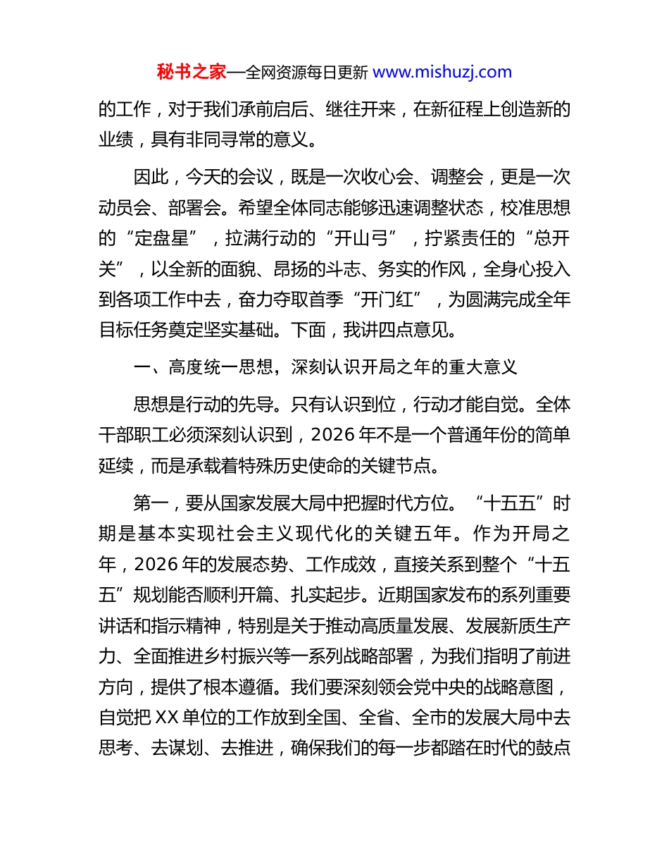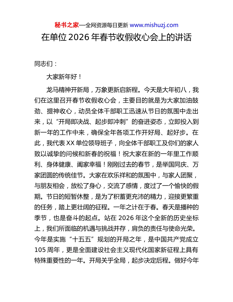 秘书之家—全网资源每日更新 www.mishuzj.com在单位 2026 年春节收假收心会上的讲话同志们:大家新年好!龙马精神开新局,万象更新启新程。今天是大年初八,我们在这里召开春节收假收心会,主要目的就是为大家加油鼓劲、提神收心,动员全体干部职工迅速从节日的氛围中走出来,以“开局即决战、起步即冲刺”的奋进姿态,立即投入到新一年的工作中来,确保全年各项工作开好局、起好步。在此,我代表 XX 单位领导班子,向全体干部职工及你们的家人致以诚挚的问候和新春的祝福!祝大家在新的一年里工作顺利、身体健康、阖家幸福!刚刚过去的春节,是举国同庆、万家团圆的传统佳节。大家在欢乐祥和的氛围中,与家人团聚,与朋友相会,放松了身心,交流了感情,度过了一个愉快的假期。节日的短暂休整,是为了积蓄更充沛的精力,迎接更繁重的任务,踏上更壮阔的征程。一年之计在于春。春天是播种的季节,也是奋斗的起点。站在 2026 年这个全新的历史坐标上,我们所面临的机遇与挑战并存,肩负的责任与使命光荣。今年是实施“十五五”规划的开局之年,是中国共产党成立105 周年,更是全面建设社会主义现代化国家新征程上具有特殊重要性的一年。开局关乎全局,起步决定后程。做好今年秘书之家—全网资源每日更新 www.mishuzj.com的工作,对于我们承前启后、继往开来,在新征程上创造新的业绩,具有非同寻常的意义。因此,今天的会议,既是一次收心会、调整会,更是一次动员会、部署会。希望全体同志能够迅速调整状态,校准思想的“定盘星”,拉满行动的“开山弓”,拧紧责任的“总开关”,以全新的面貌、昂扬的斗志、务实的作风,全身心投入到各项工作中去,奋力夺取首季“开门红”,为圆满完成全年目标任务奠定坚实基础。下面,我讲四点意见。一、高度统一思想,深刻认识开局之年的重大意义思想是行动的先导。只有认识到位,行动才能自觉。全体干部职工必须深刻认识到,2026 年不是一个普通年份的简单延续,而是承载着特殊历史使命的关键节点。第一,要从国家发展大局中把握时代方位。“十五五”时期是基本实现社会主义现代化的关键五年。作为开局之年,2026 年的发展态势、工作成效,直接关系到整个“十五五”规划能否顺利开篇、扎实起步。近期国家发布的系列重要讲话和指示精神,特别是关于推动高质量发展、发展新质生产力、全面推进乡村振兴等一系列战略部署,为我们指明了前进方向,提供了根本遵循。我们要深刻领会党中央的战略意图,自觉把 XX 单位的工作放到全国、全省、全市的发展大局中去思考、去谋划、去推进,确保我们的每一步都踏在时代的鼓点秘书之家—全网资源每日更新 www.mishuzj.com上,每一次努力都契合发展的脉搏。第二,要从行业发展趋势中找准自身定位。当前,我们所处的行业领域正经历着深刻的变革,新旧动能转换加速,科技创新日新月异,市场竟争日趋激烈。不进则退,慢进亦退。面对新形势、新任务,我们不能有任何的歇脚、松劲、懈怠的念头。必须清醒地看到,过去取得的成绩已成为历史,未来的发展还需要我们付出更为艰巨、更为艰苦的努力。必须主动识变、科学应变、积极求变,紧盯行业前沿,聚焦核心业务,在危机中育先机,于变局中开新局,牢牢掌握发展的主动权。第三,要从全年目标任务中明确奋斗坐标。新的一年,我们已经制定了详尽的工作计划和发展目标。这些目标不是轻轻松松、敲锣打鼓就能实现的,每一项指标的完成,每一个项目的落地,都需要我们付出百分之百的努力。全体同志要将思想和行动迅速统一到单位的决策部署上来,把智慧和力量凝聚到完成全年目标任务上来,将个人发展融入单位发展大局,形成心往一处想、劲往一处使的强大合力,共同开创 XX 单位事业发展的新局面。二、迅速收心归位,以奋斗姿态投入全新征程状态决定姿态,姿态决定作为。节后收心归位,是做好一切工作的前提和基础。全体干部职工要切实做到“人到岗、心到岗、状态到岗”,以满格的电量、满弓的姿态,迅速投入到秘书之家—全网资源每日更新 www.mishuzj.com紧张有序的工作中。第一,思想上要“收心”,从“假日模式”切换到“工作模式”。春节的喜庆气氛和安逸生...