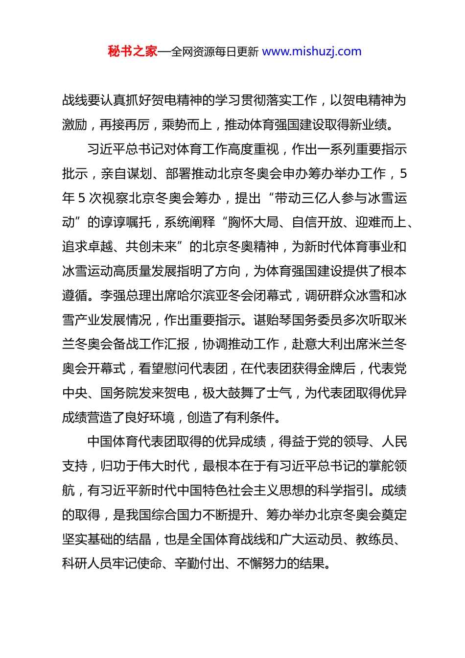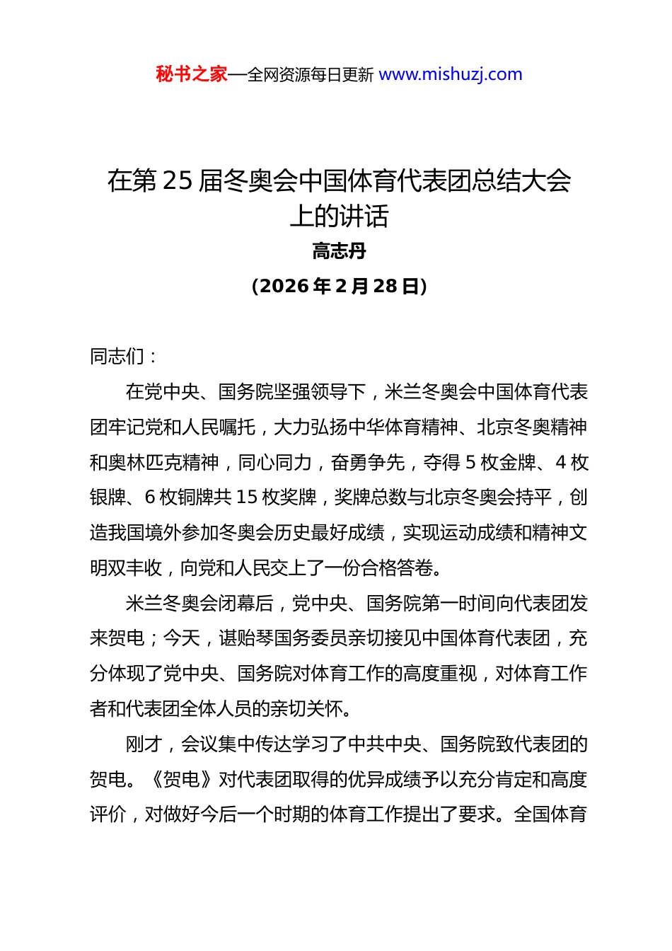 秘书之家—全网资源每日更新 www.mishuzj.com在第 25 届冬奥会中国体育代表团总结大会上的讲话高志丹(2026 年 2 月 28 日)同志们:在党中央、国务院坚强领导下,米兰冬奥会中国体育代表团牢记党和人民嘱托,大力弘扬中华体育精神、北京冬奥精神和奥林匹克精神,同心同力,奋勇争先,夺得 5 枚金牌、4 枚银牌、6 枚铜牌共 15 枚奖牌,奖牌总数与北京冬奥会持平,创造我国境外参加冬奥会历史最好成绩,实现运动成绩和精神文明双丰收,向党和人民交上了一份合格答卷。米兰冬奥会闭幕后,党中央、国务院第一时间向代表团发来贺电;今天,谌贻琴国务委员亲切接见中国体育代表团,充分体现了党中央、国务院对体育工作的高度重视,对体育工作者和代表团全体人员的亲切关怀。刚才,会议集中传达学习了中共中央、国务院致代表团的贺电。《贺电》对代表团取得的优异成绩予以充分肯定和高度评价,对做好今后一个时期的体育工作提出了要求。全国体育秘书之家—全网资源每日更新 www.mishuzj.com战线要认真抓好贺电精神的学习贯彻落实工作,以贺电精神为激励,再接再厉,乘势而上,推动体育强国建设取得新业绩。习近平总书记对体育工作高度重视,作出一系列重要指示批示,亲自谋划、部署推动北京冬奥会申办筹办举办工作,5年 5 次视察北京冬奥会筹办,提出“带动三亿人参与冰雪运动”的谆谆嘱托,系统阐释“胸怀大局、自信开放、迎难而上、追求卓越、共创未来”的北京冬奥精神,为新时代体育事业和冰雪运动高质量发展指明了方向,为体育强国建设提供了根本遵循。李强总理出席哈尔滨亚冬会闭幕式,调研群众冰雪和冰雪产业发展情况,作出重要指示。谌贻琴国务委员多次听取米兰冬奥会备战工作汇报,协调推动工作,赴意大利出席米兰冬奥会开幕式,看望慰问代表团,在代表团获得金牌后,代表党中央、国务院发来贺电,极大鼓舞了士气,为代表团取得优异成绩营造了良好环境,创造了有利条件。中国体育代表团取得的优异成绩,得益于党的领导、人民支持,归功于伟大时代,最根本在于有习近平总书记的掌舵领航,有习近平新时代中国特色社会主义思想的科学指引。成绩的取得,是我国综合国力不断提升、筹办举办北京冬奥会奠定坚实基础的结晶,也是全国体育战线和广大运动员、教练员、科研人员牢记使命、辛勤付出、不懈努力的结果。秘书之家—全网资源每日更新 www.mishuzj.com米兰冬奥会备战参赛过程中,中央和国家有关部门主动作为、全力支持,各地党委政府及体育部门胸怀“国之大者”,为服务保障国家队不遗余力。总局机关各部门,各备战单位、服务保障单位全力以赴。米兰冬奥会取得的优异成绩,再一次彰显了中国特色社会主义的制度优势。在此,我代表体育总局党组向所有为米兰冬奥会备战参赛作出贡献的部门、单位和同志们致以崇高的敬意,表示衷心的感谢!下面,我对此次冬奥会中国体育代表团参赛工作总结如下。一、圆满完成参赛任务,展现北京冬奥会后我国冰雪运动蓬勃发展新气象体育战线认真落实党中央、国务院决策部署,全力备战,精心组织,统筹谋划参赛、外交、文化多领域工作,妥善应对各方面风险,圆满完成各项参赛目标。(一)创境外参赛最好成绩,冰雪运动整体实力得到巩固提升本届冬奥会,中国体育代表团在多个方面取得明显进步。一是参赛覆盖面拓宽。代表团 126 名运动员参加 92 个小项比赛,参赛率 79.3%,参赛运动员数量、参赛率为境外参赛之最。其中,在米兰冬奥会新设的 9 个小项中获得 8 个小项参秘书之家—全网资源每日更新 www.mishuzj.com赛资格;在北京冬奥会以东道主身份参赛的小项中,有 9 个小项通过自身努力首次亮相境外冬奥赛场。参赛运动员省份增加至 22 个,进一步拓展了北京冬奥会成果和十四冬竞赛改革成效。二是争金夺奖项目巩固。共在速度滑冰,短道速滑,自由式滑雪空中技巧、U 型场地技巧、大跳台、坡面障碍技巧,单板滑雪大跳台、坡面障碍技巧等 8 个项目上夺得奖牌,基本巩固了北京冬奥会形成的争金夺奖项目格局和冰上项目、雪上项目均衡发展态势。三是整体实力提升。共获得 49 个前八名,较北京冬奥会的 37 个增长 32.4%,...