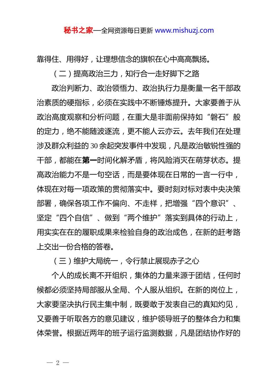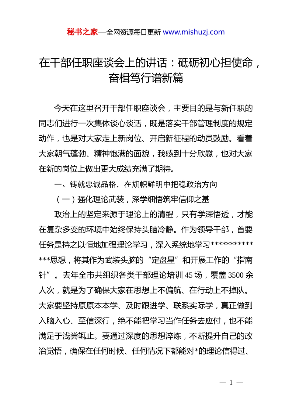 秘书之家—全网资源每日更新 www.mishuzj.com在干部任职座谈会上的讲话:砥砺初心担使命,奋楫笃行谱新篇今天在这里召开干部任职座谈会,主要目的是与新任职的同志们进行一次集体谈心谈话,既是落实干部管理制度的规定动作,也是对大家走上新岗位、开启新征程的动员鼓励。看着大家朝气蓬勃、精神饱满的面貌,我感到十分欣慰,也对大家在新的岗位上做出更大成绩充满了期待。一、铸就忠诚品格,在旗帜鲜明中把稳政治方向(一)强化理论武装,深学细悟筑牢信仰之基政治上的坚定来源于理论上的清醒,只有学深悟透,才能在复杂多变的环境中始终保持头脑冷静。作为领导干部,首要任务是持之以恒地加强理论学习,深入系统地学习**************思想,将其作为武装头脑的“定盘星”和开展工作的“指南针”。去年全市共组织各类干部理论培训 45 场,覆盖 3500 余人次,就是为了确保大家在思想上不偏航、在行动上不掉队。大家要坚持原原本本学、及时跟进学、联系实际学,真正做到入脑入心、至信深行,绝不能把学习当作任务去应付,也不能满足于浅尝辄止。要通过深度的思想淬炼,不断提升自己的政治觉悟,确保在任何时候、任何情况下都能对*的理论信得过、— 1 —秘书之家—全网资源每日更新 www.mishuzj.com靠得住、用得好,让理想信念的旗帜在心中高高飘扬。(二)提高政治三力,知行合一走好脚下之路政治判断力、政治领悟力、政治执行力是衡量一名干部政治素质的硬指标,必须在实践中不断锤炼提升。大家要善于从政治高度观察和分析问题,在重大是非面前保持如“磐石”般的定力,绝不能随波逐流,更不能人云亦云。去年我们在处理涉及群众利益的 30 余起突发事件中发现,凡是政治敏锐性强的干部,都能在第一时间化解矛盾,将风险消灭在萌芽状态。提高政治能力不是一句空话,而是要体现在日常的一言一行中,体现在对每一项政策的贯彻落实中。要时刻对标对表中央决策部署,确保各项工作不偏向、不走样,把增强“四个意识”、坚定“四个自信”、做到“两个维护”落实到具体的行动上,用实实在在的履职成果来检验自身的政治成色,在新的赶考路上交出一份合格的答卷。(三)维护大局统一,令行禁止展现赤子之心个人的成长离不开组织,集体的力量来源于团结,任何时候都必须坚持局部服从全局、个人服从组织。在新的岗位上,大家要坚决执行民主集中制,既要敢于发表自己的真知灼见,又要善于听取各方的意见建议,维护领导班子的整体合力和集体荣誉。根据近两年的班子运行监测数据,凡是团结协作好的— 2 —秘书之家—全网资源每日更新 www.mishuzj.com单位,其年终目标考核优等率比平均水平高出 15 个百分点。要强化规矩意识,严格执行请示报告制度,做到令行禁止、政令畅通,绝不允许搞上有政策、下有对策的“小动作”。要始终保持对组织的赤子之心,以大局利益为重,不计较个人得失,在急难险重任务面前勇于挺身而出。要像保护眼睛一样保护班子的团结,像爱护生命一样爱护集体的形象,形成全院全系统“一盘棋”的工作格局。二、锤炼实干作风,在攻坚克难中履行职责使命(一)增强专业素养,勤学苦练提升履职能力干事创业仅有热情是不够的,还必须具备与岗位相适应的专业能力,做本职工作的“行家里手”。随着社会治理精细化要求的提高,大家要抓紧补齐知识短板,不仅要懂政策、懂业务,还要懂管理、懂法律,不断提升统筹全局的能力。据统计,过去一年本系统各部门累计出台业务指引 22 项,目的就是为了推动工作规范化发展,大家要认真研读、深刻领会。要发扬钻研精神,深入一线开展调查研究,多到基层去接一接“地气”,多到矛盾集中的地方去解一解“难题”。要把学习当作一种生活习惯,在实践中反复磨炼,在失败中总结教训,在成功中积累经验。只有练就一身过硬的本领,才能在关键时刻站得出来、危难时刻豁得出去,真正成为带领群众开拓进取的领头羊。— 3 —秘书之家—全网资源每日更新 www.mishuzj.com(二)狠抓工作落实,雷厉风行破解发展难题为政之要在于落实,大家要坚决摒弃形式主义,以踏石留印、抓铁有痕的劲头把工作落到实处。新的岗位意味着新的挑战,大家到任后要...