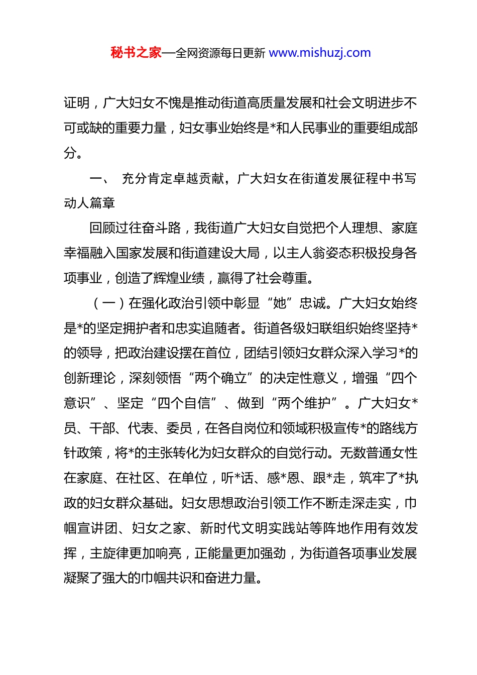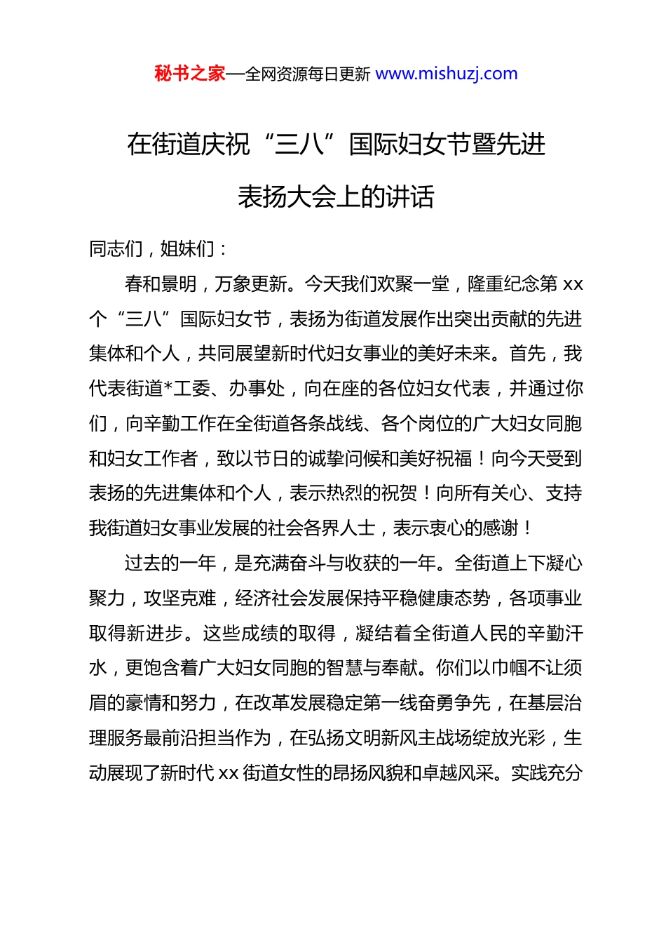 秘书之家—全网资源每日更新 www.mishuzj.com在街道庆祝“三八”国际妇女节暨先进表扬大会上的讲话同志们,姐妹们:春和景明,万象更新。今天我们欢聚一堂,隆重纪念第 xx个“三八”国际妇女节,表扬为街道发展作出突出贡献的先进集体和个人,共同展望新时代妇女事业的美好未来。首先,我代表街道*工委、办事处,向在座的各位妇女代表,并通过你们,向辛勤工作在全街道各条战线、各个岗位的广大妇女同胞和妇女工作者,致以节日的诚挚问候和美好祝福!向今天受到表扬的先进集体和个人,表示热烈的祝贺!向所有关心、支持我街道妇女事业发展的社会各界人士,表示衷心的感谢!过去的一年,是充满奋斗与收获的一年。全街道上下凝心聚力,攻坚克难,经济社会发展保持平稳健康态势,各项事业取得新进步。这些成绩的取得,凝结着全街道人民的辛勤汗水,更饱含着广大妇女同胞的智慧与奉献。你们以巾帼不让须眉的豪情和努力,在改革发展稳定第一线奋勇争先,在基层治理服务最前沿担当作为,在弘扬文明新风主战场绽放光彩,生动展现了新时代 xx 街道女性的昂扬风貌和卓越风采。实践充分秘书之家—全网资源每日更新 www.mishuzj.com证明,广大妇女不愧是推动街道高质量发展和社会文明进步不可或缺的重要力量,妇女事业始终是*和人民事业的重要组成部分。一、 充分肯定卓越贡献,广大妇女在街道发展征程中书写动人篇章回顾过往奋斗路,我街道广大妇女自觉把个人理想、家庭幸福融入国家发展和街道建设大局,以主人翁姿态积极投身各项事业,创造了辉煌业绩,赢得了社会尊重。(一)在强化政治引领中彰显“她”忠诚。广大妇女始终是*的坚定拥护者和忠实追随者。街道各级妇联组织始终坚持*的领导,把政治建设摆在首位,团结引领妇女群众深入学习*的创新理论,深刻领悟“两个确立”的决定性意义,增强“四个意识”、坚定“四个自信”、做到“两个维护”。广大妇女*员、干部、代表、委员,在各自岗位和领域积极宣传*的路线方针政策,将*的主张转化为妇女群众的自觉行动。无数普通女性在家庭、在社区、在单位,听*话、感*恩、跟*走,筑牢了*执政的妇女群众基础。妇女思想政治引领工作不断走深走实,巾帼宣讲团、妇女之家、新时代文明实践站等阵地作用有效发挥,主旋律更加响亮,正能量更加强劲,为街道各项事业发展凝聚了强大的巾帼共识和奋进力量。秘书之家—全网资源每日更新 www.mishuzj.com(二)在服务发展大局中贡献“她”力量。无论是经济建设主战场,还是社会治理第一线,处处闪耀着巾帼奋斗者的身影。在经济领域,女企业家、女创业者敢闯敢干,在优化营商环境、推动产业升级、促进创新创业中展现才华;广大女职工立足岗位,精益求精,在提升服务效能、推动技术革新、保障生产安全中创造价值。在基层治理领域,广大社区女干部、网格员、女性社会工作者、志愿者,扎根基层,服务群众,是政策宣传员、信息收集员、矛盾调解员、便民服务员,在疫情防控常态化服务、文明城市创建、平安建设、民生保障等工作中发挥了不可替代的“半边天”作用。在科教文卫领域,女教师、女医生、女科技工作者、女文艺工作者潜心钻研,默默奉献,为提升辖区教育质量、守护群众健康、推动科技进步、繁荣文化事业贡献了聪明才智。广大妇女以行动证明,女性是物质文明和精神文明的创造者,是推动社会发展和进步的重要力量。(三)在弘扬文明新风中展现“她”风采。广大妇女自觉践行社会主义核心价值观,在建设家庭文明、树立良好家风、促进社会和谐中发挥着独特作用。你们深入参与寻找“最美家庭”、创建“绿色家庭”、传承“好家风好家训”等活动,推动爱国爱家、相亲相爱、向上向善、共建共享的社会主义家庭秘书之家—全网资源每日更新 www.mishuzj.com文明新风尚在街道蔚然成风。你们积极投身新时代文明实践,踊跃参与邻里互助、扶贫济困、敬老爱幼、环境整治等志愿服务,以女性特有的善良、包容和坚韧,传递温暖,播撒爱心,促进了社区人际和谐与社会文明。你们带头遵守社会公德、职业道德、家庭美德,提升个人品德,以自身的模范行为影响带动家庭成员和周边群众,共同提升社会文明程度。广大妇女在弘扬中华...