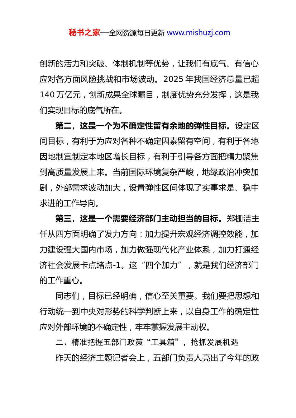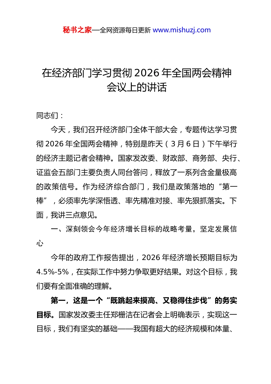 秘书之家—全网资源每日更新 www.mishuzj.com在经济部门学习贯彻 2026 年全国两会精神会议上的讲话同志们:今天,我们召开经济部门全体干部大会,专题传达学习贯彻 2026 年全国两会精神,特别是昨天(3 月 6 日)下午举行的经济主题记者会精神。国家发改委、财政部、商务部、央行、证监会五部门主要负责人同台答问,释放了一系列含金量极高的政策信号。作为经济综合部门,我们是政策落地的“第一棒”,必须率先学深悟透、率先精准对接、率先狠抓落实。下面,我讲三点意见。一、深刻领会今年经济增长目标的战略考量,坚定发展信心今年的政府工作报告提出,2026 年经济增长预期目标为4.5%-5%,在实际工作中努力争取更好结果。对这个目标,我们要有全面准确的理解。第一,这是一个“既跳起来摸高、又稳得住步伐”的务实目标。国家发改委主任郑栅洁在记者会上明确表示,实现这一目标,我们有坚实的基础——我国有超大的经济规模和体量、秘书之家—全网资源每日更新 www.mishuzj.com创新的活力和突破、体制机制等优势,让我们有底气、有信心应对各方面风险挑战和市场波动。2025 年我国经济总量已超140 万亿元,创新成果全球瞩目,制度优势充分发挥,这是我们实现目标的底气所在。第二,这是一个为不确定性留有余地的弹性目标。设定区间目标,有利于为应对各种不确定因素留有空间,有利于各地因地制宜制定本地区增长目标,有利于引导各方面把精力聚焦到高质量发展上来。当前国际环境复杂严峻,地缘政治冲突加剧,外部需求波动加大,设置弹性区间体现了实事求是、稳中求进的工作导向。第三,这是一个需要经济部门主动担当的目标。郑栅洁主任从四方面明确了发力方向:加力提升宏观经济调控效能,加力建设强大国内市场,加力做强现代化产业体系,加力打通经济社会发展卡点堵点-1。这“四个加力”,就是我们经济部门的工作重心。同志们,目标已经明确,信心至关重要。我们要把思想和行动统一到中央对形势的科学判断上来,以自身工作的确定性应对外部环境的不确定性,牢牢掌握发展主动权。二、精准把握五部门政策“工具箱”,抢抓发展机遇昨天的经济主题记者会上,五部门负责人亮出了今年的政秘书之家—全网资源每日更新 www.mishuzj.com策“工具箱”,干货满满、含金量极高。我们要逐条研究、逐项对接。一要抢抓财政政策“三个新高”的政策红利。财政部部长蓝佛安介绍,今年财政资金规模安排上创了三个“新高”:支出总量创新高,首次超过 30 万亿元;新增政府债券规模创新高,达到 11.89 万亿元;中央对地方转移支付创新高,达到10.42 万亿元,连续 4 年超过 10 万亿元-1。这意味着中央“真金白银”的支持力度空前,我们经济部门要提前谋划项目、精准对接资金,争取更多份额落地。二要抢抓 1000 亿元财政金融协同促内需资金的投放机遇。蓝佛安部长特别提到,财政专门安排 1000 亿元,推出财政金融协同促内需一揽子 6 项政策——4 项定向支持民间投资、2项支持居民消费-1-3。这是扩大有效需求、创新宏观调控的重要举措。我们要第一时间研究政策细则,组织企业申报,让政策红利直达快享。三要抢抓货币政策适度宽松的流动性环境。 明确表示,将继续实施好适度宽松的货币政策,灵活高效地运用降准降息等多种货币政策工具,保持市场流动性充裕-1-3。今年结构性货币政策工具的重点将聚焦于支持扩大内需、科技创新和中小微企业。我们要加强政银企对接,引导金融机构把更多资金投向秘书之家—全网资源每日更新 www.mishuzj.com实体经济、投向中小企业。四要抢抓消费提质扩容的政策东风。商务部部长介绍,商品消费方面将接续实施消费品以旧换新,重点支持绿色智能商品和线下实体零售;服务消费方面将聚焦 6 个重点领域和 3 个潜力领域完善专项支持政策。我们要结合本地实际,拿出促消费的具体举措,激发市场活力。五要抢抓资本市场改革带来的融资便利。证监会主席表示,将在创业板增设一套更加精准、更为包容的上市标准,积极支持新型消费、现代服务业等优质创新创业企业上市。我们要加强对拟上市企业的培育辅导,帮助企业用好资本市场工具。此外,“十五五”规划...