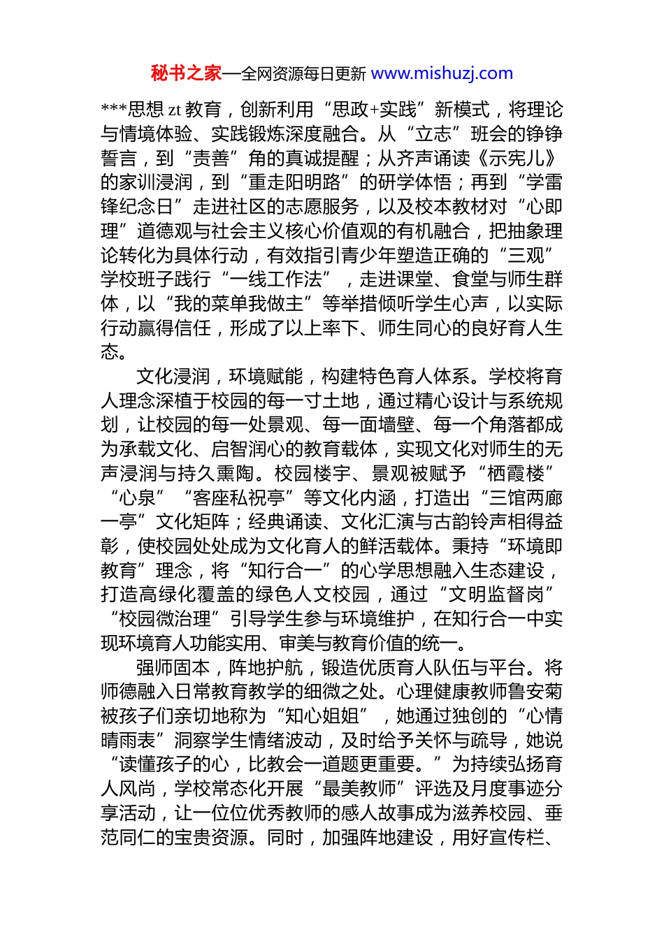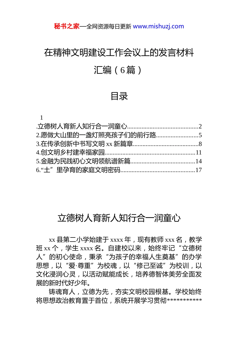 秘书之家—全网资源每日更新 www.mishuzj.com在精神文明建设工作会议上的发言材料汇编(6 篇)目录1.立德树人育新人知行合一润童心............................................22.愿做大山里的一盏灯照亮孩子们的前行路..........................53.在传承创新中书写文明 xx 新篇章.........................................84.创文明乡村建幸福家园........................................................115.金融为民践初心文明领航谱新篇........................................146.“土”里孕育的家庭文明密码..............................................17立德树人育新人知行合一润童心xx 县第二小学始建于 xxxx 年,现有教师 xxx 名,教学班 xx 个,学生 xxxx 名。自建校以来,始终牢记“立德树人”的初心使命,秉承“为孩子的幸福人生奠基”的办学思想,以“爱·尊重”为校魂,以“修己至诚”为校训,以文化浸润心灵,以活动赋能成长,培养德智体美劳全面发展的新时代好少年。铸魂育人,立德为先,夯实文明校园根基。学校始终将思想政治教育置于首位,系统开展学习贯彻***********秘书之家—全网资源每日更新 www.mishuzj.com***思想 zt 教育,创新利用“思政+实践”新模式,将理论与情境体验、实践锻炼深度融合。从“立志”班会的铮铮誓言,到“责善”角的真诚提醒;从齐声诵读《示宪儿》的家训浸润,到“重走阳明路”的研学体悟;再到“学雷锋纪念日”走进社区的志愿服务,以及校本教材对“心即理”道德观与社会主义核心价值观的有机融合,把抽象理论转化为具体行动,有效指引青少年塑造正确的“三观”学校班子践行“一线工作法”,走进课堂、食堂与师生群体,以“我的菜单我做主”等举措倾听学生心声,以实际行动赢得信任,形成了以上率下、师生同心的良好育人生态。文化浸润,环境赋能,构建特色育人体系。学校将育人理念深植于校园的每一寸土地,通过精心设计与系统规划,让校园的每一处景观、每一面墙壁、每一个角落都成为承载文化、启智润心的教育载体,实现文化对师生的无声浸润与持久熏陶。校园楼宇、景观被赋予“栖霞楼”“心泉”“客座私祝亭”等文化内涵,打造出“三馆两廊一亭”文化矩阵;经典诵读、文化汇演与古韵铃声相得益彰,使校园处处成为文化育人的鲜活载体。秉持“环境即教育”理念,将“知行合一”的心学思想融入生态建设,打造高绿化覆盖的绿色人文校园,通过“文明监督岗”“校园微治理”引导学生参与环境维护,在知行合一中实现环境育人功能实用、审美与教育价值的统一。强师固本,阵地护航,锻造优质育人队伍与平台。将师德融入日常教育教学的细微之处。心理健康教师鲁安菊被孩子们亲切地称为“知心姐姐”,她通过独创的“心情晴雨表”洞察学生情绪波动,及时给予关怀与疏导,她说“读懂孩子的心,比教会一道题更重要。”为持续弘扬育人风尚,学校常态化开展“最美教师”评选及月度事迹分享活动,让一位位优秀教师的感人故事成为滋养校园、垂范同仁的宝贵资源。同时,加强阵地建设,用好宣传栏、秘书之家—全网资源每日更新 www.mishuzj.com广播站、校刊等阵地,建设学校微信公众号、视频号等新媒体平台,讲述校园文明故事,传播正能量。xx 个社团活动百花齐放,成果丰硕:原创作品《智慧卫生间》亮相数博会,非洲鼓社团参与中国—东盟教育交流周展演,创编的《xx》等节目屡获佳绩。站在全国文明校园的新起点,xx 县第二小学将继续植根阳明文化沃土,让思政之魂、文明之风与育人之路紧密相连,让传统智慧与现代文明交相辉映,不断将文化底蕴转化为育人优势,将文明成果汇聚成奋进力量,奋力谱写新时代立德树人的崭新篇章。愿做大山里的一盏灯照亮孩子们的前行路大家好,我叫 xx,我心中充满感恩。这份荣誉,不只属于我,更属于所有默默坚守在基层教育一线的同仁们。选择:从走出大山到回到大山很多人知道我,是因为当年“千里背母上大学”的事。我从小在大山深处长大,父亲早逝,母亲患病,生活很苦那时我心里只有一个念头:好好读书,带着妈妈走出大山。大学毕业后,我在山东有了稳定的工作。但有一天,我接到...