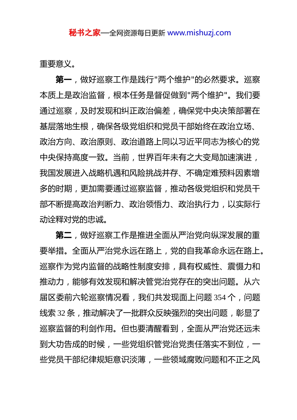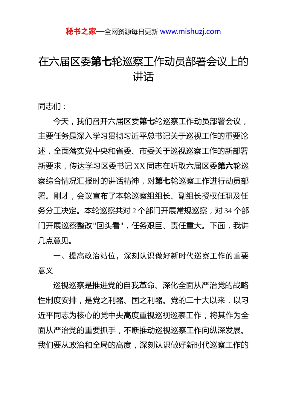 秘书之家—全网资源每日更新 www.mishuzj.com在六届区委第七轮巡察工作动员部署会议上的讲话 同志们:今天,我们召开六届区委第七轮巡察工作动员部署会议,主要任务是深入学习贯彻习近平总书记关于巡视工作的重要论述,全面落实党中央和省委、市委关于巡视巡察工作的新部署新要求,传达学习区委书记 XX 同志在听取六届区委第六轮巡察综合情况汇报时的讲话精神,对第七轮巡察工作进行动员部署。刚才,会议宣布了本轮巡察组组长、副组长授权任职及任务分工决定。本轮巡察共对 2 个部门开展常规巡察,对 34 个部门开展巡察整改"回头看",任务艰巨、责任重大。下面,我讲几点意见。一、提高政治站位,深刻认识做好新时代巡察工作的重要意义巡视巡察是推进党的自我革命、深化全面从严治党的战略性制度安排,是党之利器、国之利器。党的二十大以来,以习近平同志为核心的党中央高度重视巡视巡察工作,将其作为全面从严治党的重要抓手,不断推动巡视巡察工作向纵深发展。我们要从政治和全局的高度,深刻认识做好新时代巡察工作的秘书之家—全网资源每日更新 www.mishuzj.com重要意义。第一,做好巡察工作是践行"两个维护"的必然要求。巡察本质上是政治监督,根本任务是督促做到"两个维护"。我们要通过巡察,及时发现和纠正政治偏差,确保党中央决策部署在基层落地生根,确保各级党组织和党员干部始终在政治立场、政治方向、政治原则、政治道路上同以习近平同志为核心的党中央保持高度一致。当前,世界百年未有之大变局加速演进,我国发展进入战略机遇和风险挑战并存、不确定难预料因素增多的时期,更加需要通过巡察监督,推动各级党组织和党员干部不断提高政治判断力、政治领悟力、政治执行力,以实际行动诠释对党的忠诚。第二,做好巡察工作是推进全面从严治党向纵深发展的重要举措。全面从严治党永远在路上,党的自我革命永远在路上。巡察作为党内监督的战略性制度安排,具有权威性、震慑力和推动力,能够有效发现和解决管党治党存在的突出问题。从六届区委前六轮巡察情况看,我们共发现面上问题 354 个,问题线索 32 条,推动解决了一批群众反映强烈的突出问题,彰显了巡察监督的利剑作用。但也要清醒看到,全面从严治党还远未到大功告成的时候,一些党组织管党治党责任落实不到位,一些党员干部纪律规矩意识淡薄,一些领域腐败问题和不正之风秘书之家—全网资源每日更新 www.mishuzj.com仍然存在。这就要求我们必须持续深化政治巡察,以严的基调、严的措施、严的氛围,推动全面从严治党向纵深发展、向基层延伸。第三,做好巡察工作是推动全区经济社会高质量发展的重要保障。当前,我区正处于转型发展的关键时期,改革发展稳定任务艰巨繁重。巡察工作要紧紧围绕中心、服务大局,聚焦党中央决策部署及省市区委工作要求落实情况,聚焦群众身边不正之风和腐败问题,聚焦基层党组织和党员干部队伍建设,精准查找政治偏差,推动解决制约发展的堵点难点问题,切实发挥巡察监督保障执行、促进完善发展作用,为全区经济社会高质量发展提供坚强政治保障。二、准确把握监督重点,高质量完成本轮巡察任务本轮巡察采取常规巡察与巡察整改"回头看"相结合的方式,对 2 个部门开展常规巡察,对 34 个部门开展巡察整改"回头看"。各巡察组要准确把握监督重点,坚持问题导向,精准发现问题,推动解决问题。第一,常规巡察要聚焦"三个重点"精准发力。一是聚焦党中央决策部署及省市区委工作要求落实情况。重点检查被巡察党组织学习贯彻习近平新时代中国特色社会主义思想和党的二十大精神情况,贯彻落实党中央重大决策部署和省市区委工作秘书之家—全网资源每日更新 www.mishuzj.com要求情况,推动本部门本系统工作高质量发展情况。要紧盯党组织职能责任、权力运行关键环节、干部作风建设,精准查找政治偏差,确保党中央政令畅通、令行禁止。二是聚焦群众身边不正之风和腐败问题。重点检查被巡察党组织落实全面从严治党主体责任情况,领导干部廉洁自律情况,群众身边腐败和不正之风问题。要关注群众身边的操心事烦心事揪心事,严肃查处损害群众利益的行为,整治群众身边腐败和作风问题,...