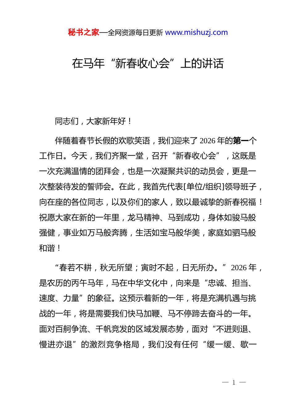秘书之家—全网资源每日更新 www.mishuzj.com在马年“新春收心会”上的讲话 同志们,大家新年好!伴随着春节长假的欢歌笑语,我们迎来了 2026 年的第一个工作日。今天,我们齐聚一堂,召开“新春收心会”,这既是一次充满温情的团拜会,也是一次凝聚共识的动员会,更是一次整装待发的誓师会。在此,我首先代表[单位/组织]领导班子,向在座的各位同志,以及你们的家人,致以最诚挚的新春祝福!祝愿大家在新的一年里,龙马精神、马到成功,身体如骏马般强健,事业如万马般奔腾,生活如宝马般华美,家庭如驷马般和谐!“春若不耕,秋无所望;寅时不起,日无所办。”2026 年,是农历的丙午马年,马在中华文化中,向来是“忠诚、担当、速度、力量”的象征。这预示着新的一年,将是充满机遇与挑战的一年,将是需要我们快马加鞭、马不停蹄去奋斗的一年。面对百舸争流、千帆竞发的区域发展态势,面对“不进则退、慢进亦退”的激烈竞争格局,我们没有任何“缓一缓、歇一— 1 —秘书之家—全网资源每日更新 www.mishuzj.com歇”的资本,必须迅速从“假期模式”切换到“工作模式”,从“走亲访友”切换到“走街串巷”,从“推杯换盏”切换到“推陈出新”,以“开局就是决战、起步就是冲刺”的劲头,奋力夺取一季度“开门红”,为全年工作赢得主动、奠定胜局。下面,围绕“收心归位、聚力实干、开局争先”这一主题我讲三点意见,与大家共勉:第一,收心归位,在思想状态上“一马当先”。“心不专一,不能专诚;意不实笃,不能专一。”春节假期已过,大家务必要在思想上“紧”起来,在精神上“提”起来,在状态上“燃”起来。要坚决克服“不到十五年未完”的惯性思维,彻底摒弃“心在曹营身在汉”的散漫状态,把节日期间的兴奋感和松弛感,转化为对工作的责任感和紧迫感。各部门、各科室负责人要以身作则、率先垂范,不仅要管好自己,更要带好队伍,引导全体干部职工把心思和精力迅速集中到工作上来,做到“人在岗、心在位、事在干”,以龙马精神的昂扬斗志,迎接新一年的各项挑战。第二,严明纪律,在作风纪律上“厉兵秣马”。“矩不正,不可为方;规不正,不可为圆。”优良的作风纪律是保障工作高效运转的生命线。节后收心,首先要从严肃纪律抓起。全体— 2 —秘书之家—全网资源每日更新 www.mishuzj.com人员要严格遵守单位的各项规章制度和工作纪律,坚决杜绝迟到早退、无故缺岗、上班时间精神萎靡、从事与工作无关活动等不良现象。要严格执行考勤制度、请示报告制度,做到令行禁止、政令畅通。相关职能部门要切实履行“督战”职责,对工作纪律、工作效能进行常态化监督检查,对发现的问题要及时指出、严肃处理,确保全单位工作秩序井然,展现出纪律严明、作风过硬、高效务实的良好风貌,为万马奔腾的奋进态势提供坚实的纪律保障。第三,聚焦重点,在推进落实上“快马加鞭”。“为者常成,行者常至。”收心归位的最终目的,是为了更好地干事创业、推动发展。2026 年,我们面临的发展任务依然艰巨繁重,各项指标压力依然很大。各部门要紧紧围绕年度既定目标和上级的工作部署,结合自身实际,立即行动起来,对今年的工作任务进行再审视、再细化、再分解。要迅速明确当前的重点工作、紧要任务和关键环节,制定详细可行的推进计划和落实举措。对于已经部署的工作,要雷厉风行、抓紧启动,抢抓时间窗口;对于需要持续发力的长期性任务,要保持韧劲、一抓到底;对于可能存在的难点堵点,要提前预判、深入研究、拿出对策。全体同志要立足自身岗位,明确职责清单,以“等不— 3 —秘书之家—全网资源每日更新 www.mishuzj.com起”的紧迫感、“慢不得”的危机感、“坐不住”的责任感,真抓实干、攻坚克难,确保各项工作迅速打开新局面,取得新突破,真正实现“马到成功”的圆满结局。同志们,“路虽远,行则将至;事虽难,做则必成。” 新的征程已经开启,新的画卷正待描绘。2026 年,是充满希望和机遇的“马年”,也是我们大展宏图、大有作为的一年。让我们迅速行动起来,以“天马行空”的闯劲、“策马扬鞭”的干劲、“马不停蹄”的拼劲,团结一心,携手并进,以更加饱满的热情、更...