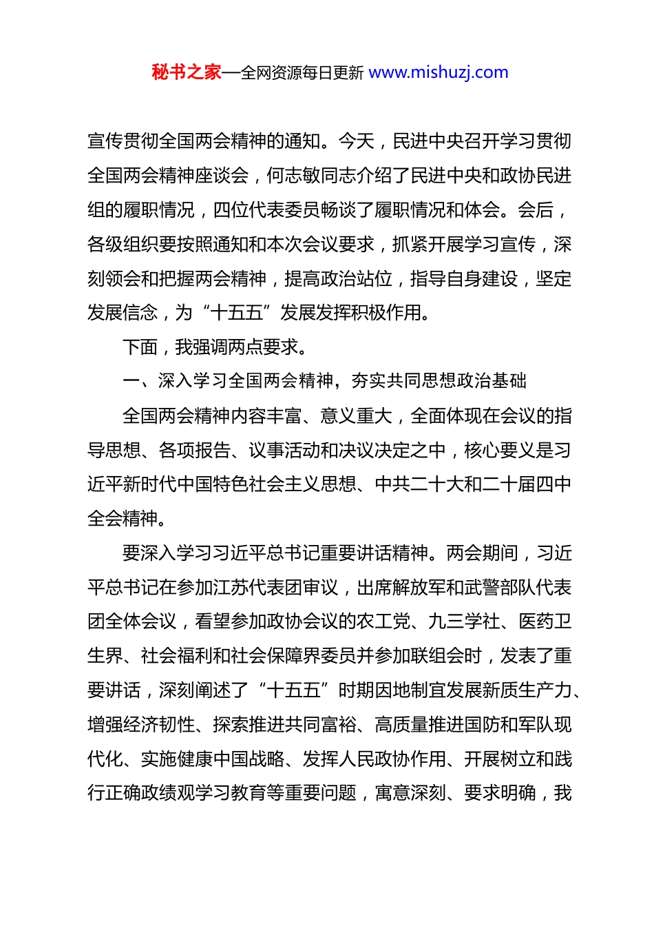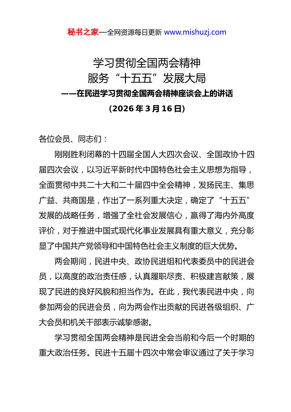 秘书之家—全网资源每日更新 www.mishuzj.com学习贯彻全国两会精神服务“十五五”发展大局——在民进学习贯彻全国两会精神座谈会上的讲话(2026 年 3 月 16 日)各位会员、同志们:刚刚胜利闭幕的十四届全国人大四次会议、全国政协十四届四次会议,以习近平新时代中国特色社会主义思想为指导,全面贯彻中共二十大和二十届四中全会精神,发扬民主、集思广益、共商国是,作出了一系列重大决定,确定了“十五五”发展的战略任务,增强了全社会发展信心,赢得了海内外高度评价,对于推进中国式现代化事业发展具有重大意义,充分彰显了中国共产党领导和中国特色社会主义制度的巨大优势。两会期间,民进中央、政协民进组和代表委员中的民进会员,以高度的政治责任感,认真履职尽责、积极建言献策,展现了民进的良好风貌和担当作为。在此,我代表民进中央,向参加两会的民进会员,向为两会作出贡献的民进各级组织、广大会员和机关干部表示诚挚感谢。学习贯彻全国两会精神是民进全会当前和今后一个时期的重大政治任务。民进十五届十四次中常会审议通过了关于学习秘书之家—全网资源每日更新 www.mishuzj.com宣传贯彻全国两会精神的通知。今天,民进中央召开学习贯彻全国两会精神座谈会,何志敏同志介绍了民进中央和政协民进组的履职情况,四位代表委员畅谈了履职情况和体会。会后,各级组织要按照通知和本次会议要求,抓紧开展学习宣传,深刻领会和把握两会精神,提高政治站位,指导自身建设,坚定发展信念,为“十五五”发展发挥积极作用。下面,我强调两点要求。一、深入学习全国两会精神,夯实共同思想政治基础全国两会精神内容丰富、意义重大,全面体现在会议的指导思想、各项报告、议事活动和决议决定之中,核心要义是习近平新时代中国特色社会主义思想、中共二十大和二十届四中全会精神。要深入学习习近平总书记重要讲话精神。两会期间,习近平总书记在参加江苏代表团审议,出席解放军和武警部队代表团全体会议,看望参加政协会议的农工党、九三学社、医药卫生界、社会福利和社会保障界委员并参加联组会时,发表了重要讲话,深刻阐述了“十五五”时期因地制宜发展新质生产力、增强经济韧性、探索推进共同富裕、高质量推进国防和军队现代化、实施健康中国战略、发挥人民政协作用、开展树立和践行正确政绩观学习教育等重要问题,寓意深刻、要求明确,我秘书之家—全网资源每日更新 www.mishuzj.com们要深刻领会、指导实践。要深入学习两会报告和决议。经过充分审议和讨论,两会通过了关于“十五五”规划纲要、国家发展规划法、生态环境法典、民族团结进步促进法,通过了政府工作报告及年度计划和预算、全国人大常委会工作报告及法律清理工作相关报告、最高人民法院工作报告、最高人民检察院工作报告、全国政协常委会工作报告及提案工作情况、提案审查情况报告的各项决议和政治决议,取得了丰硕的成果,体现了高度的共识。要深刻领会两会对“十四五”发展成就的高度评价。“十四五”时期是极不寻常、极不平凡的发展历程,以习近平同志为核心的中共中央,团结带领全党全国各族人民迎难而上、砥砺前行,有效应对复杂形势和多重压力,胜利完成了“十四五”主要目标任务,我国经济实力、科技实力、国防实力、综合国力跃上新台阶,中国式现代化迈出新的坚实步伐,第二个百年奋斗目标新征程实现良好开局,成就来之不易,应当倍加珍惜。要准确把握两会对“十五五”发展规划的实施要求。“十五五”时期是基本实现社会主义现代化夯实基础、全面发力的关键时期,启动实施“十五五”规划纲要,做好开局之年的工作,要牢牢把握中共二十届四中全会确定的“十五五”发展指秘书之家—全网资源每日更新 www.mishuzj.com导思想、重要原则、目标任务和政策举措,全面领会中共中央对形势的总体判断,增强政治能力和履职本领,广泛凝聚人心、凝聚共识、凝聚智慧、凝聚力量,进一步领悟“两个确立”的决定性意义,增强“四个意识”、坚定“四个自信”、做到“两个维护”。要把学习两会精神与加强自身建设紧密结合。贯彻学习制度和“第一议题”制度,广泛开展学习教育,充分发挥新闻宣传、舆情工作、...