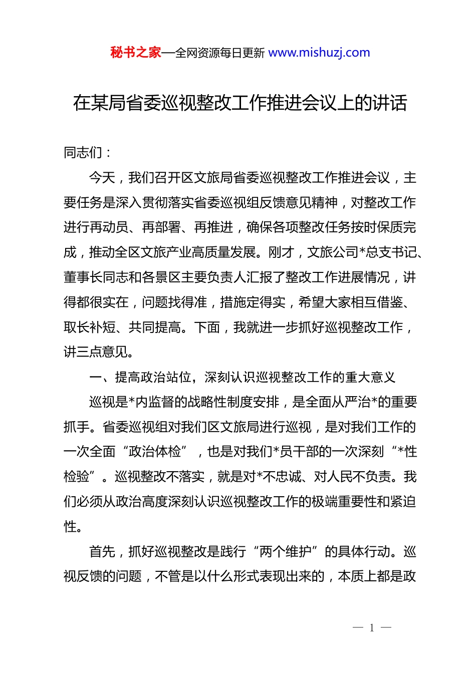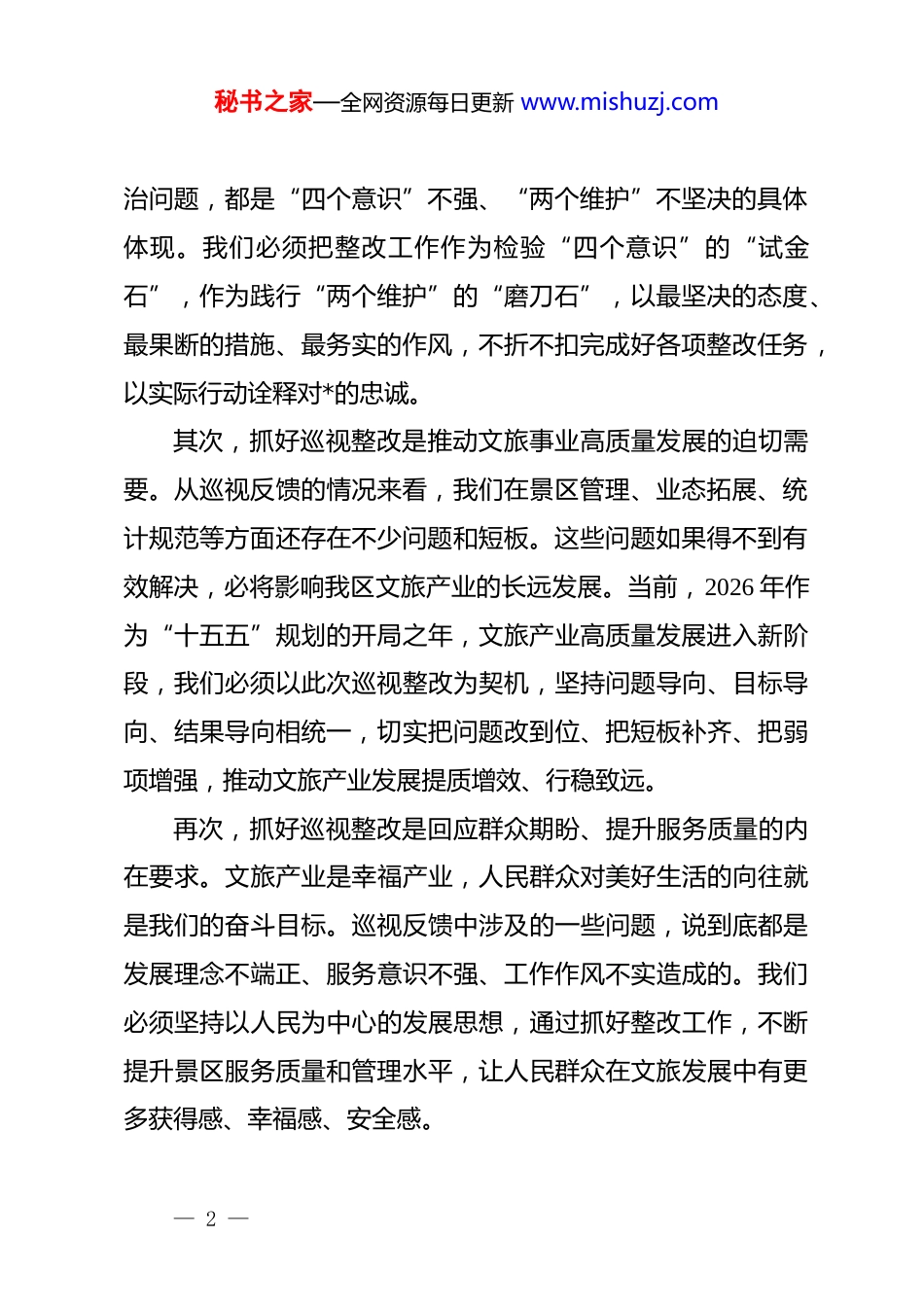 秘书之家—全网资源每日更新 www.mishuzj.com在某局省委巡视整改工作推进会议上的讲话同志们:今天,我们召开区文旅局省委巡视整改工作推进会议,主要任务是深入贯彻落实省委巡视组反馈意见精神,对整改工作进行再动员、再部署、再推进,确保各项整改任务按时保质完成,推动全区文旅产业高质量发展。刚才,文旅公司*总支书记、董事长同志和各景区主要负责人汇报了整改工作进展情况,讲得都很实在,问题找得准,措施定得实,希望大家相互借鉴、取长补短、共同提高。下面,我就进一步抓好巡视整改工作,讲三点意见。一、提高政治站位,深刻认识巡视整改工作的重大意义巡视是*内监督的战略性制度安排,是全面从严治*的重要抓手。省委巡视组对我们区文旅局进行巡视,是对我们工作的一次全面“政治体检”,也是对我们*员干部的一次深刻“*性检验”。巡视整改不落实,就是对*不忠诚、对人民不负责。我们必须从政治高度深刻认识巡视整改工作的极端重要性和紧迫性。首先,抓好巡视整改是践行“两个维护”的具体行动。巡视反馈的问题,不管是以什么形式表现出来的,本质上都是政— 1 —秘书之家—全网资源每日更新 www.mishuzj.com治问题,都是“四个意识”不强、“两个维护”不坚决的具体体现。我们必须把整改工作作为检验“四个意识”的“试金石”,作为践行“两个维护”的“磨刀石”,以最坚决的态度、最果断的措施、最务实的作风,不折不扣完成好各项整改任务,以实际行动诠释对*的忠诚。其次,抓好巡视整改是推动文旅事业高质量发展的迫切需要。从巡视反馈的情况来看,我们在景区管理、业态拓展、统计规范等方面还存在不少问题和短板。这些问题如果得不到有效解决,必将影响我区文旅产业的长远发展。当前,2026 年作为“十五五”规划的开局之年,文旅产业高质量发展进入新阶段,我们必须以此次巡视整改为契机,坚持问题导向、目标导向、结果导向相统一,切实把问题改到位、把短板补齐、把弱项增强,推动文旅产业发展提质增效、行稳致远。再次,抓好巡视整改是回应群众期盼、提升服务质量的内在要求。文旅产业是幸福产业,人民群众对美好生活的向往就是我们的奋斗目标。巡视反馈中涉及的一些问题,说到底都是发展理念不端正、服务意识不强、工作作风不实造成的。我们必须坚持以人民为中心的发展思想,通过抓好整改工作,不断提升景区服务质量和管理水平,让人民群众在文旅发展中有更多获得感、幸福感、安全感。— 2 —秘书之家—全网资源每日更新 www.mishuzj.com二、聚焦重点任务,全力推进巡视整改工作落地见效巡视整改是一项系统工程,必须抓住关键、突出重点、精准发力。刚才,会议明确提出了三项重点工作要求,我完全同意。下面,我结合当前形势和实际情况,再作进一步强调和部署。第一,抓实整改提升,推动多元发展,着力破解门票依赖难题各景区要严格对照整改任务清单,逐项细化措施、限期清零。在此基础上,要深刻认识到,传统“门票经济”模式已难以为继,景区收入模式正从“门票经济”向“生态经济”转变。据行业研究显示,a 股上市景区企业非门票收入占比平均已达61.3%,部分头部企业该比例已突破 75%。江苏省更是提出到2026 年,全省 4a 级及以上旅游景区非门票收入占比力争达60%以上。这些数据充分说明,破除门票依赖、拓展多元业态,已成为景区高质量发展的必由之路。我们必须正视差距、找准症结。从巡视反馈和日常调研情况来看,我区部分景区仍存在门票收入占比偏高、业态单一、二次消费不足等问题。部分景区门票收入占总营收比重超过70%,远高于行业先进水平。这种收入结构不仅抗风险能力弱,而且难以满足游客日益多样化的消费需求。杭州西湖景区全面— 3 —秘书之家—全网资源每日更新 www.mishuzj.com免票后,周边商业收入大幅增长,带动了相关产业增收;重庆**洞免费开放,有效拉动了城市餐饮、住宿和交通消费增长。这些成功案例启示我们,门票优惠乃至免票,不应被视为“损失”,而应作为吸引客流、拉动消费的重要手段。各景区要在完成整改的基础上,着力从以下几个方面拓展多元业态:一是发展文创产业。深入挖掘景区文化内涵,开发具有地方特色、...