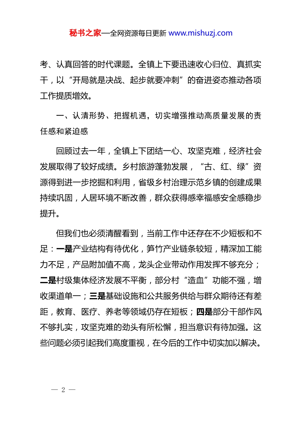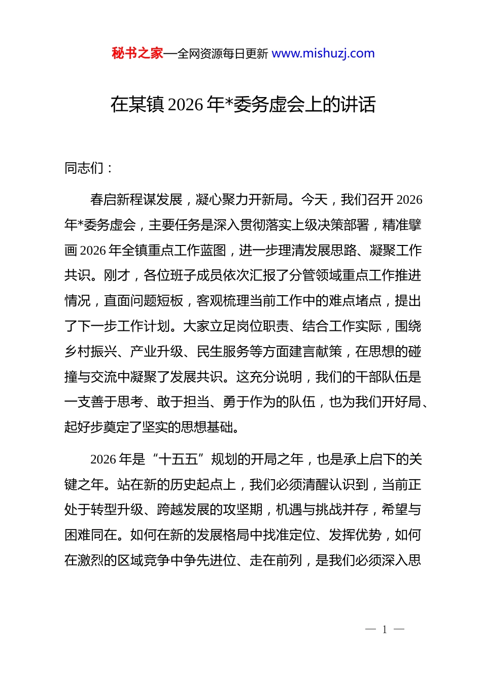 秘书之家—全网资源每日更新 www.mishuzj.com在某镇 2026 年*委务虚会上的讲话同志们:春启新程谋发展,凝心聚力开新局。今天,我们召开 2026年*委务虚会,主要任务是深入贯彻落实上级决策部署,精准擘画 2026 年全镇重点工作蓝图,进一步理清发展思路、凝聚工作共识。刚才,各位班子成员依次汇报了分管领域重点工作推进情况,直面问题短板,客观梳理当前工作中的难点堵点,提出了下一步工作计划。大家立足岗位职责、结合工作实际,围绕乡村振兴、产业升级、民生服务等方面建言献策,在思想的碰撞与交流中凝聚了发展共识。这充分说明,我们的干部队伍是一支善于思考、敢于担当、勇于作为的队伍,也为我们开好局、起好步奠定了坚实的思想基础。2026 年是“十五五”规划的开局之年,也是承上启下的关键之年。站在新的历史起点上,我们必须清醒认识到,当前正处于转型升级、跨越发展的攻坚期,机遇与挑战并存,希望与困难同在。如何在新的发展格局中找准定位、发挥优势,如何在激烈的区域竞争中争先进位、走在前列,是我们必须深入思— 1 —秘书之家—全网资源每日更新 www.mishuzj.com考、认真回答的时代课题。全镇上下要迅速收心归位、真抓实干,以“开局就是决战、起步就要冲刺”的奋进姿态推动各项工作提质增效。一、认清形势、把握机遇,切实增强推动高质量发展的责任感和紧迫感回顾过去一年,全镇上下团结一心、攻坚克难,经济社会发展取得了较好成绩。乡村旅游蓬勃发展,“古、红、绿”资源得到进一步挖掘和利用,省级乡村治理示范乡镇的创建成果持续巩固,人居环境不断改善,群众获得感幸福感安全感稳步提升。但我们也必须清醒看到,当前工作中还存在不少短板和不足:一是产业结构有待优化,笋竹产业链条较短,精深加工能力不足,产品附加值不高,龙头企业带动作用发挥不够充分;二是村级集体经济发展不平衡,部分村“造血”功能不强,增收渠道单一;三是基础设施和公共服务供给与群众期待还有差距,教育、医疗、养老等领域仍存在短板;四是部分干部作风不够扎实,攻坚克难的劲头有所松懈,担当意识有待加强。这些问题必须引起我们高度重视,在今后的工作中切实加以解决。— 2 —秘书之家—全网资源每日更新 www.mishuzj.com从外部环境看,国家全面推进乡村振兴战略持续深化,省市、县各级对“三农”工作的支持力度不断加大,都市圈建设带来的农产品产销渠道拓宽,都为我们加快发展提供了难得的历史机遇。我们必须抢抓机遇、乘势而上,坚定发展信心,保持战略定力,在危机中育新机、于变局中开新局,奋力开创全镇经济社会发展新局面。二、聚焦重点、精准发力,全力推动经济社会高质量发展做好 2026 年工作,全镇上下要牢固树立“早部署、早行动、早见效”的工作理念,聚焦重点、精准发力,全力以赴拼开局、抓落实,确保实现新年工作“开门红”,为全年工作取得“满堂红”筑牢坚实基础。(一)在产业升级上实现新突破产业兴旺是乡村振兴的基础和关键。我们必须立足镇资源禀赋和产业基础,做好“土特产”文章,推动传统产业转型升级、新兴产业培育壮大。要做强做优笋竹主导产业。**镇毛竹林资源丰富,这是我们最大的资源优势、产业优势。要持续深化“林长+科特派+基地”机制,充分发挥省级科技特派员团队作用,加强与省内— 3 —秘书之家—全网资源每日更新 www.mishuzj.com外科研院所、高校合作,推动笋竹产业标准化、绿色化、品牌化发展。要重点突破精深加工瓶颈,积极引进和培育笋竹加工龙头企业,延长产业链条,提升产品附加值。鼓励企业开展竹产业机械装备改造更新和创新研发,加快“机器换人”步伐,提高生产效率。要继续建好用好绿色食品原料标准化生产基地,严格质量控制,打造区域公用品牌,提升市场竞争力。要探索发展竹炭、竹醋液等高附加值产品,推动竹产业全链条发展。要稳步发展特色生态农业。巩固拓展稻渔生态综合种养成果,因地制宜扩大种养规模,优化种养模式,提高综合效益。支持发展高山反季节蔬菜、优质葡萄、高山大米等特色农产品,推进品种培优、品质提升、品牌打造和标准化生产。积极探索中药材种植等新兴产业,引进黄精、茯苓等种植...