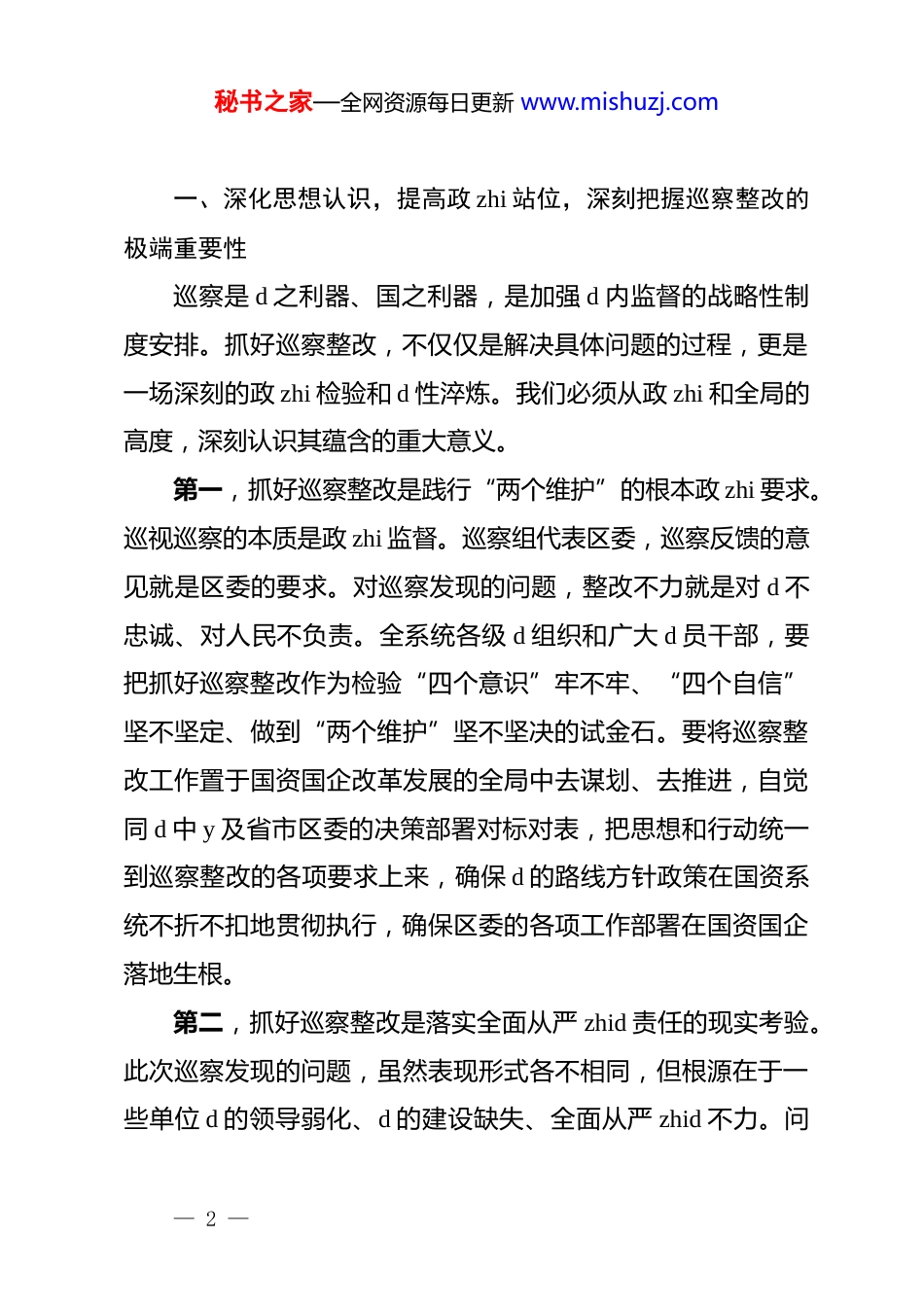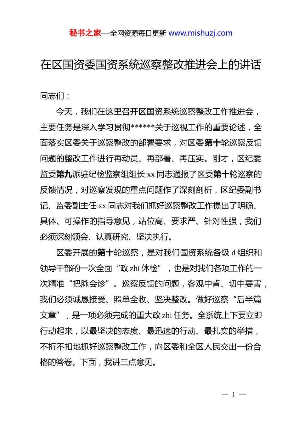 秘书之家—全网资源每日更新 www.mishuzj.com在区国资委国资系统巡察整改推进会上的讲话同志们:今天,我们在这里召开区国资系统巡察整改工作推进会,主要任务是深入学习贯彻******关于巡视工作的重要论述,全面落实区委关于巡察整改的部署要求,对区委第十轮巡察反馈问题的整改工作进行再动员、再部署、再压实。刚才,区纪委监委第九派驻纪检监察组组长 xx 同志通报了区委第十轮巡察的反馈情况,对巡察发现的重点问题作了深刻剖析,区纪委副书记、监委副主任 xx 同志对我们抓好巡察整改工作提出了明确、具体、可操作的指导意见,站位高、要求严、针对性强,我们必须深刻领会、认真研究、坚决执行。区委开展的第十轮巡察,是对我们国资系统各级 d 组织和领导干部的一次全面“政 zhi 体检”,也是对我们各项工作的一次精准“把脉会诊”。巡察反馈的问题,客观中肯、切中要害,我们必须诚恳接受、照单全收、坚决整改。做好巡察“后半篇文章”,是一项必须完成的重大政 zhi 任务。全系统上下要立即行动起来,以最坚决的态度、最迅速的行动、最扎实的举措,不折不扣地抓好巡察整改工作,向区委和全区人民交出一份合格的答卷。下面,我讲三点意见。— 1 —秘书之家—全网资源每日更新 www.mishuzj.com一、深化思想认识,提高政 zhi 站位,深刻把握巡察整改的极端重要性巡察是 d 之利器、国之利器,是加强 d 内监督的战略性制度安排。抓好巡察整改,不仅仅是解决具体问题的过程,更是一场深刻的政 zhi 检验和 d 性淬炼。我们必须从政 zhi 和全局的高度,深刻认识其蕴含的重大意义。第一,抓好巡察整改是践行“两个维护”的根本政 zhi 要求。巡视巡察的本质是政 zhi 监督。巡察组代表区委,巡察反馈的意见就是区委的要求。对巡察发现的问题,整改不力就是对 d 不忠诚、对人民不负责。全系统各级 d 组织和广大 d 员干部,要把抓好巡察整改作为检验“四个意识”牢不牢、“四个自信”坚不坚定、做到“两个维护”坚不坚决的试金石。要将巡察整改工作置于国资国企改革发展的全局中去谋划、去推进,自觉同 d 中 y 及省市区委的决策部署对标对表,把思想和行动统一到巡察整改的各项要求上来,确保 d 的路线方针政策在国资系统不折不扣地贯彻执行,确保区委的各项工作部署在国资国企落地生根。第二,抓好巡察整改是落实全面从严 zhid 责任的现实考验。此次巡察发现的问题,虽然表现形式各不相同,但根源在于一些单位 d 的领导弱化、d 的建设缺失、全面从严 zhid 不力。问— 2 —秘书之家—全网资源每日更新 www.mishuzj.com题表现在基层,根子在上面。这些问题警示我们,管 dzhid 的螺丝必须拧得更紧,全面从严 zhid 的责任必须压得更实。我们必须以此次巡察整改为契机,猛药去疴、重典 zhi 乱,坚决扛起管dzhid 主体责任,特别是各企业 d 组织书记要履行好“第一责任人”职责,班子成员要履行好“一岗双责”。要通过整改,层层传导压力,逐级压实责任,推动全面从严 zhid 在国资系统向纵深发展、向基层延伸,营造风清气正、干事创业的良好政 zhi生态。第三,抓好巡察整改是推动国资国企高质量发展的强大动力。巡察既是“显微镜”,也是“助推器”。巡察反馈的问题,正是我们国资国企在法人 zhi 理、风险防控、经营管理、队伍建设等方面的短板和弱项。这些问题如果得不到及时有效解决,必将成为制约企业发展的瓶颈和障碍。我们必须牢固树立“抓整改就是抓发展”的理念,把巡察整改的过程,转变为解决问题、堵塞漏洞的过程,转变为规范管理、提升效能的过程,转变为转变作风、促进发展的过程。要通过扎实的整改,切实破除制约企业发展的体制机制障碍,激发企业内生动力和市场活力,提升国有资本运营效率和核心竞争力,为我区经济社会发展大局作出新的更大贡献。二、聚焦关键环节,强化责任担当,以动真碰硬的举动确— 3 —秘书之家—全网资源每日更新 www.mishuzj.com保整改落实见底见效巡察反馈的问题已经明确,整改的路径已经清晰。接下来关键在于落实。全系统必须拿出“不破楼兰终不还”的决心和“钉钉子”的精神,真刀真...