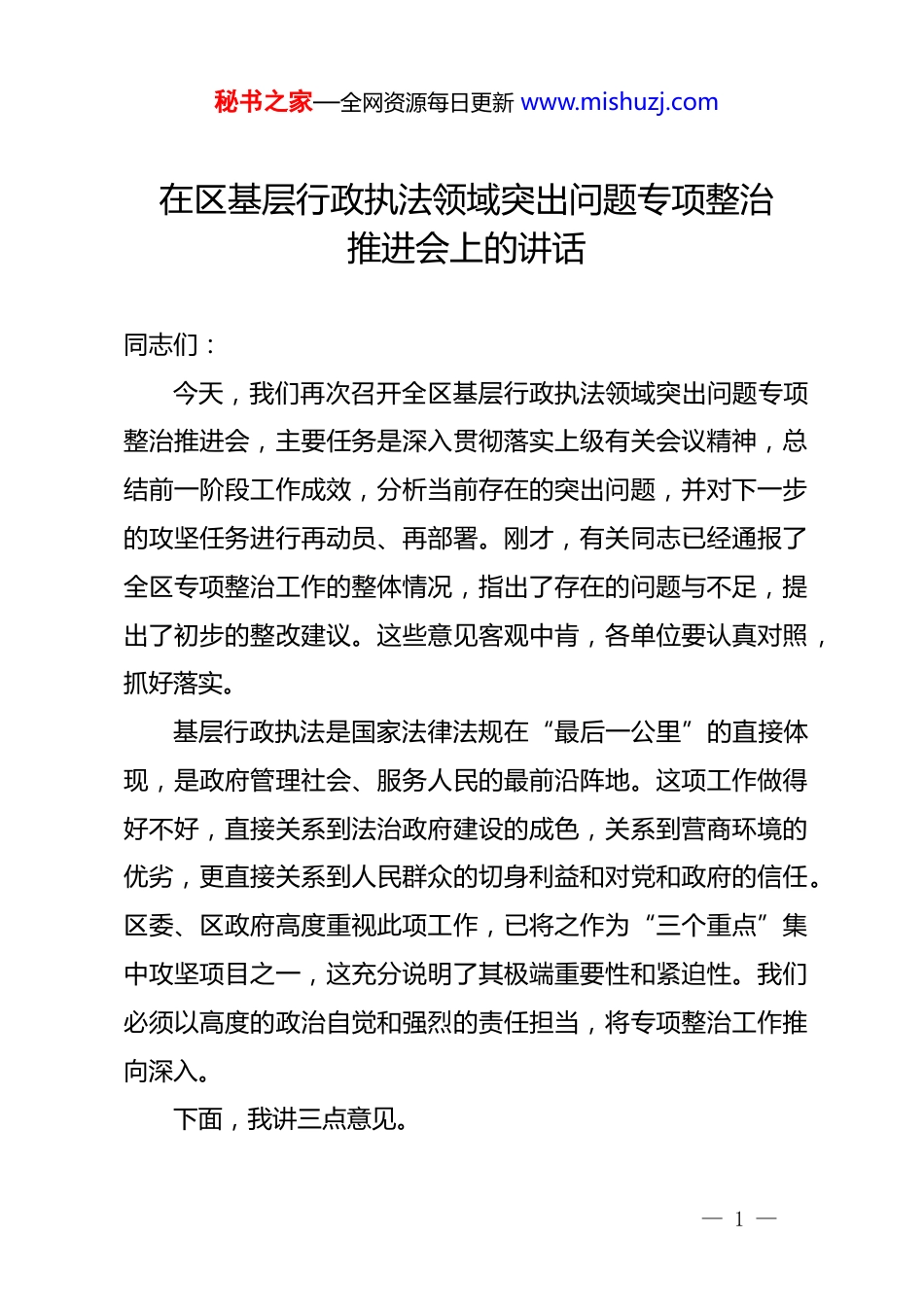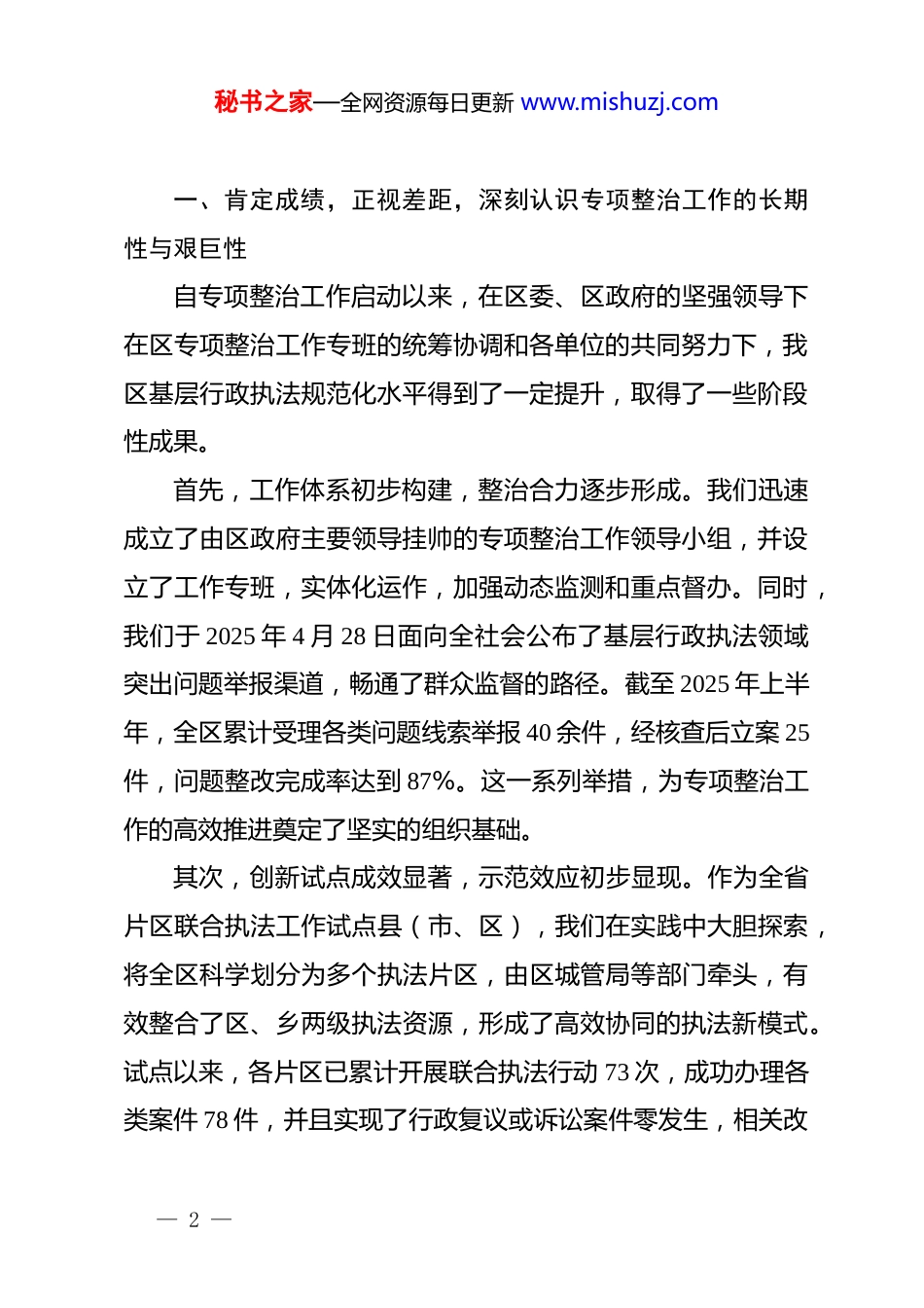 秘书之家—全网资源每日更新 www.mishuzj.com在区基层行政执法领域突出问题专项整治推进会上的讲话同志们:今天,我们再次召开全区基层行政执法领域突出问题专项整治推进会,主要任务是深入贯彻落实上级有关会议精神,总结前一阶段工作成效,分析当前存在的突出问题,并对下一步的攻坚任务进行再动员、再部署。刚才,有关同志已经通报了全区专项整治工作的整体情况,指出了存在的问题与不足,提出了初步的整改建议。这些意见客观中肯,各单位要认真对照,抓好落实。基层行政执法是国家法律法规在“最后一公里”的直接体现,是政府管理社会、服务人民的最前沿阵地。这项工作做得好不好,直接关系到法治政府建设的成色,关系到营商环境的优劣,更直接关系到人民群众的切身利益和对党和政府的信任。区委、区政府高度重视此项工作,已将之作为“三个重点”集中攻坚项目之一,这充分说明了其极端重要性和紧迫性。我们必须以高度的政治自觉和强烈的责任担当,将专项整治工作推向深入。下面,我讲三点意见。— 1 —秘书之家—全网资源每日更新 www.mishuzj.com一、肯定成绩,正视差距,深刻认识专项整治工作的长期性与艰巨性自专项整治工作启动以来,在区委、区政府的坚强领导下在区专项整治工作专班的统筹协调和各单位的共同努力下,我区基层行政执法规范化水平得到了一定提升,取得了一些阶段性成果。首先,工作体系初步构建,整治合力逐步形成。我们迅速成立了由区政府主要领导挂帅的专项整治工作领导小组,并设立了工作专班,实体化运作,加强动态监测和重点督办。同时,我们于 2025 年 4 月 28 日面向全社会公布了基层行政执法领域突出问题举报渠道,畅通了群众监督的路径。截至 2025 年上半年,全区累计受理各类问题线索举报 40 余件,经核查后立案 25件,问题整改完成率达到 87%。这一系列举措,为专项整治工作的高效推进奠定了坚实的组织基础。其次,创新试点成效显著,示范效应初步显现。作为全省片区联合执法工作试点县(市、区),我们在实践中大胆探索,将全区科学划分为多个执法片区,由区城管局等部门牵头,有效整合了区、乡两级执法资源,形成了高效协同的执法新模式。试点以来,各片区已累计开展联合执法行动 73 次,成功办理各类案件 78 件,并且实现了行政复议或诉讼案件零发生,相关改— 2 —秘书之家—全网资源每日更新 www.mishuzj.com革经验荣获省级改革创新案例一等奖形成了可复制、可推广的“XX 样本”。再者,数字赋能深度融合,执法质效稳步提升。我区全面推广应用“XX 执法”平台,实现了行政执法从立案、调查、取证到决定、执行的全流程线上办理与监督。目前,全区 300余家区、乡两级执法单位及全部执法人员均已入驻平台并常态化使用。截至目前,通过该平台累计录入的行政执法案件已达9992 件。平台的深度应用,不仅规范了执法行为,也极大地提升了执法监督的精准性和有效性。数据显示,2024 年以来,区政府行政复议案件的合法率保持在 100%,行政诉讼败诉率为零这充分证明了数字化转型带来的执法质量跃升。在肯定成绩的同时,我们更要清醒地看到工作中存在的短板和弱项。正如刚才通报中指出的,一些深层次、隐蔽性的问题尚未完全挖出;部分单位之间存在协同壁垒,“九龙治水”的现象依然存在;个别执法人员的法治观念、程序意识和业务能力仍有待提高;在涉企执法中,执法方式创新不足,“一刀切”式的执法现象偶有发生;“XX 执法”平台的数据应用还停留在“录入”和“统计”层面,距离真正的数据研判和决策辅助还有较大差距。这些问题,是阻碍我们工作向纵深发展的“拦路虎”,是必须下大力气解决的硬骨头。全区各级各部门— 3 —秘书之家—全网资源每日更新 www.mishuzj.com必须高度警醒,决不能有丝毫的松懈和麻痹思想。二、聚焦关键,精准施策,以攻坚态势推动专项整治取得新突破打赢专项整治这场攻坚战,必须坚持问题导向、目标导向结果导向,聚焦重点领域和关键环节,采取更加有力、更加精准的措施,推动各项任务落地见效。第一,持续优化涉企执法监督,全力打造一流营商环境。营商环境是区域发展的核心竞争力,而规...