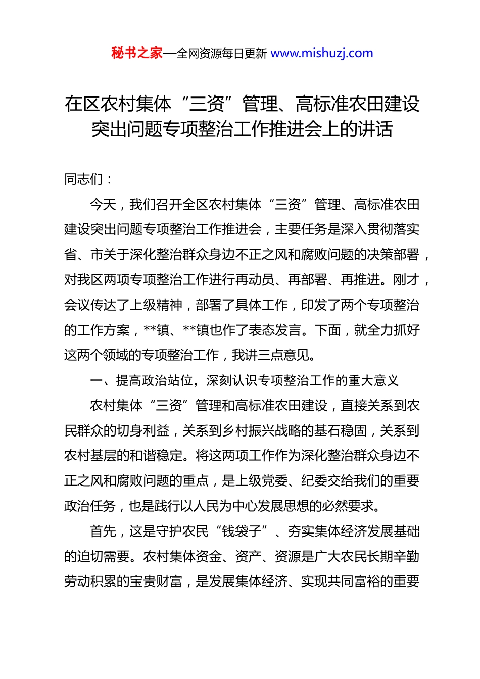秘书之家—全网资源每日更新 www.mishuzj.com在区农村集体“三资”管理、高标准农田建设突出问题专项整治工作推进会上的讲话 同志们:今天,我们召开全区农村集体“三资”管理、高标准农田建设突出问题专项整治工作推进会,主要任务是深入贯彻落实省、市关于深化整治群众身边不正之风和腐败问题的决策部署,对我区两项专项整治工作进行再动员、再部署、再推进。刚才,会议传达了上级精神,部署了具体工作,印发了两个专项整治的工作方案,**镇、**镇也作了表态发言。下面,就全力抓好这两个领域的专项整治工作,我讲三点意见。一、提高政治站位,深刻认识专项整治工作的重大意义农村集体“三资”管理和高标准农田建设,直接关系到农民群众的切身利益,关系到乡村振兴战略的基石稳固,关系到农村基层的和谐稳定。将这两项工作作为深化整治群众身边不正之风和腐败问题的重点,是上级党委、纪委交给我们的重要政治任务,也是践行以人民为中心发展思想的必然要求。首先,这是守护农民“钱袋子”、夯实集体经济发展基础的迫切需要。农村集体资金、资产、资源是广大农民长期辛勤劳动积累的宝贵财富,是发展集体经济、实现共同富裕的重要秘书之家—全网资源每日更新 www.mishuzj.com物质基础。近年来,从全国范围看,部分地方暴露出集体“三资”底数不清、合同不规范、财务混乱、资产流失等问题,严重侵害了农民权益,损害了党群干群关系。开展“三资”管理专项整治,就是要聚焦农村集体财务管理不规范、集体资产资源家底不清、集体经济合同不规范、集体工程项目管理不规范、集体债权债务管控不严格、集体“三资”监管信息化滞后以及其他管理方面问题等七个方面的突出问题,全面清查、彻底整治,把集体的“家底”摸清、管严、用好,切实维护好、发展好广大农民的根本利益。其次,这是保障粮食安全“命根子”、提升农业综合生产能力的关键举措。高标准农田是保障国家粮食安全的根本支撑。建设高标准农田,功在当代,利在千秋。然而,在高标准农田建设管理过程中,项目决策审批、招标投标、实施管理、资金使用、建后管护等关键环节存在一些不容忽视的突出问题,比如工程质量不达标、资金管理使用不规范、项目设计不合理、后期管护不到位等,影响了工程效益发挥和国家资金使用效益。开展专项整治,就是要围绕这些关键环节,全链条排查风险、堵塞漏洞、规范管理,确保建成一亩、管好一亩、见效一亩,真正把藏粮于地战略落到实处。全区各相关单位、各镇街务必从政治高度看待这次专项整秘书之家—全网资源每日更新 www.mishuzj.com治,深刻把握其内涵,切实克服松懈麻痹、应付过关的思想,以钉钉子精神将各项任务抓实抓细抓出成效,坚决守护好农民的利益和粮食安全的根基。二、聚焦重点关键,全力推动专项整治走深走实两项专项整治任务重、要求高,必须突出重点、把握关键以攻坚克难的决心和精准务实的举措,推动整治工作取得实实在在的突破。(一)在农村集体“三资”管理专项整治上要实现“七个清”。要严格按照《深化农村集体“三资”管理突出问题整治实施方案》要求,围绕七个重点方面,逐项对照、全面起底。一是财务账目要查清。全面核查村级财务收支情况,重点整治白条入账、坐收坐支、挪用公款、违规发放补贴等财务管理不规范问题,确保每一笔资金去向明白。二是资产资源要摸清。全面开展集体资产清产核资“回头看”,重点解决资产资源权属不清、台账不全、管理混乱问题,建立准确、完整的资产资源登记簿,做到家底清楚、权属明晰。三是经济合同要理清。全面清理审查集体经济合同,重点整治合同期限过长、价格明显偏低、条款显失公平、签订程序不规范、合同履行不到位等问题,切实规范资产资源发包租赁行为。四是工程项目要审清。严格审查集体工程项目立项、招投标、实施、验收、结算等全秘书之家—全网资源每日更新 www.mishuzj.com过程,重点整治未经招投标、拆分项目规避招投标、工程质量低劣、虚报工程量等问题,确保工程项目阳光运行、质量可靠。五是债权债务要核清。全面清理核实集体债权债务,重点整治违规举债、盲目举债、债权长期挂账不清理、债务化解不力等问题,有效防范...