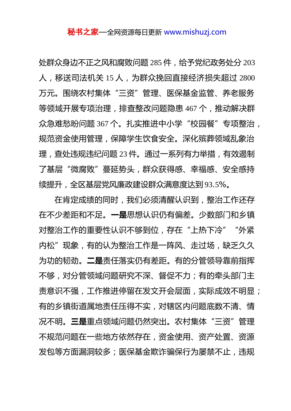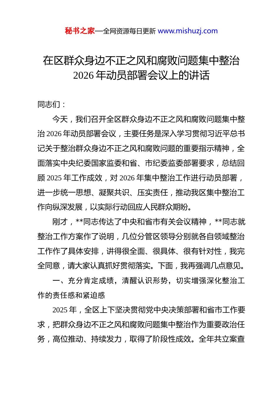 秘书之家—全网资源每日更新 www.mishuzj.com在区群众身边不正之风和腐败问题集中整治2026 年动员部署会议上的讲话 同志们:今天,我们召开全区群众身边不正之风和腐败问题集中整治 2026 年动员部署会议,主要任务是深入学习贯彻习近平总书记关于整治群众身边不正之风和腐败问题的重要指示精神,全面落实中央纪委国家监委和省、市纪委监委部署要求,总结回顾 2025 年工作成效,对 2026 年集中整治工作进行动员部署,进一步统一思想、凝聚共识、压实责任,推动我区集中整治工作向纵深发展,以实际行动回应人民群众期盼。刚才,**同志传达了中央和省市有关会议精神,**同志就整治工作方案作了说明,几位分管区领导分别就各自领域整治工作作了具体安排,讲得很全面、很具体、很有针对性,我完全同意,请大家认真抓好贯彻落实。下面,我再强调几点意见。一、充分肯定成绩,清醒认识形势,切实增强深化整治工作的责任感和紧迫感2025 年,全区上下坚决贯彻党中央决策部署和省市工作要求,把群众身边不正之风和腐败问题集中整治作为重要政治任务,高位推动、持续发力,取得了阶段性成效。全年共立案查秘书之家—全网资源每日更新 www.mishuzj.com处群众身边不正之风和腐败问题 285 件,给予党纪政务处分 203人,移送司法机关 15 人,为群众挽回直接经济损失超过 2800万元。围绕农村集体“三资”管理、医保基金监管、养老服务等领域开展专项治理,排查整改问题隐患 467 个,推动解决群众急难愁盼问题 367 个。扎实推进中小学“校园餐”专项整治,规范资金使用管理,保障学生饮食安全。深化殡葬领域乱象治理,查处违规违纪问题 23 件。通过一系列有力举措,有效遏制了基层“微腐败”蔓延势头,群众获得感、幸福感、安全感持续提升,全区基层党风廉政建设群众满意度达到 93.5%。在肯定成绩的同时,我们必须清醒认识到,整治工作还存在不少差距和不足。一是思想认识仍有偏差。少数部门和乡镇对整治工作的重要性认识不够到位,存在“上热下冷”“外紧内松”现象,有的认为整治工作是一阵风、走过场,缺乏久久为功的韧劲。二是责任落实仍有差距。有的分管领导靠前指挥不够,对分管领域问题研究不深、督促不力;有的牵头部门主责意识不强,工作推进停留在发文开会层面,实际成效不明显;有的乡镇街道属地责任压得不实,对辖区内问题底数不清、情况不明。三是重点领域问题仍然突出。农村集体“三资”管理不规范问题在一些地方依然存在,资金使用、资产处置、资源发包等方面漏洞较多;医保基金欺诈骗保行为屡禁不止,违规秘书之家—全网资源每日更新 www.mishuzj.com开药、虚假诊疗等问题时有发生;惠民政策落实中的“微腐败”问题尚未根除,有的截留挪用、虚报冒领、吃拿卡要。四是长效机制建设仍需加强。有的单位重整治轻建设,案件查办与制度建设脱节,同类问题反复出现;有的制度执行不严格,形同虚设,没有真正发挥约束作用。2026 年是群众身边不正之风和腐败问题集中整治的攻坚之年、深化之年。中央纪委国家监委明确要求,要保持力度不减、尺度不松、标准不降,持续深化整治工作。全区各级各部门要从政治和全局的高度,深刻认识深化整治工作的重大意义,切实把思想和行动统一到党中央决策部署上来,以更加坚定的决心、更加有力的举措、更加务实的作风,推动整治工作取得更大成效。二、精准聚焦重点,打好三个突击战,坚决啃下“硬骨头”整治工作必须聚焦重点、精准发力。今年要在巩固去年成果基础上,集中力量打好三个突击战。第一,打好医保基金管理专项整治突击战。医保基金是人民群众的“看病钱”“救命钱”,欺诈骗保行为性质恶劣、影响极坏。国家医保局去年部署开展了医保基金管理突出问题专项整治“百日行动”,今年持续深化这一工作。要紧盯定点医疗机构、定点零售药店、参保人员等重点主体,聚焦虚假诊疗、秘书之家—全网资源每日更新 www.mishuzj.com虚假住院、虚假购药、违规开药、倒卖医保回流药品等突出问题,开展拉网式排查、全覆盖检查。要充分运用大数据手段,建立智能监控模型,对住院率畸高、费用异常增长、药品消耗异常的机构和个人实施精准打...