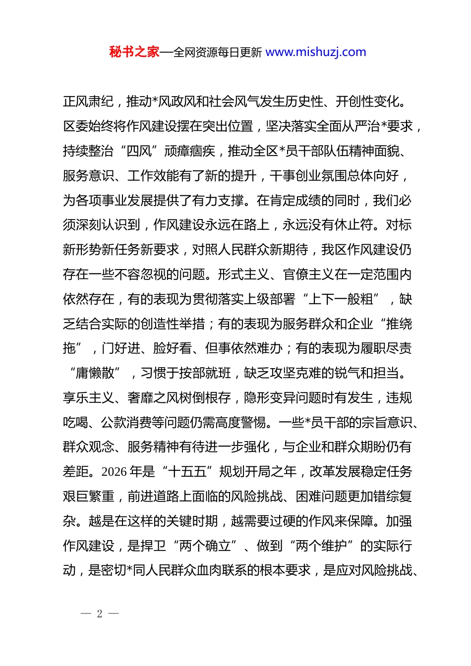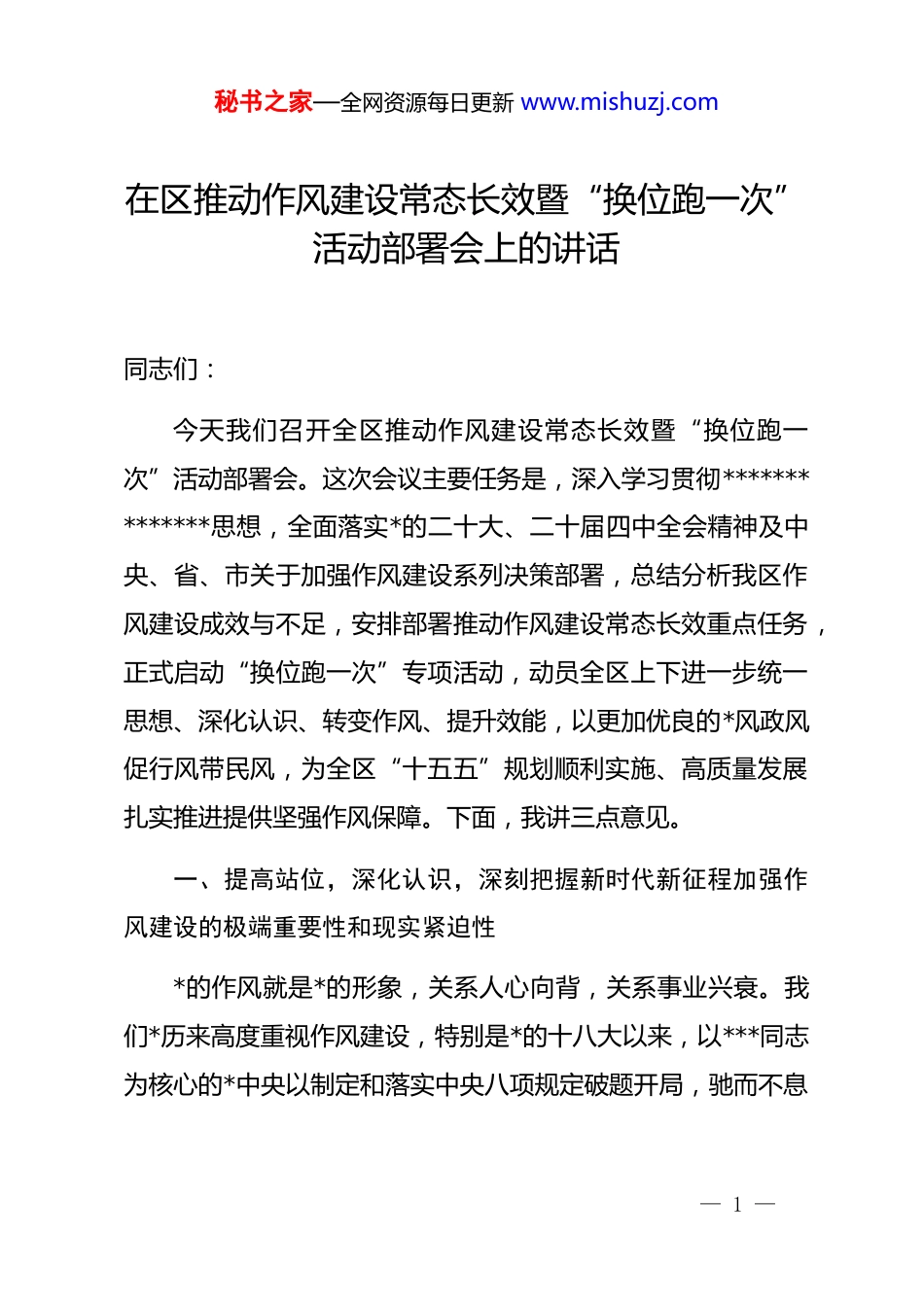 秘书之家—全网资源每日更新 www.mishuzj.com在区推动作风建设常态长效暨“换位跑一次”活动部署会上的讲话同志们:今天我们召开全区推动作风建设常态长效暨“换位跑一次”活动部署会。这次会议主要任务是,深入学习贯彻**************思想,全面落实*的二十大、二十届四中全会精神及中央、省、市关于加强作风建设系列决策部署,总结分析我区作风建设成效与不足,安排部署推动作风建设常态长效重点任务,正式启动“换位跑一次”专项活动,动员全区上下进一步统一思想、深化认识、转变作风、提升效能,以更加优良的*风政风促行风带民风,为全区“十五五”规划顺利实施、高质量发展扎实推进提供坚强作风保障。下面,我讲三点意见。一、提高站位,深化认识,深刻把握新时代新征程加强作风建设的极端重要性和现实紧迫性*的作风就是*的形象,关系人心向背,关系事业兴衰。我们*历来高度重视作风建设,特别是*的十八大以来,以***同志为核心的*中央以制定和落实中央八项规定破题开局,驰而不息— 1 —秘书之家—全网资源每日更新 www.mishuzj.com正风肃纪,推动*风政风和社会风气发生历史性、开创性变化。区委始终将作风建设摆在突出位置,坚决落实全面从严治*要求,持续整治“四风”顽瘴痼疾,推动全区*员干部队伍精神面貌、服务意识、工作效能有了新的提升,干事创业氛围总体向好,为各项事业发展提供了有力支撑。在肯定成绩的同时,我们必须深刻认识到,作风建设永远在路上,永远没有休止符。对标新形势新任务新要求,对照人民群众新期待,我区作风建设仍存在一些不容忽视的问题。形式主义、官僚主义在一定范围内依然存在,有的表现为贯彻落实上级部署“上下一般粗”,缺乏结合实际的创造性举措;有的表现为服务群众和企业“推绕拖”,门好进、脸好看、但事依然难办;有的表现为履职尽责“庸懒散”,习惯于按部就班,缺乏攻坚克难的锐气和担当。享乐主义、奢靡之风树倒根存,隐形变异问题时有发生,违规吃喝、公款消费等问题仍需高度警惕。一些*员干部的宗旨意识、群众观念、服务精神有待进一步强化,与企业和群众期盼仍有差距。2026 年是“十五五”规划开局之年,改革发展稳定任务艰巨繁重,前进道路上面临的风险挑战、困难问题更加错综复杂。越是在这样的关键时期,越需要过硬的作风来保障。加强作风建设,是捍卫“两个确立”、做到“两个维护”的实际行动,是密切*同人民群众血肉联系的根本要求,是应对风险挑战、— 2 —秘书之家—全网资源每日更新 www.mishuzj.com推动高质量发展的重要保障,是锻造忠诚干净担当干部队伍的迫切需要。全区上下必须站在政治和全局高度,深刻认识作风建设常态长效的极端重要性,深刻认识当前作风问题的顽固性反复性,深刻认识开展“换位跑一次”活动对于推动作风转变、优化营商环境、提升治理效能的重要意义,切实增强抓好作风建设的政治自觉、思想自觉和行动自觉,以永远在路上的坚韧和执着,将作风建设不断引向深入。二、聚焦重点,精准发力,全力推动作风建设常态长效与“换位跑一次”活动走深走实推动作风建设常态长效,必须坚持系统施治、标本兼治,既要抓常抓长,融入日常,也要聚焦突出问题,开展专项整治。“换位跑一次”活动是今年我区加强作风建设、提升服务效能的重要载体和有力抓手,必须精心组织,务求实效。重点要抓好以下三个方面工作:(一)聚焦筑牢思想根基,在深化理论武装、强化宗旨意识上持续用力。作风问题本质上是*性问题、宗旨问题。必须坚持从思想源头抓起,拧紧“总开关”。一是坚持不懈强化创新理论武装。要巩固拓展学习贯彻**************思想 zt 教育成果,建立健全常态化长效化学习机制。要把深入学习《***谈治— 3 —秘书之家—全网资源每日更新 www.mishuzj.com国理政》第五卷、深入传达学习*的二十届四中全会精神作为重大政治任务,纳入*委(*组)理论学习中心组学习、干部教育培训、支部学习重要内容,教育引导广大*员干部深刻领悟蕴含其中的立场观点方法,深刻把握关于*的自我革命、全面从严治*、作风建设的重要论述,自觉用以武装头脑、指导实践、推动工作,不断提高政治判断力、政治领悟力、政治...