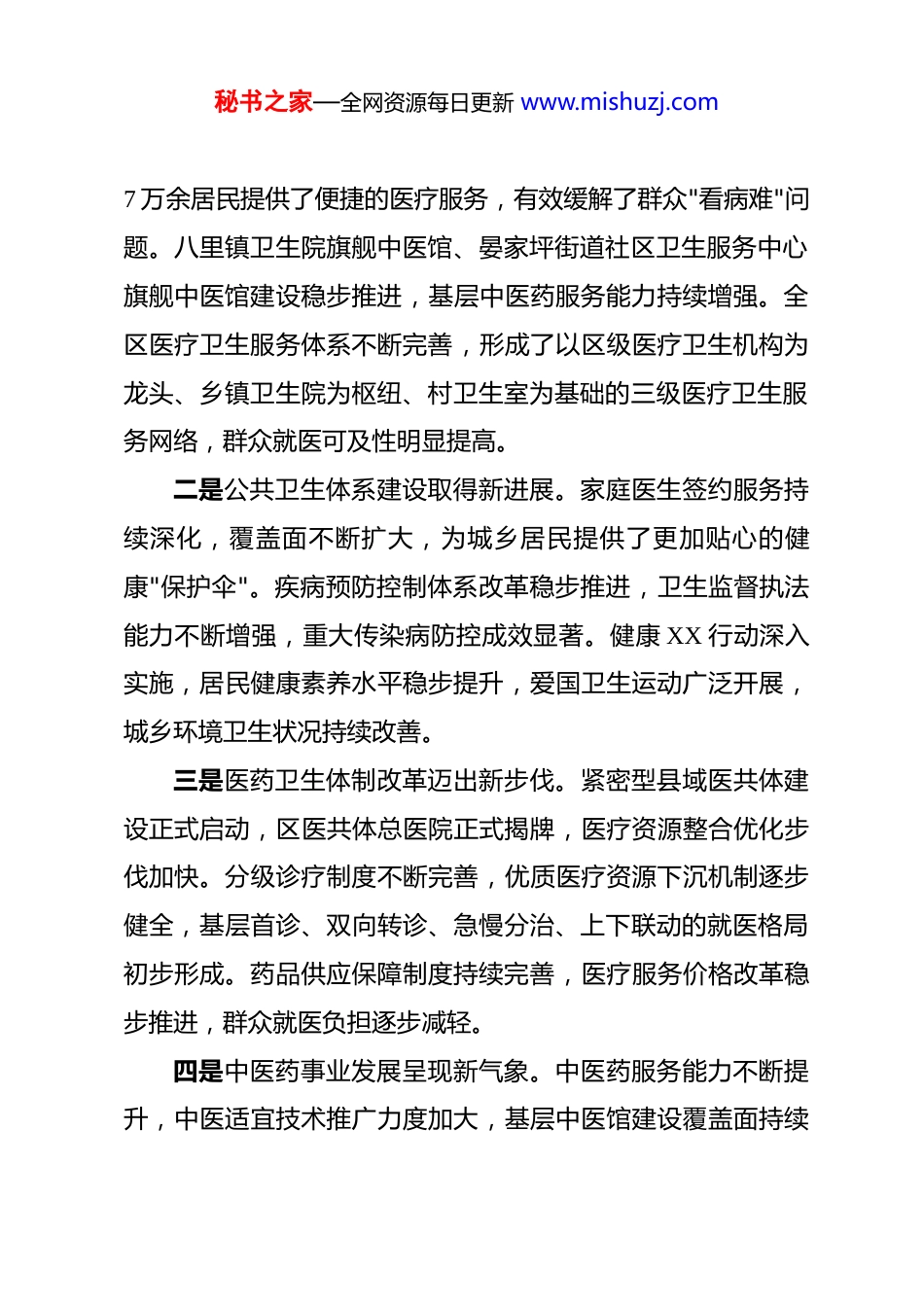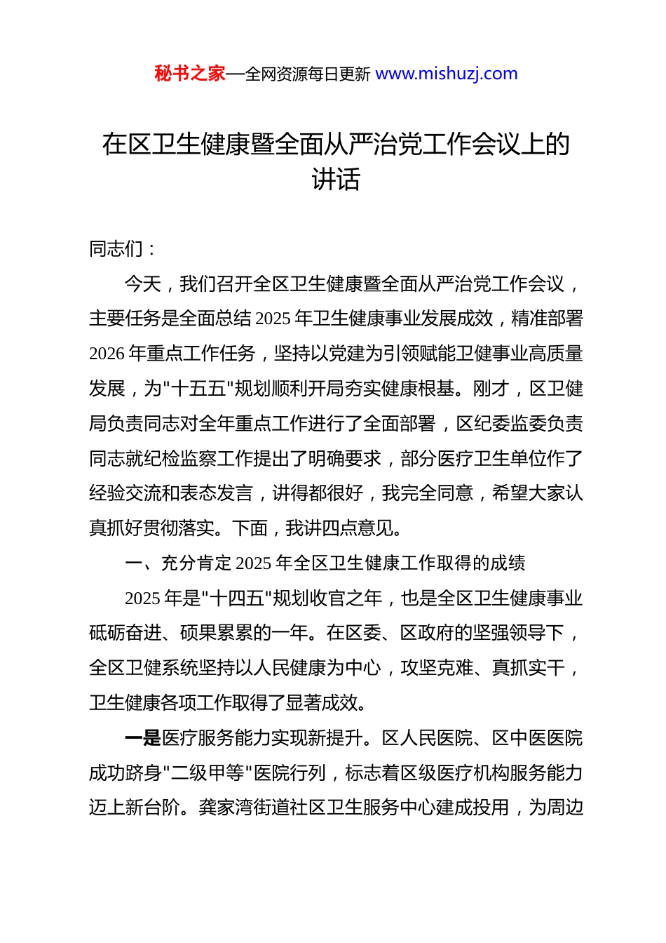 秘书之家—全网资源每日更新 www.mishuzj.com在区卫生健康暨全面从严治党工作会议上的讲话 同志们:今天,我们召开全区卫生健康暨全面从严治党工作会议,主要任务是全面总结 2025 年卫生健康事业发展成效,精准部署2026 年重点工作任务,坚持以党建为引领赋能卫健事业高质量发展,为"十五五"规划顺利开局夯实健康根基。刚才,区卫健局负责同志对全年重点工作进行了全面部署,区纪委监委负责同志就纪检监察工作提出了明确要求,部分医疗卫生单位作了经验交流和表态发言,讲得都很好,我完全同意,希望大家认真抓好贯彻落实。下面,我讲四点意见。一、充分肯定 2025 年全区卫生健康工作取得的成绩2025 年是"十四五"规划收官之年,也是全区卫生健康事业砥砺奋进、硕果累累的一年。在区委、区政府的坚强领导下,全区卫健系统坚持以人民健康为中心,攻坚克难、真抓实干,卫生健康各项工作取得了显著成效。一是医疗服务能力实现新提升。区人民医院、区中医医院成功跻身"二级甲等"医院行列,标志着区级医疗机构服务能力迈上新台阶。龚家湾街道社区卫生服务中心建成投用,为周边秘书之家—全网资源每日更新 www.mishuzj.com7 万余居民提供了便捷的医疗服务,有效缓解了群众"看病难"问题。八里镇卫生院旗舰中医馆、晏家坪街道社区卫生服务中心旗舰中医馆建设稳步推进,基层中医药服务能力持续增强。全区医疗卫生服务体系不断完善,形成了以区级医疗卫生机构为龙头、乡镇卫生院为枢纽、村卫生室为基础的三级医疗卫生服务网络,群众就医可及性明显提高。二是公共卫生体系建设取得新进展。家庭医生签约服务持续深化,覆盖面不断扩大,为城乡居民提供了更加贴心的健康"保护伞"。疾病预防控制体系改革稳步推进,卫生监督执法能力不断增强,重大传染病防控成效显著。健康 XX 行动深入实施,居民健康素养水平稳步提升,爱国卫生运动广泛开展,城乡环境卫生状况持续改善。三是医药卫生体制改革迈出新步伐。紧密型县域医共体建设正式启动,区医共体总医院正式揭牌,医疗资源整合优化步伐加快。分级诊疗制度不断完善,优质医疗资源下沉机制逐步健全,基层首诊、双向转诊、急慢分治、上下联动的就医格局初步形成。药品供应保障制度持续完善,医疗服务价格改革稳步推进,群众就医负担逐步减轻。四是中医药事业发展呈现新气象。中医药服务能力不断提升,中医适宜技术推广力度加大,基层中医馆建设覆盖面持续秘书之家—全网资源每日更新 www.mishuzj.com扩大。中医药人才培养力度加大,中医药文化宣传深入人心,中医药在疾病预防、治疗、康复中的独特优势得到更好发挥。五是全面从严治党取得新成效。全区卫健系统深入学习贯彻党的二十大和二十届三中、四中全会精神,扎实开展党纪学习教育,党员干部纪律规矩意识明显增强。党风廉政建设责任制全面落实,廉政风险防控机制不断健全,医药领域腐败问题集中整治深入开展,医德医风建设持续加强,行业风气持续向好。这些成绩的取得,是区委、区政府坚强领导的结果,是上级卫健部门精心指导的结果,更是全区卫健系统广大干部职工团结奋斗、无私奉献的结果。在此,我代表区政府,向全区卫健系统广大干部职工表示衷心的感谢和崇高的敬意!在肯定成绩的同时,我们也要清醒地认识到,全区卫生健康事业发展还面临不少困难和挑战:优质医疗资源总量不足、分布不均衡的问题依然突出;基层医疗服务能力有待进一步提升;公共卫生应急能力还需加强;医药卫生体制改革还需持续深化;全面从严治党仍需持续发力。对于这些问题,我们必须高度重视,采取有力措施切实加以解决。二、准确把握当前卫生健康工作面临的新形势新要求2026 年是"十五五"规划开局之年,也是推进健康 XX 建设秘书之家—全网资源每日更新 www.mishuzj.com的关键之年。做好今年的卫生健康工作,意义重大、责任重大。我们要准确把握新形势新要求,切实增强做好工作的责任感和紧迫感。第一,要深刻认识卫生健康事业发展的新定位。党的二十大报告明确提出,推进健康中国建设,把保障人民健康放在优先发展的战略位置。这充分体现了党中央对人民健康的高度重视。我们要始终坚持以人民健康为中心的...