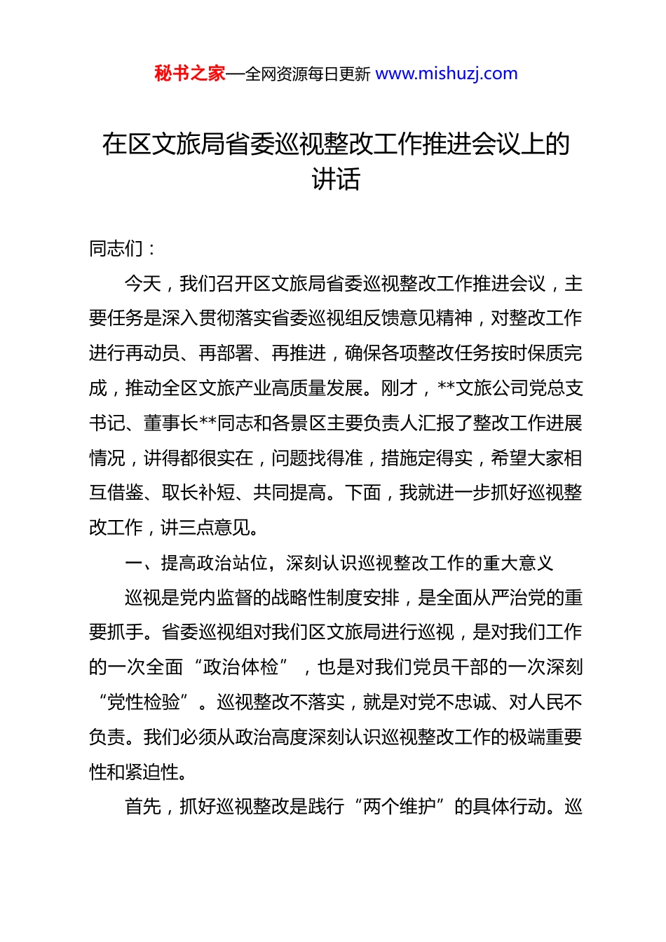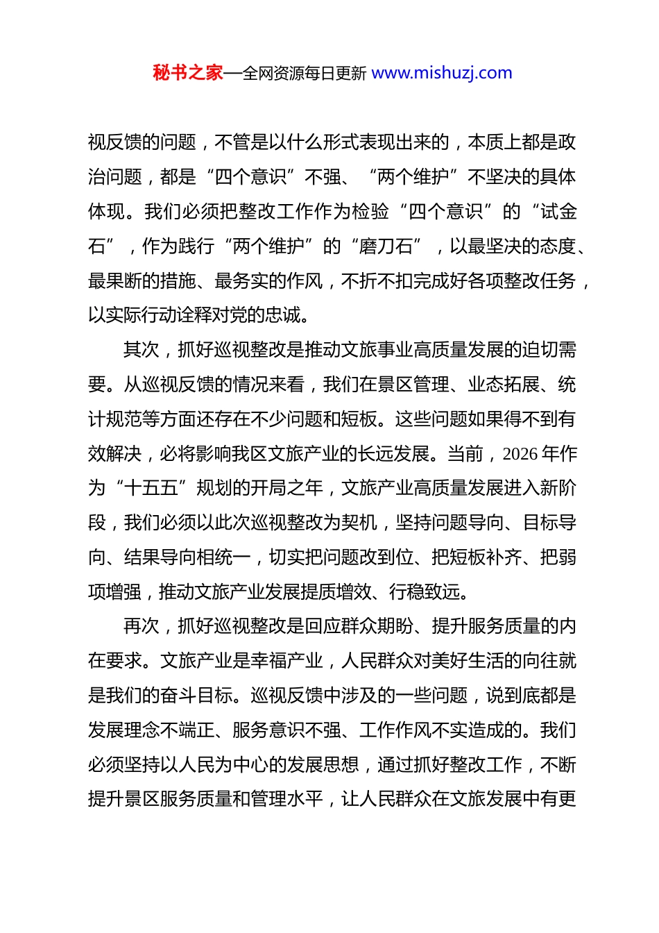 秘书之家—全网资源每日更新 www.mishuzj.com在区文旅局省委巡视整改工作推进会议上的讲话 同志们:今天,我们召开区文旅局省委巡视整改工作推进会议,主要任务是深入贯彻落实省委巡视组反馈意见精神,对整改工作进行再动员、再部署、再推进,确保各项整改任务按时保质完成,推动全区文旅产业高质量发展。刚才,**文旅公司党总支书记、董事长**同志和各景区主要负责人汇报了整改工作进展情况,讲得都很实在,问题找得准,措施定得实,希望大家相互借鉴、取长补短、共同提高。下面,我就进一步抓好巡视整改工作,讲三点意见。一、提高政治站位,深刻认识巡视整改工作的重大意义巡视是党内监督的战略性制度安排,是全面从严治党的重要抓手。省委巡视组对我们区文旅局进行巡视,是对我们工作的一次全面“政治体检”,也是对我们党员干部的一次深刻“党性检验”。巡视整改不落实,就是对党不忠诚、对人民不负责。我们必须从政治高度深刻认识巡视整改工作的极端重要性和紧迫性。首先,抓好巡视整改是践行“两个维护”的具体行动。巡秘书之家—全网资源每日更新 www.mishuzj.com视反馈的问题,不管是以什么形式表现出来的,本质上都是政治问题,都是“四个意识”不强、“两个维护”不坚决的具体体现。我们必须把整改工作作为检验“四个意识”的“试金石”,作为践行“两个维护”的“磨刀石”,以最坚决的态度、最果断的措施、最务实的作风,不折不扣完成好各项整改任务,以实际行动诠释对党的忠诚。其次,抓好巡视整改是推动文旅事业高质量发展的迫切需要。从巡视反馈的情况来看,我们在景区管理、业态拓展、统计规范等方面还存在不少问题和短板。这些问题如果得不到有效解决,必将影响我区文旅产业的长远发展。当前,2026 年作为“十五五”规划的开局之年,文旅产业高质量发展进入新阶段,我们必须以此次巡视整改为契机,坚持问题导向、目标导向、结果导向相统一,切实把问题改到位、把短板补齐、把弱项增强,推动文旅产业发展提质增效、行稳致远。再次,抓好巡视整改是回应群众期盼、提升服务质量的内在要求。文旅产业是幸福产业,人民群众对美好生活的向往就是我们的奋斗目标。巡视反馈中涉及的一些问题,说到底都是发展理念不端正、服务意识不强、工作作风不实造成的。我们必须坚持以人民为中心的发展思想,通过抓好整改工作,不断提升景区服务质量和管理水平,让人民群众在文旅发展中有更秘书之家—全网资源每日更新 www.mishuzj.com多获得感、幸福感、安全感。二、聚焦重点任务,全力推进巡视整改工作落地见效巡视整改是一项系统工程,必须抓住关键、突出重点、精准发力。刚才,会议明确提出了三项重点工作要求,我完全同意。下面,我结合当前形势和实际情况,再作进一步强调和部署。第一,抓实整改提升,推动多元发展,着力破解门票依赖难题各景区要严格对照整改任务清单,逐项细化措施、限期清零。在此基础上,要深刻认识到,传统“门票经济”模式已难以为继,景区收入模式正从“门票经济”向“生态经济”转变。据行业研究显示,A 股上市景区企业非门票收入占比平均已达61.3%,部分头部企业该比例已突破 75%。江苏省更是提出到2026 年,全省 4A 级及以上旅游景区非门票收入占比力争达60%以上。这些数据充分说明,破除门票依赖、拓展多元业态,已成为景区高质量发展的必由之路。我们必须正视差距、找准症结。从巡视反馈和日常调研情况来看,我区部分景区仍存在门票收入占比偏高、业态单一、二次消费不足等问题。部分景区门票收入占总营收比重超过70%,远高于行业先进水平。这种收入结构不仅抗风险能力弱,秘书之家—全网资源每日更新 www.mishuzj.com而且难以满足游客日益多样化的消费需求。杭州西湖景区全面免票后,周边商业收入大幅增长,带动了相关产业增收;重庆**洞免费开放,有效拉动了城市餐饮、住宿和交通消费增长。这些成功案例启示我们,门票优惠乃至免票,不应被视为“损失”,而应作为吸引客流、拉动消费的重要手段。各景区要在完成整改的基础上,着力从以下几个方面拓展多元业态:一是发展文创产业。深入挖掘景区文化内涵,开发具有地方特色、文化品位的...