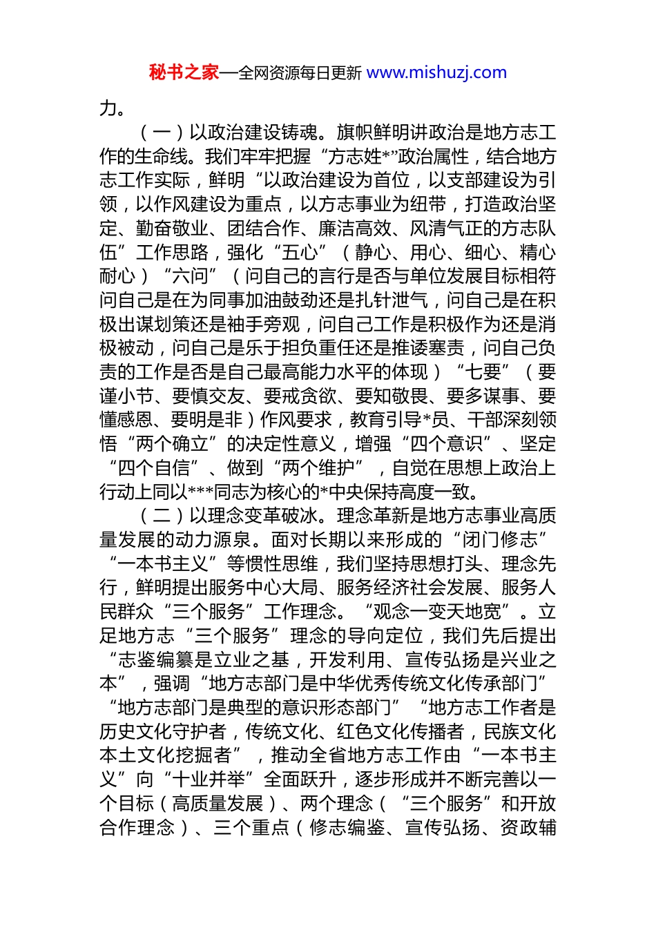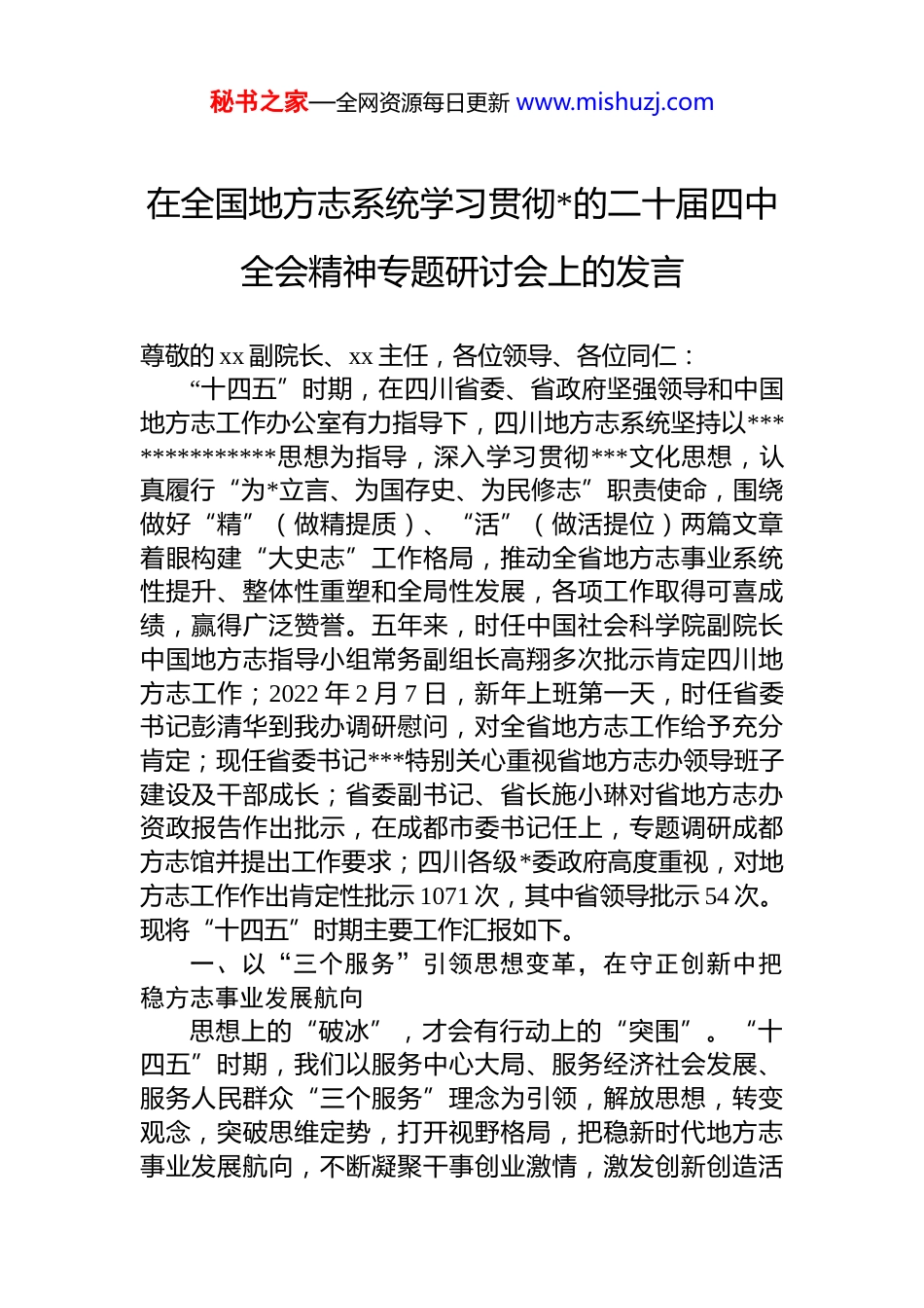 秘书之家—全网资源每日更新 www.mishuzj.com在全国地方志系统学习贯彻*的二十届四中全会精神专题研讨会上的发言尊敬的 xx 副院长、xx 主任,各位领导、各位同仁:“十四五”时期,在四川省委、省政府坚强领导和中国地方志工作办公室有力指导下,四川地方志系统坚持以**************思想为指导,深入学习贯彻***文化思想,认真履行“为*立言、为国存史、为民修志”职责使命,围绕做好“精”(做精提质)、“活”(做活提位)两篇文章着眼构建“大史志”工作格局,推动全省地方志事业系统性提升、整体性重塑和全局性发展,各项工作取得可喜成绩,赢得广泛赞誉。五年来,时任中国社会科学院副院长中国地方志指导小组常务副组长高翔多次批示肯定四川地方志工作;2022 年 2 月 7 日,新年上班第一天,时任省委书记彭清华到我办调研慰问,对全省地方志工作给予充分肯定;现任省委书记***特别关心重视省地方志办领导班子建设及干部成长;省委副书记、省长施小琳对省地方志办资政报告作出批示,在成都市委书记任上,专题调研成都方志馆并提出工作要求;四川各级*委政府高度重视,对地方志工作作出肯定性批示 1071 次,其中省领导批示 54 次。现将“十四五”时期主要工作汇报如下。一、以“三个服务”引领思想变革,在守正创新中把稳方志事业发展航向思想上的“破冰”,才会有行动上的“突围”。“十四五”时期,我们以服务中心大局、服务经济社会发展、服务人民群众“三个服务”理念为引领,解放思想,转变观念,突破思维定势,打开视野格局,把稳新时代地方志事业发展航向,不断凝聚干事创业激情,激发创新创造活秘书之家—全网资源每日更新 www.mishuzj.com力。(一)以政治建设铸魂。旗帜鲜明讲政治是地方志工作的生命线。我们牢牢把握“方志姓*”政治属性,结合地方志工作实际,鲜明“以政治建设为首位,以支部建设为引领,以作风建设为重点,以方志事业为纽带,打造政治坚定、勤奋敬业、团结合作、廉洁高效、风清气正的方志队伍”工作思路,强化“五心”(静心、用心、细心、精心耐心)“六问”(问自己的言行是否与单位发展目标相符问自己是在为同事加油鼓劲还是扎针泄气,问自己是在积极出谋划策还是袖手旁观,问自己工作是积极作为还是消极被动,问自己是乐于担负重任还是推诿塞责,问自己负责的工作是否是自己最高能力水平的体现)“七要”(要谨小节、要慎交友、要戒贪欲、要知敬畏、要多谋事、要懂感恩、要明是非)作风要求,教育引导*员、干部深刻领悟“两个确立”的决定性意义,增强“四个意识”、坚定“四个自信”、做到“两个维护”,自觉在思想上政治上行动上同以***同志为核心的*中央保持高度一致。(二)以理念变革破冰。理念革新是地方志事业高质量发展的动力源泉。面对长期以来形成的“闭门修志”“一本书主义”等惯性思维,我们坚持思想打头、理念先行,鲜明提出服务中心大局、服务经济社会发展、服务人民群众“三个服务”工作理念。“观念一变天地宽”。立足地方志“三个服务”理念的导向定位,我们先后提出“志鉴编纂是立业之基,开发利用、宣传弘扬是兴业之本”,强调“地方志部门是中华优秀传统文化传承部门”“地方志部门是典型的意识形态部门”“地方志工作者是历史文化守护者,传统文化、红色文化传播者,民族文化本土文化挖掘者”,推动全省地方志工作由“一本书主义”向“十业并举”全面跃升,逐步形成并不断完善以一个目标(高质量发展)、两个理念(“三个服务”和开放合作理念)、三个重点(修志编鉴、宣传弘扬、资政辅秘书之家—全网资源每日更新 www.mishuzj.com治)、四个建设(质量体系建设、核心品牌建设、史志阵地建设、干部队伍建设)为主体内容的“1234”工作思路和规划体系,探索出一条具有方志特点、四川特色、时代特质的地方志事业高质量发展“四川路径”。(三)以开放合作聚力。开放合作是提升方志文化影响力的放大器。众人拾柴火焰高。我们充分认识到,地方志是“一方之全史”,外延广泛、内涵丰富,做好地方志工作,仅限于地方志系统的力量是不够的,需全社会共同参与,形成强大合力。我们秉持开放理念,敞开大门,与社会...