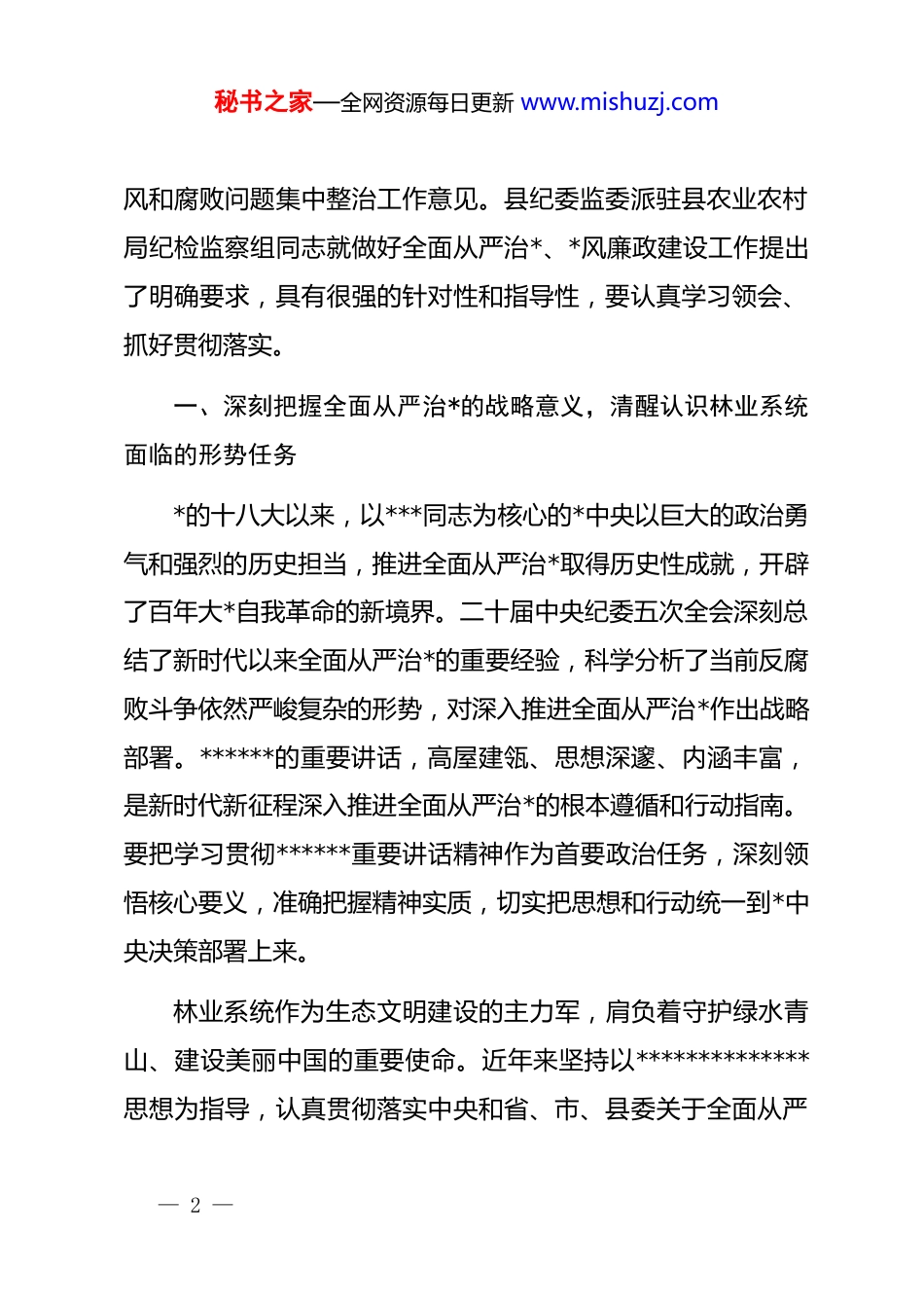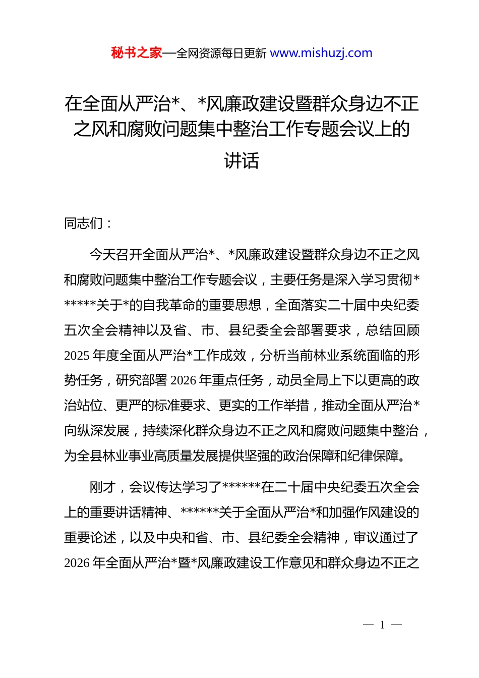 秘书之家—全网资源每日更新 www.mishuzj.com在全面从严治*、*风廉政建设暨群众身边不正之风和腐败问题集中整治工作专题会议上的讲话同志们:今天召开全面从严治*、*风廉政建设暨群众身边不正之风和腐败问题集中整治工作专题会议,主要任务是深入学习贯彻******关于*的自我革命的重要思想,全面落实二十届中央纪委五次全会精神以及省、市、县纪委全会部署要求,总结回顾2025 年度全面从严治*工作成效,分析当前林业系统面临的形势任务,研究部署 2026 年重点任务,动员全局上下以更高的政治站位、更严的标准要求、更实的工作举措,推动全面从严治*向纵深发展,持续深化群众身边不正之风和腐败问题集中整治,为全县林业事业高质量发展提供坚强的政治保障和纪律保障。刚才,会议传达学习了******在二十届中央纪委五次全会上的重要讲话精神、******关于全面从严治*和加强作风建设的重要论述,以及中央和省、市、县纪委全会精神,审议通过了2026 年全面从严治*暨*风廉政建设工作意见和群众身边不正之— 1 —秘书之家—全网资源每日更新 www.mishuzj.com风和腐败问题集中整治工作意见。县纪委监委派驻县农业农村局纪检监察组同志就做好全面从严治*、*风廉政建设工作提出了明确要求,具有很强的针对性和指导性,要认真学习领会、抓好贯彻落实。一、深刻把握全面从严治*的战略意义,清醒认识林业系统面临的形势任务*的十八大以来,以***同志为核心的*中央以巨大的政治勇气和强烈的历史担当,推进全面从严治*取得历史性成就,开辟了百年大*自我革命的新境界。二十届中央纪委五次全会深刻总结了新时代以来全面从严治*的重要经验,科学分析了当前反腐败斗争依然严峻复杂的形势,对深入推进全面从严治*作出战略部署。******的重要讲话,高屋建瓴、思想深邃、内涵丰富,是新时代新征程深入推进全面从严治*的根本遵循和行动指南。要把学习贯彻******重要讲话精神作为首要政治任务,深刻领悟核心要义,准确把握精神实质,切实把思想和行动统一到*中央决策部署上来。林业系统作为生态文明建设的主力军,肩负着守护绿水青山、建设美丽中国的重要使命。近年来坚持以**************思想为指导,认真贯彻落实中央和省、市、县委关于全面从严— 2 —秘书之家—全网资源每日更新 www.mishuzj.com治*的各项决策部署,扎实开展 dj 学习教育,持续强化政治监督,深入推进正风肃纪反腐,全面从严治*取得阶段性成效。但必须清醒看到,林业系统廉政风险依然存在,群众身边不正之风和腐败问题禁而未绝。从资金管理领域看,林业项目资金种类多、体量大、链条长,涉及生态补偿、造林补贴、森林防火、病虫害防治等多个方面,资金使用管理环节存在监管盲区和制度漏洞,个别地方和人员存在套取、挪用、截留项目资金的隐患。从行政执法领域看,林政执法涉及林木采伐许可、林地使用审批、木材运输检查、野生动物保护等多个环节,执法自由裁量权较大,存在执法不规范、选择性执法、以罚代管等问题的风险。从资源管理领域看,森林资源调查、公益林划定、采伐指标分配等业务涉及群众切身利益,存在优亲厚友、以权谋私等廉政风险点。从队伍建设领域看,个别*员干部纪法意识淡薄,工作作风不实,服务群众不够主动、不够细致,影响了林业部门的形象和公信力。这些问题警示我们,全面从严治*永远在路上,*的自我革命永远在路上。绝不能有松劲歇脚、疲劳厌战的情绪,绝不能有差不多了、该松口气、歇歇脚的想法,必须始终保持“赶考”的清醒和坚定,以永远在路上的执着把全面从严治*引向深— 3 —秘书之家—全网资源每日更新 www.mishuzj.com入。二、聚焦重点任务精准发力,推动全面从严治*与集中整治深度融合2026 年是“十五五”规划开局之年,也是全县林业事业转型升级、高质量发展的关键之年。要紧紧围绕县委、县政府中心工作,聚焦林业系统重点领域和关键环节,将全面从严治*与群众身边不正之风和腐败问题集中整治深度融合,一体推进不敢腐、不能腐、不想腐,持续净化林业系统政治生态。第一,强化政治监督,确保重大决策部署落实见效。政治监督是督促全*坚持*中央集中统一领导的有力举措。要把贯彻落实***...