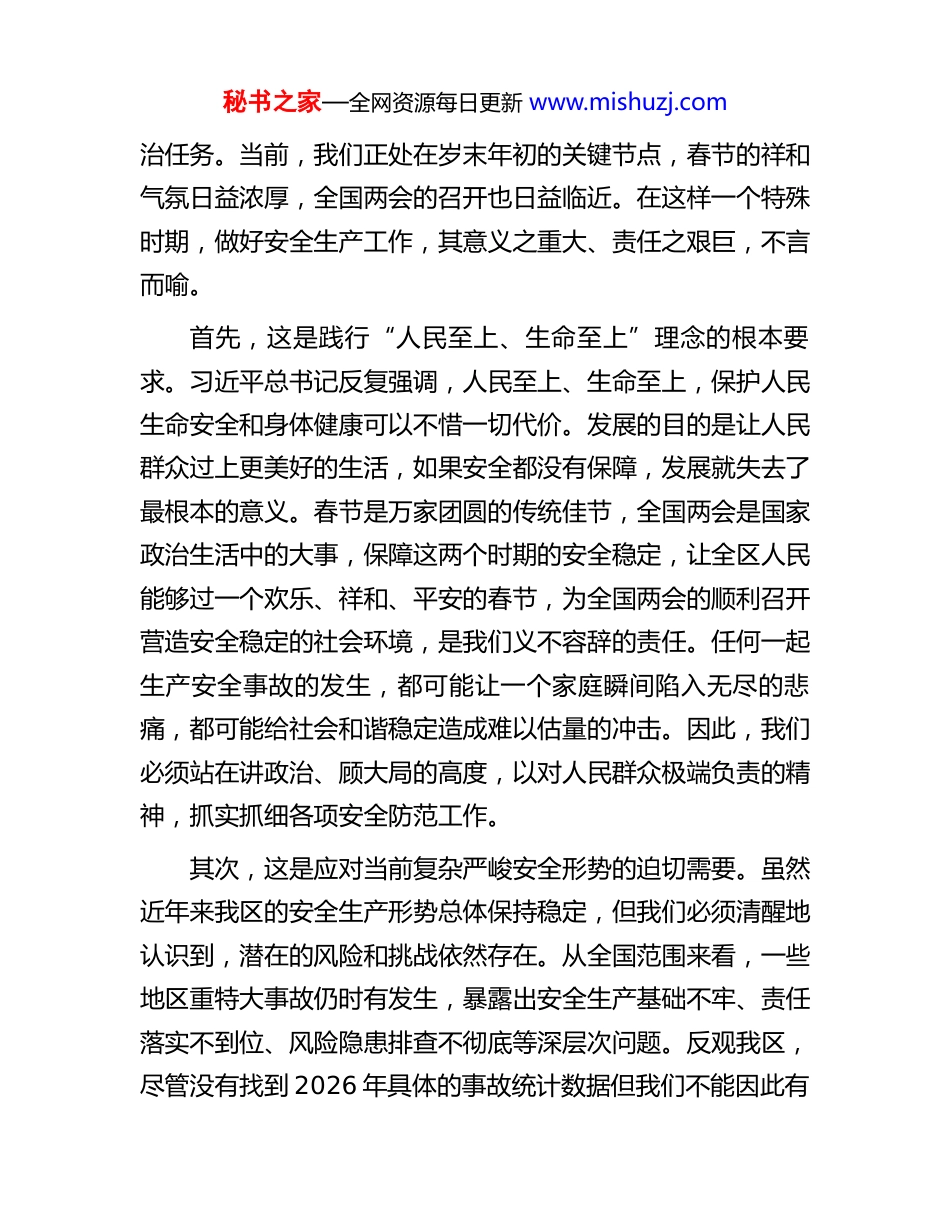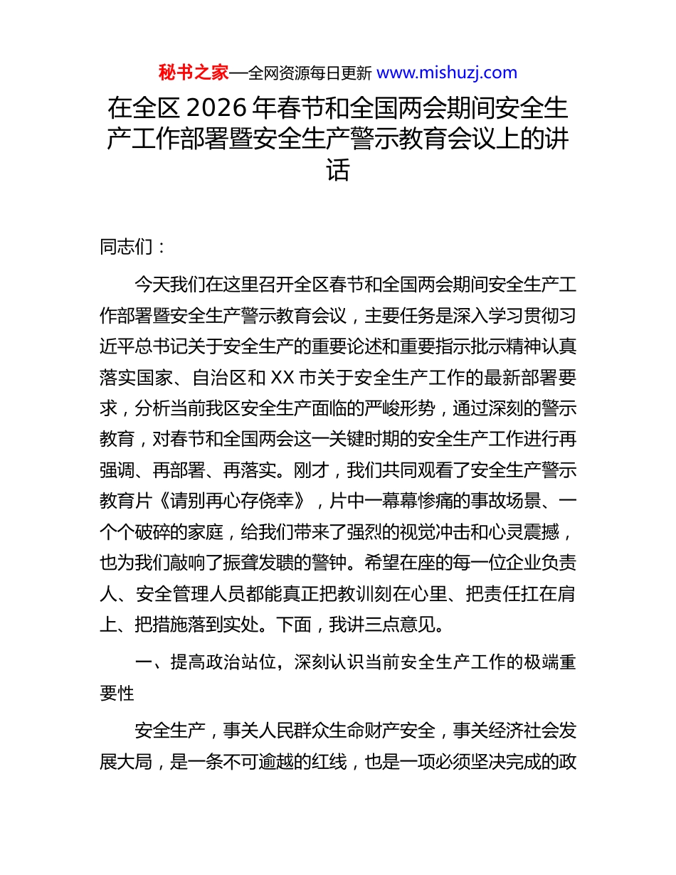 秘书之家—全网资源每日更新 www.mishuzj.com在全区 2026 年春节和全国两会期间安全生产工作部署暨安全生产警示教育会议上的讲话同志们:今天我们在这里召开全区春节和全国两会期间安全生产工作部署暨安全生产警示教育会议,主要任务是深入学习贯彻习近平总书记关于安全生产的重要论述和重要指示批示精神认真落实国家、自治区和 XX 市关于安全生产工作的最新部署要求,分析当前我区安全生产面临的严峻形势,通过深刻的警示教育,对春节和全国两会这一关键时期的安全生产工作进行再强调、再部署、再落实。刚才,我们共同观看了安全生产警示教育片《请别再心存侥幸》,片中一幕幕惨痛的事故场景、一个个破碎的家庭,给我们带来了强烈的视觉冲击和心灵震撼,也为我们敲响了振聋发聩的警钟。希望在座的每一位企业负责人、安全管理人员都能真正把教训刻在心里、把责任扛在肩上、把措施落到实处。下面,我讲三点意见。一、提高政治站位,深刻认识当前安全生产工作的极端重要性安全生产,事关人民群众生命财产安全,事关经济社会发展大局,是一条不可逾越的红线,也是一项必须坚决完成的政秘书之家—全网资源每日更新 www.mishuzj.com治任务。当前,我们正处在岁末年初的关键节点,春节的祥和气氛日益浓厚,全国两会的召开也日益临近。在这样一个特殊时期,做好安全生产工作,其意义之重大、责任之艰巨,不言而喻。首先,这是践行“人民至上、生命至上”理念的根本要求。习近平总书记反复强调,人民至上、生命至上,保护人民生命安全和身体健康可以不惜一切代价。发展的目的是让人民群众过上更美好的生活,如果安全都没有保障,发展就失去了最根本的意义。春节是万家团圆的传统佳节,全国两会是国家政治生活中的大事,保障这两个时期的安全稳定,让全区人民能够过一个欢乐、祥和、平安的春节,为全国两会的顺利召开营造安全稳定的社会环境,是我们义不容辞的责任。任何一起生产安全事故的发生,都可能让一个家庭瞬间陷入无尽的悲痛,都可能给社会和谐稳定造成难以估量的冲击。因此,我们必须站在讲政治、顾大局的高度,以对人民群众极端负责的精神,抓实抓细各项安全防范工作。其次,这是应对当前复杂严峻安全形势的迫切需要。虽然近年来我区的安全生产形势总体保持稳定,但我们必须清醒地认识到,潜在的风险和挑战依然存在。从全国范围来看,一些地区重特大事故仍时有发生,暴露出安全生产基础不牢、责任落实不到位、风险隐患排查不彻底等深层次问题。反观我区,尽管没有找到 2026 年具体的事故统计数据但我们不能因此有秘书之家—全网资源每日更新 www.mishuzj.com任何松懈。随着经济活动的全面恢复,各类生产经营活动日趋活跃,加之冬季低温、雨雪、冰冻等不利天气因素影响,诱发事故的风险点增多。特别是春节前后,一些企业为了赶工期、抢进度,容易出现超能力、超强度、超定员生产的现象;节后复工复产,又面临着员工思想松懈、设备长期停用后性能不稳定、新员工技能不熟练等一系列风险。这些新老问题交织叠加,使得当前的安全生产工作面临着前所未有的压力。我们必须始终保持“时时放心不下”的责任感和“睁眼睡觉”的警觉性,把问题想得更复杂一些,把措施准备得更周全一些。最后,这是落实安全生产责任制的法定职责。安全生产法明确规定了企业的主体责任,企业的负责人是本单位安全生产的第一责任人,对本单位的安全生产工作全面负责。这个责任是法定的、刚性的,是推卸不掉的。今天的会议,既是一次工作部署会,也是一次责任再压实会。各企业负责人必须清醒地认识到,抓安全生产不是为政府部门抓,不是为应付检查抓,而是为企业自身的可持续发展抓,为每一位员工的生命安全抓。只有真正把安全责任内化于心、外化于行,才能从根本上筑牢安全生产的防线。二、汲取事故教训,以案为鉴坚决克服麻痹思想与侥幸心理刚才我们观看的警示教育片《请别再心存侥幸》,其核心秘书之家—全网资源每日更新 www.mishuzj.com就是要警示我们,事故的发生绝非偶然,侥幸是安全生产最大的敌人。片中每一个案例,背后都是血的教训,都源于对规章制度的漠视、对安全风险的轻视和对潜在隐患的...