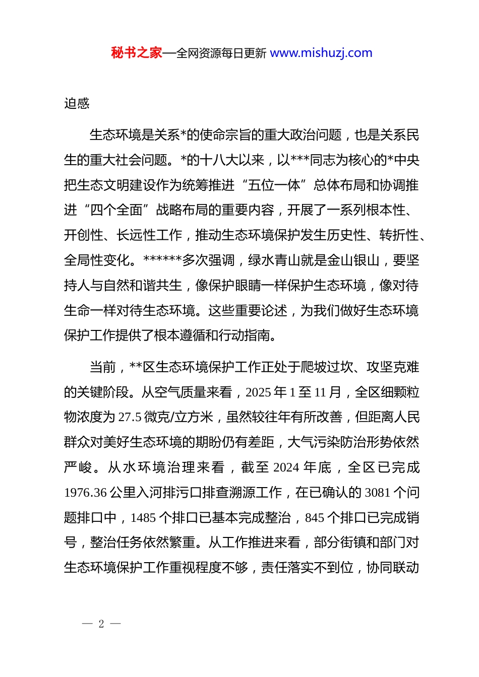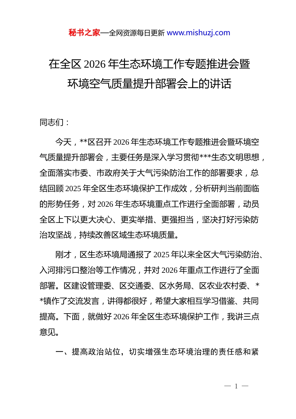 秘书之家—全网资源每日更新 www.mishuzj.com在全区 2026 年生态环境工作专题推进会暨环境空气质量提升部署会上的讲话同志们:今天,**区召开 2026 年生态环境工作专题推进会暨环境空气质量提升部署会,主要任务是深入学习贯彻***生态文明思想,全面落实市委、市政府关于大气污染防治工作的部署要求,总结回顾 2025 年全区生态环境保护工作成效,分析研判当前面临的形势任务,对 2026 年生态环境重点工作进行全面部署,动员全区上下以更大决心、更实举措、更强担当,坚决打好污染防治攻坚战,持续改善区域生态环境质量。刚才,区生态环境局通报了 2025 年以来全区大气污染防治、入河排污口整治等工作情况,并对 2026 年重点工作进行了全面部署。区建设管理委、区交通委、区水务局、区农业农村委、**镇作了交流发言,讲得都很好,希望大家相互学习借鉴、共同提高。下面,就做好 2026 年全区生态环境保护工作,我讲三点意见。一、提高政治站位,切实增强生态环境治理的责任感和紧— 1 —秘书之家—全网资源每日更新 www.mishuzj.com迫感生态环境是关系*的使命宗旨的重大政治问题,也是关系民生的重大社会问题。*的十八大以来,以***同志为核心的*中央把生态文明建设作为统筹推进“五位一体”总体布局和协调推进“四个全面”战略布局的重要内容,开展了一系列根本性、开创性、长远性工作,推动生态环境保护发生历史性、转折性、全局性变化。******多次强调,绿水青山就是金山银山,要坚持人与自然和谐共生,像保护眼睛一样保护生态环境,像对待生命一样对待生态环境。这些重要论述,为我们做好生态环境保护工作提供了根本遵循和行动指南。当前,**区生态环境保护工作正处于爬坡过坎、攻坚克难的关键阶段。从空气质量来看,2025 年 1 至 11 月,全区细颗粒物浓度为 27.5 微克/立方米,虽然较往年有所改善,但距离人民群众对美好生态环境的期盼仍有差距,大气污染防治形势依然严峻。从水环境治理来 看,截至 2024 年底,全区已完成1976.36 公里入河排污口排查溯源工作,在已确认的 3081 个问题排口中,1485 个排口已基本完成整治,845 个排口已完成销号,整治任务依然繁重。从工作推进来看,部分街镇和部门对生态环境保护工作重视程度不够,责任落实不到位,协同联动— 2 —秘书之家—全网资源每日更新 www.mishuzj.com机制不够健全,问题整改不够彻底,存在“头痛医头、脚痛医脚”的现象。面对这些问题和挑战,全区上下必须深刻认识到,生态环境保护是必须扛牢的政治责任,是回应群众期盼的民生工程,是推动转型升级的重要抓手。各级各部门要从坚定拥护“两个确立”、坚决做到“两个维护”的政治高度,深刻认识做好生态环境保护工作的极端重要性,切实把思想和行动统一到*中央、国务院和市委、市政府的决策部署上来,以高度的责任感和使命感推动各项工作落地见效。二、聚焦重点领域,精准落实各项攻坚任务2026 年是“十五五”规划的开局之年,也是深入打好污染防治攻坚战的关键之年。全区上下要锚定生态环境质量提升核心目标,坚持问题导向、目标导向、结果导向相统一,以更大力度、更实举措推进各项重点工作。第一,以全域管控为抓手,全力推进空气质量提升。大气污染防治是生态环境工作的重中之重,直接关系人民群众的切身感受。要抓实细颗粒物综合治理,紧盯工业源、移动源、社会生活源等重点领域,深化挥发性有机物和氮氧化物协同减排,— 3 —秘书之家—全网资源每日更新 www.mishuzj.com加强重点行业企业监管,推动产业结构优化升级。要强化工地扬尘管控,严格执行“六个百分之百”标准,即施工场所百分之百围蔽、工地地面百分之百硬底化、工地砂土物料百分之百覆盖、施工作业百分之百洒水除尘、出工地车辆百分之百冲净车体、长期裸土百分之百覆盖或绿化。要加大执法检查力度,对扬尘防控措施落实不到位的工地,依法依规严肃查处,坚决杜绝扬尘污染问题反复发生。要加强道路扬尘治理,提高道路机械化清扫率,落实冲洗、湿扫、雾炮三位一体作业模式,重点区域、重点路段实施精细化保洁,确保道路扬尘得到有效控制。要压实属地联防联控责...