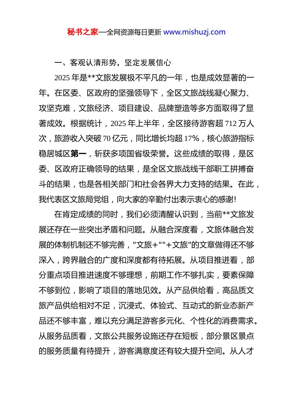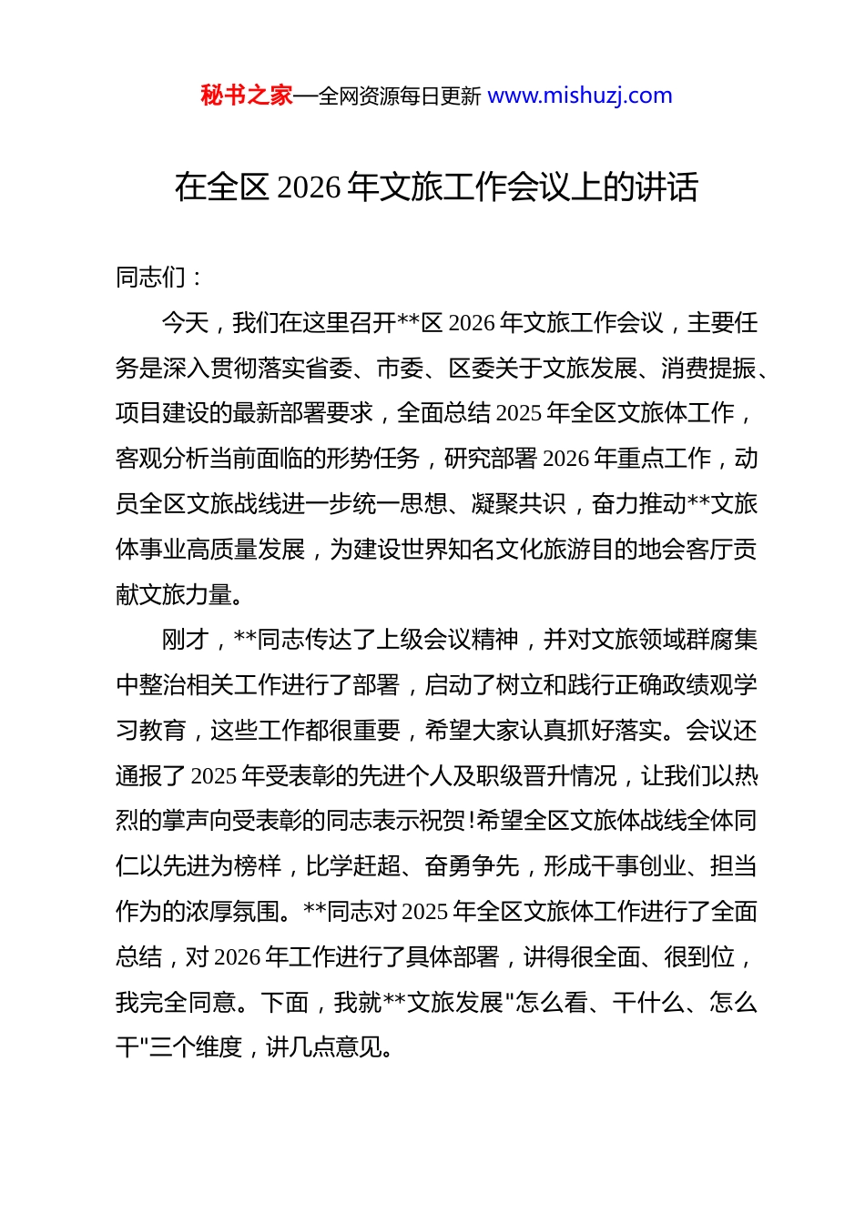 秘书之家—全网资源每日更新 www.mishuzj.com在全区 2026 年文旅工作会议上的讲话 同志们:今天,我们在这里召开**区 2026 年文旅工作会议,主要任务是深入贯彻落实省委、市委、区委关于文旅发展、消费提振、项目建设的最新部署要求,全面总结 2025 年全区文旅体工作,客观分析当前面临的形势任务,研究部署 2026 年重点工作,动员全区文旅战线进一步统一思想、凝聚共识,奋力推动**文旅体事业高质量发展,为建设世界知名文化旅游目的地会客厅贡献文旅力量。刚才,**同志传达了上级会议精神,并对文旅领域群腐集中整治相关工作进行了部署,启动了树立和践行正确政绩观学习教育,这些工作都很重要,希望大家认真抓好落实。会议还通报了 2025 年受表彰的先进个人及职级晋升情况,让我们以热烈的掌声向受表彰的同志表示祝贺!希望全区文旅体战线全体同仁以先进为榜样,比学赶超、奋勇争先,形成干事创业、担当作为的浓厚氛围。**同志对 2025 年全区文旅体工作进行了全面总结,对 2026 年工作进行了具体部署,讲得很全面、很到位,我完全同意。下面,我就**文旅发展"怎么看、干什么、怎么干"三个维度,讲几点意见。秘书之家—全网资源每日更新 www.mishuzj.com一、客观认清形势,坚定发展信心2025 年是**文旅发展极不平凡的一年,也是成效显著的一年。在区委、区政府的坚强领导下,全区文旅战线凝心聚力、攻坚克难,文旅经济、项目建设、品牌塑造等多方面取得了显著成效。根据统计,2025 年上半年,全区接待游客超 712 万人次,旅游收入突破 70 亿元,同比增长均超 17%,核心旅游指标稳居城区第一,斩获多项国省级荣誉。这些成绩的取得,是区委、区政府正确领导的结果,是全区文旅战线干部职工拼搏奋斗的结果,也是各相关部门和社会各界大力支持的结果。在此,我代表区文旅局党组,向大家的辛勤付出表示衷心的感谢!在肯定成绩的同时,我们必须清醒认识到,当前**文旅发展还存在一些突出矛盾和问题。从融合深度看,文旅体融合发展的体制机制还不够完善,"文旅+""+文旅"的文章做得还不够深入,跨界融合的广度和深度都有待拓展。从项目推进看,部分重点项目推进速度不够理想,前期工作不够扎实,要素保障不够到位,影响了项目的落地见效。从产品供给看,高品质文旅产品供给相对不足,沉浸式、体验式、互动式的新业态新产品还不够丰富,难以充分满足游客多元化、个性化的消费需求。从服务品质看,文旅公共服务设施还存在短板,部分景区景点的服务质量有待提升,游客满意度还有较大提升空间。从人才秘书之家—全网资源每日更新 www.mishuzj.com队伍看,专业人才总量不足、结构不优的问题比较突出,高端策划人才、运营管理人才、专业技术人才都比较紧缺。这些问题和不足,既是我们工作的差距所在,也是我们发展的潜力所在。我们要正视问题、直面挑战,以更强的责任担当、更实的工作举措,推动问题解决、短板补齐。同时,我们也要看到,**文旅发展正面临难得的历史机遇。从宏观层面看,国家把恢复和扩大消费摆在优先位置,文旅消费作为消费的重要组成部分,迎来了前所未有的政策机遇。省委、省政府把文旅产业作为万亿级支柱产业重点培育,出台了一系列支持文旅发展的政策措施。市委、市政府提出建设世界旅游名城的战略目标,为我们指明了发展方向。从自身条件看,**区位优势明显、交通便捷,自然山水与城市景观交相辉映,历史文化与现代文明融合发展,具有发展文旅产业的独特优势。特别是近年来,我们持续推进文旅项目建设,不断完善公共服务体系,积累了较为扎实的工作基础。我们要坚定发展信心,抢抓发展机遇,以更加昂扬的斗志、更加务实的作风,推动**文旅发展再上新台阶。二、聚焦三大方向,抓实重点工作做好 2026 年文旅工作,要聚焦"文旅事业向群众聚焦、文旅产业为发展赋能、文旅市场获游客认可"三大核心方向,围秘书之家—全网资源每日更新 www.mishuzj.com绕"项目攻坚、业态创新、活动引流、品牌塑造、安全规范"五大核心,扎实推进各项工作。(一)深入实施项目攻坚行动,夯实文旅发展基础项目是文旅发展的"牛鼻子"。我们要把项目建设摆在更加突出的位置...