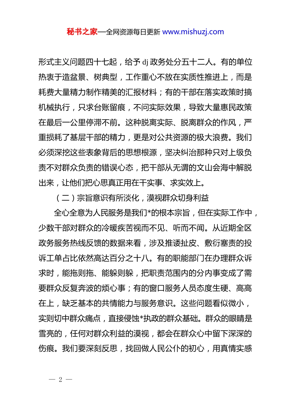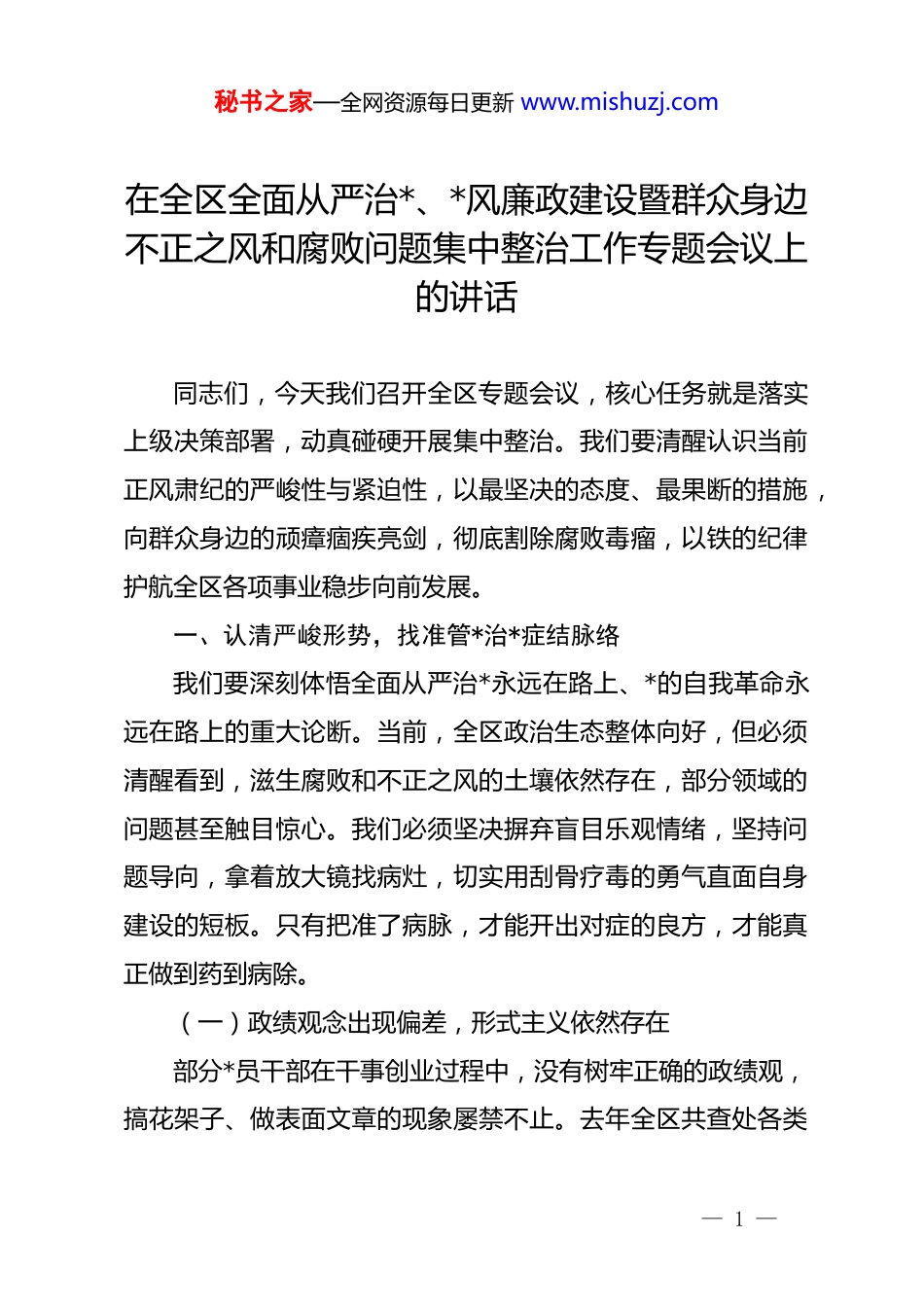 秘书之家—全网资源每日更新 www.mishuzj.com在全区全面从严治*、*风廉政建设暨群众身边不正之风和腐败问题集中整治工作专题会议上的讲话同志们,今天我们召开全区专题会议,核心任务就是落实上级决策部署,动真碰硬开展集中整治。我们要清醒认识当前正风肃纪的严峻性与紧迫性,以最坚决的态度、最果断的措施,向群众身边的顽瘴痼疾亮剑,彻底割除腐败毒瘤,以铁的纪律护航全区各项事业稳步向前发展。一、认清严峻形势,找准管*治*症结脉络我们要深刻体悟全面从严治*永远在路上、*的自我革命永远在路上的重大论断。当前,全区政治生态整体向好,但必须清醒看到,滋生腐败和不正之风的土壤依然存在,部分领域的问题甚至触目惊心。我们必须坚决摒弃盲目乐观情绪,坚持问题导向,拿着放大镜找病灶,切实用刮骨疗毒的勇气直面自身建设的短板。只有把准了病脉,才能开出对症的良方,才能真正做到药到病除。(一)政绩观念出现偏差,形式主义依然存在部分*员干部在干事创业过程中,没有树牢正确的政绩观,搞花架子、做表面文章的现象屡禁不止。去年全区共查处各类— 1 —秘书之家—全网资源每日更新 www.mishuzj.com形式主义问题四十七起,给予 dj 政务处分五十二人。有的单位热衷于造盆景、树典型,工作重心不放在实质性推进上,而是耗费大量精力制作精美的汇报材料;有的干部在落实政策时搞机械执行,只求台账留痕,不问实际效果,导致大量惠民政策在最后一公里停滞不前。这种脱离实际、脱离群众的作风,严重损耗了基层干部的精力,更是对公共资源的极大浪费。我们必须深挖这些表象背后的思想根源,坚决纠治那种只对上级负责不对群众负责的错误心态,把干部从无谓的文山会海中解脱出来,让他们把心思真正用在干实事、求实效上。(二)宗旨意识有所淡化,漠视群众切身利益全心全意为人民服务是我们*的根本宗旨,但在实际工作中,少数干部对群众的冷暖疾苦视而不见、听而不闻。从近期全区政务服务热线反馈的数据来看,涉及推诿扯皮、敷衍塞责的投诉工单占比依然高达百分之十八。有的职能部门在办理群众诉求时,能拖则拖、能躲则躲,把职责范围内的分内事变成了需要群众反复奔波的烦心事;有的窗口服务人员态度生硬、高高在上,缺乏基本的共情能力与服务意识。这些问题看似微小,实则切中群众痛点,直接侵蚀*执政的群众基础。群众的眼睛是雪亮的,任何对群众利益的漠视,都会在群众心中留下深深的伤痕。我们要深刻反思,找回做人民公仆的初心,用真情实感— 2 —秘书之家—全网资源每日更新 www.mishuzj.com去化解群众的急难愁盼。(三)纪法敬畏明显不足,隐性腐败暗流涌动随着反腐败斗争的不断深入,明目张胆的违纪违法行为得到了有效遏制,但腐败手段也在不断翻新升级,呈现出更加隐蔽、更加复杂的特征。去年我们查结的违规收送礼品礼金案件中,通过电子红包、快递物流收送财物的隐形变异问题占比达到了百分之六十五。有的干部与商人老板称兄道弟,搞权钱交易的期权腐败,退休后再去指定企业兑现利益;有的以合法合规的商业行为作掩护,通过代持股份、虚假借贷等方式谋取私利。这些隐性腐败不仅规避了传统的监督手段,更助长了侥幸心理。这就要求我们必须魔高一尺道高一丈,不断提升发现问题的能力,揭开隐身衣,刺破伪装网,让一切违纪违法行为无所遁形,彻底打消部分干部的侥幸心理。二、聚焦重点领域,坚决斩断基层利益链条群众身边的不正之风和腐败问题,直接啃食人民群众的获得感,是基层治理的致命毒药。我们要坚持靶向治疗,将有限的监督力量集中到问题最突出、群众反映最强烈的重点领域,实施精准打击。通过深挖彻查、重拳出击,彻底斩断伸向群众利益的黑手,用实际战果回应群众期盼。(一)紧盯民生资金管理,严查贪污侵占行为— 3 —秘书之家—全网资源每日更新 www.mishuzj.com民生资金是群众的救命钱,是保障社会公平底线的关键资源。我们要将监督探头直接架设到民生资金分配、拨付、使用的全过程。重点围绕教育医疗、养老社保、就业创业、社会救助等领域的专项资金开展拉网式排查。绝不容忍任何形式的虚报冒领、截留挪用、克扣侵占。前期我们在低保资金专项审...