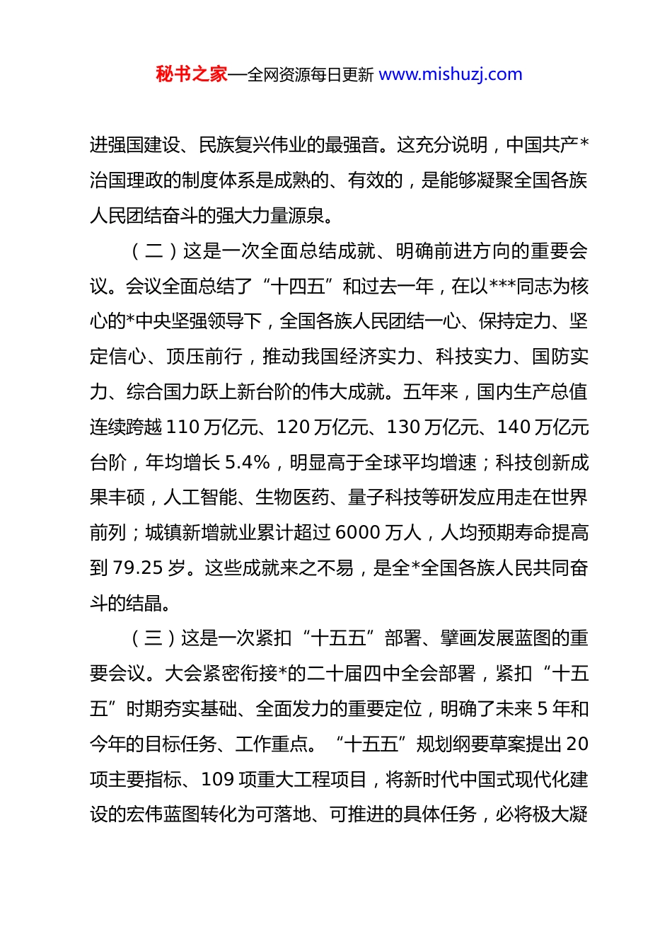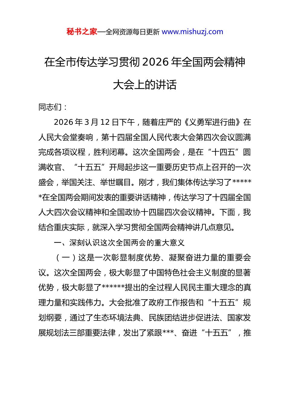 秘书之家—全网资源每日更新 www.mishuzj.com在全市传达学习贯彻 2026 年全国两会精神大会上的讲话同志们:2026 年 3 月 12 日下午,随着庄严的《义勇军进行曲》在人民大会堂奏响,第十四届全国人民代表大会第四次会议圆满完成各项议程,胜利闭幕。这次全国两会,是在“十四五”圆满收官、“十五五”开局起步这一重要历史节点上召开的一次盛会,举国关注、举世瞩目。刚才,我们集体传达学习了******在全国两会期间发表的重要讲话精神,传达学习了十四届全国人大四次会议精神和全国政协十四届四次会议精神。下面,我结合重庆实际,就深入学习贯彻全国两会精神讲几点意见。一、深刻认识这次全国两会的重大意义(一)这是一次彰显制度优势、凝聚奋进力量的重要会议。这次全国两会,极大彰显了中国特色社会主义制度的显著优势,极大彰显了******提出的全过程人民民主重大理念的真理力量和实践伟力。大会批准了政府工作报告和“十五五”规划纲要,通过了生态环境法典、民族团结进步促进法、国家发展规划法三部重要法律,发出了紧跟***、奋进“十五五”,推秘书之家—全网资源每日更新 www.mishuzj.com进强国建设、民族复兴伟业的最强音。这充分说明,中国共产*治国理政的制度体系是成熟的、有效的,是能够凝聚全国各族人民团结奋斗的强大力量源泉。(二)这是一次全面总结成就、明确前进方向的重要会议。会议全面总结了“十四五”和过去一年,在以***同志为核心的*中央坚强领导下,全国各族人民团结一心、保持定力、坚定信心、顶压前行,推动我国经济实力、科技实力、国防实力、综合国力跃上新台阶的伟大成就。五年来,国内生产总值连续跨越 110 万亿元、120 万亿元、130 万亿元、140 万亿元台阶,年均增长 5.4%,明显高于全球平均增速;科技创新成果丰硕,人工智能、生物医药、量子科技等研发应用走在世界前列;城镇新增就业累计超过 6000 万人,人均预期寿命提高到 79.25 岁。这些成就来之不易,是全*全国各族人民共同奋斗的结晶。(三)这是一次紧扣“十五五”部署、擘画发展蓝图的重要会议。大会紧密衔接*的二十届四中全会部署,紧扣“十五五”时期夯实基础、全面发力的重要定位,明确了未来 5 年和今年的目标任务、工作重点。“十五五”规划纲要草案提出 20项主要指标、109 项重大工程项目,将新时代中国式现代化建设的宏伟蓝图转化为可落地、可推进的具体任务,必将极大凝秘书之家—全网资源每日更新 www.mishuzj.com聚社会共识、坚定各界信心、广泛团结力量,纵深推动中国式现代化一张蓝图绘到底。二、深刻领会******重要讲话的核心要义******在全国两会期间发表的重要讲话,立足当前国内国际形势,着眼“十五五”良好开局,就事关中国式现代化建设全局的重大问题进行了深刻阐述,为我们准确识变、科学应变、主动求变指明了方向。全市上下要认真学习领会,做到真学真懂真信真用。(一)深刻把握“十四五”时期取得的非凡成就和当前国内国际形势。******指出,完成“十五五”经济社会发展目标任务,需要应对更加复杂的环境、解决更多深层次矛盾。当前,外部环境变化影响加深,地缘政治风险持续上升,世界经济动能疲弱,单边主义、保护主义陡然升级。国内经济深刻转型,深层次结构性矛盾问题持续显现。面对这样的形势,我们既要看到困难挑战,更要看到我国经济长期向好的支撑条件和基本趋势没有改变,制度优势和大国优势不断彰显。要坚持把工作重心放在练好内功、做强自身上,坚定不移办好自己的事,确保在惊涛骇浪中始终立于不败之地。(二)深刻把握“十五五”时期和 2026 年目标任务。******强调,“好规划和执行力,这两条要结合起来”,深刻揭示秘书之家—全网资源每日更新 www.mishuzj.com了制定实施五年规划的长期实践经验。“十五五”时期是基本实现社会主义现代化夯实基础、全面发力的关键时期,今年经济增长目标定为 4.5%至 5%,体现了积极而务实的取向。我们要准确把握“十五五”时期经济社会发展的指导思想、重要原则、目标任务、政策举措,扎实有效做好各项工作,努力实现“十五五”良好开局,一步一步把宏伟愿景变成美好现实。(三)深...